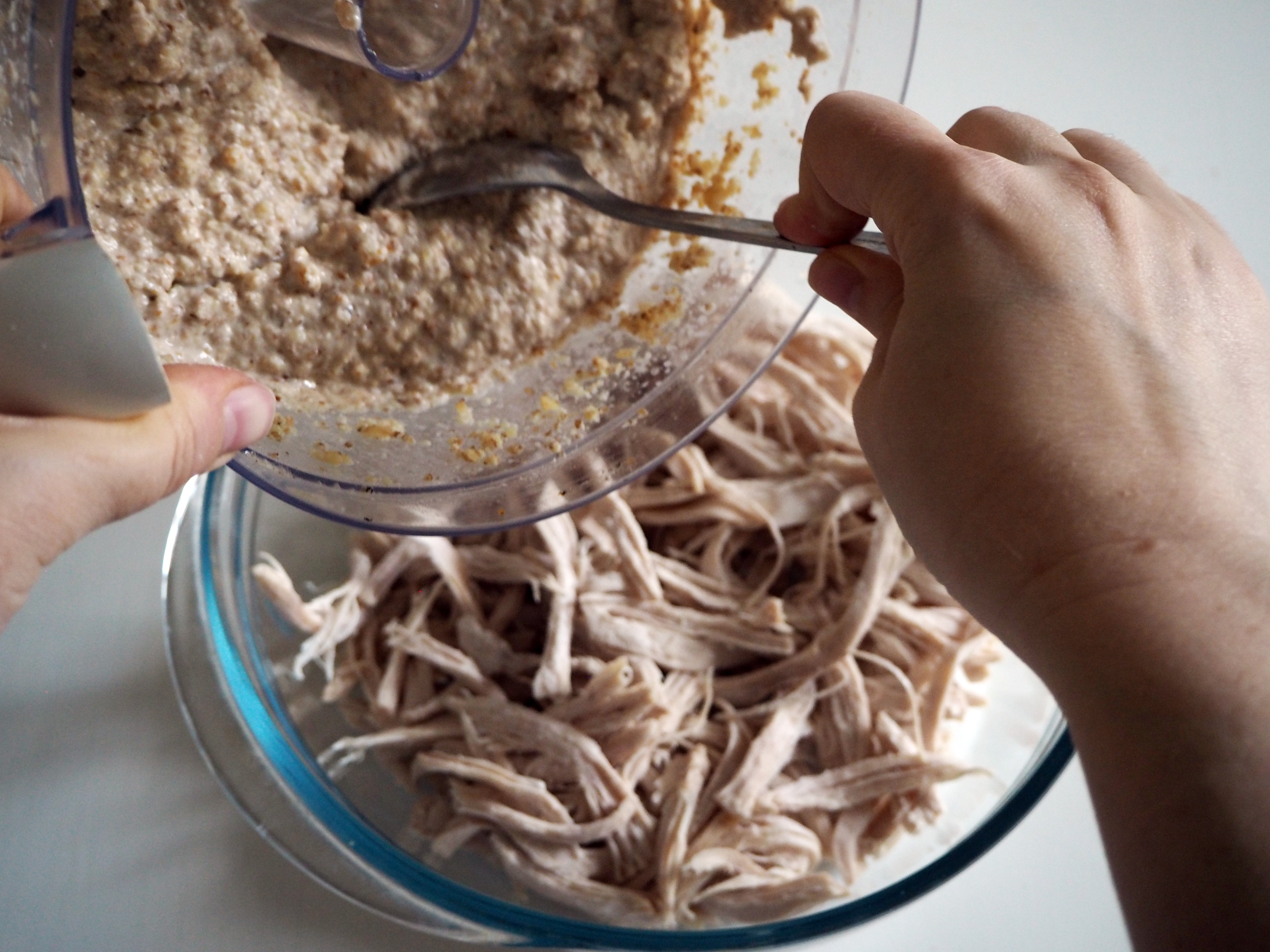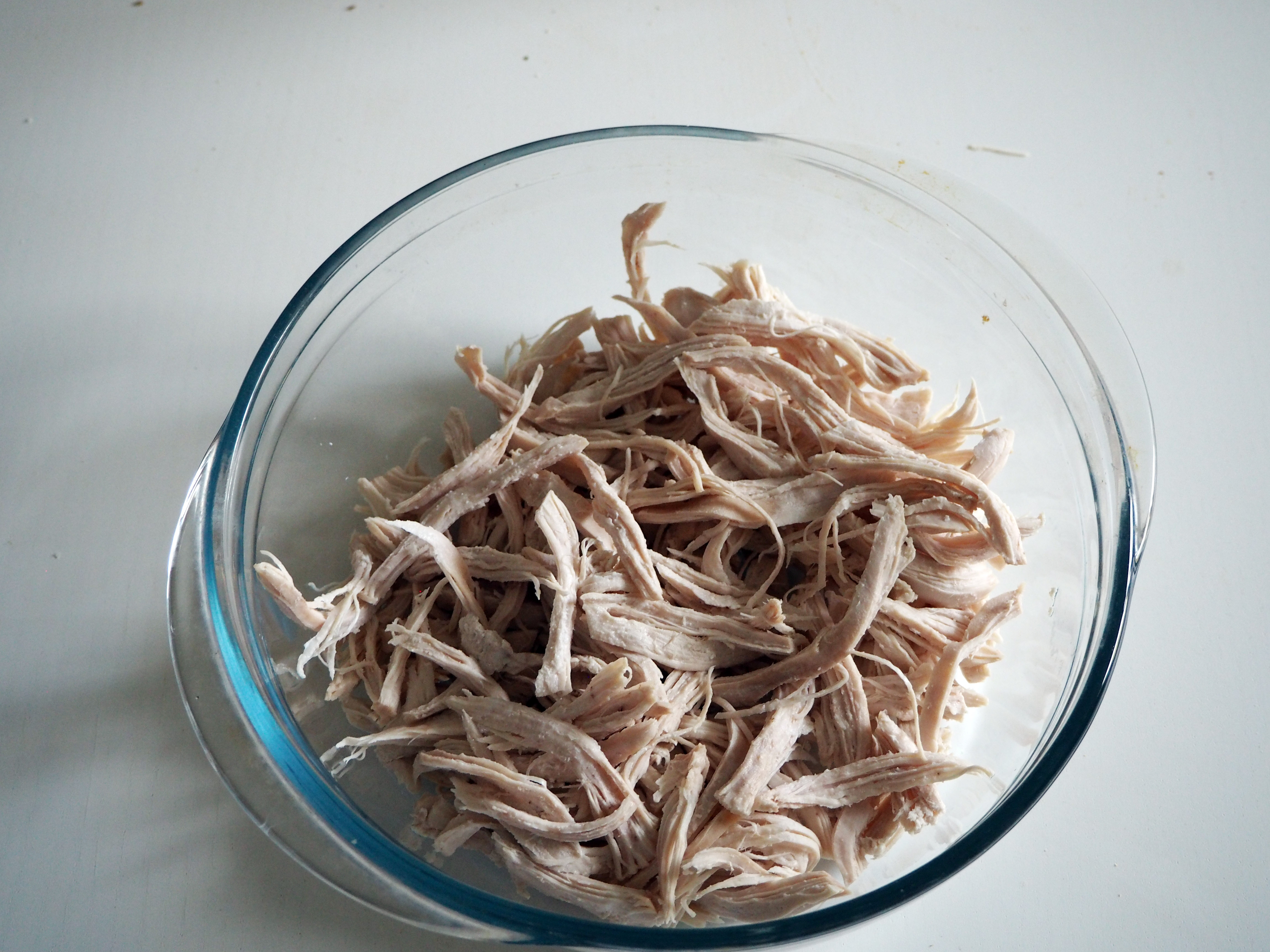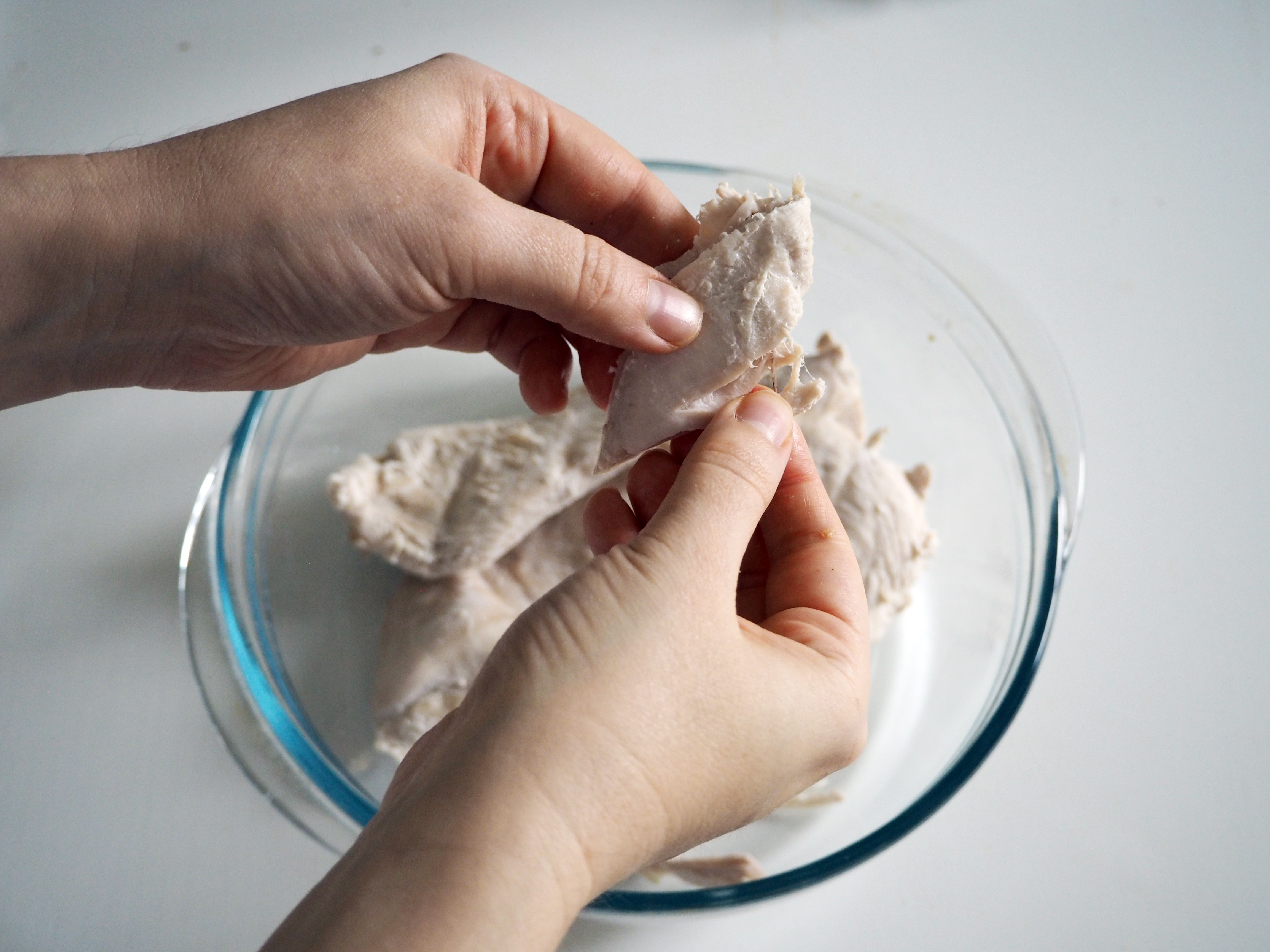 5. When chicken is cooled, shred it into smaller pieces as seen in the picture.