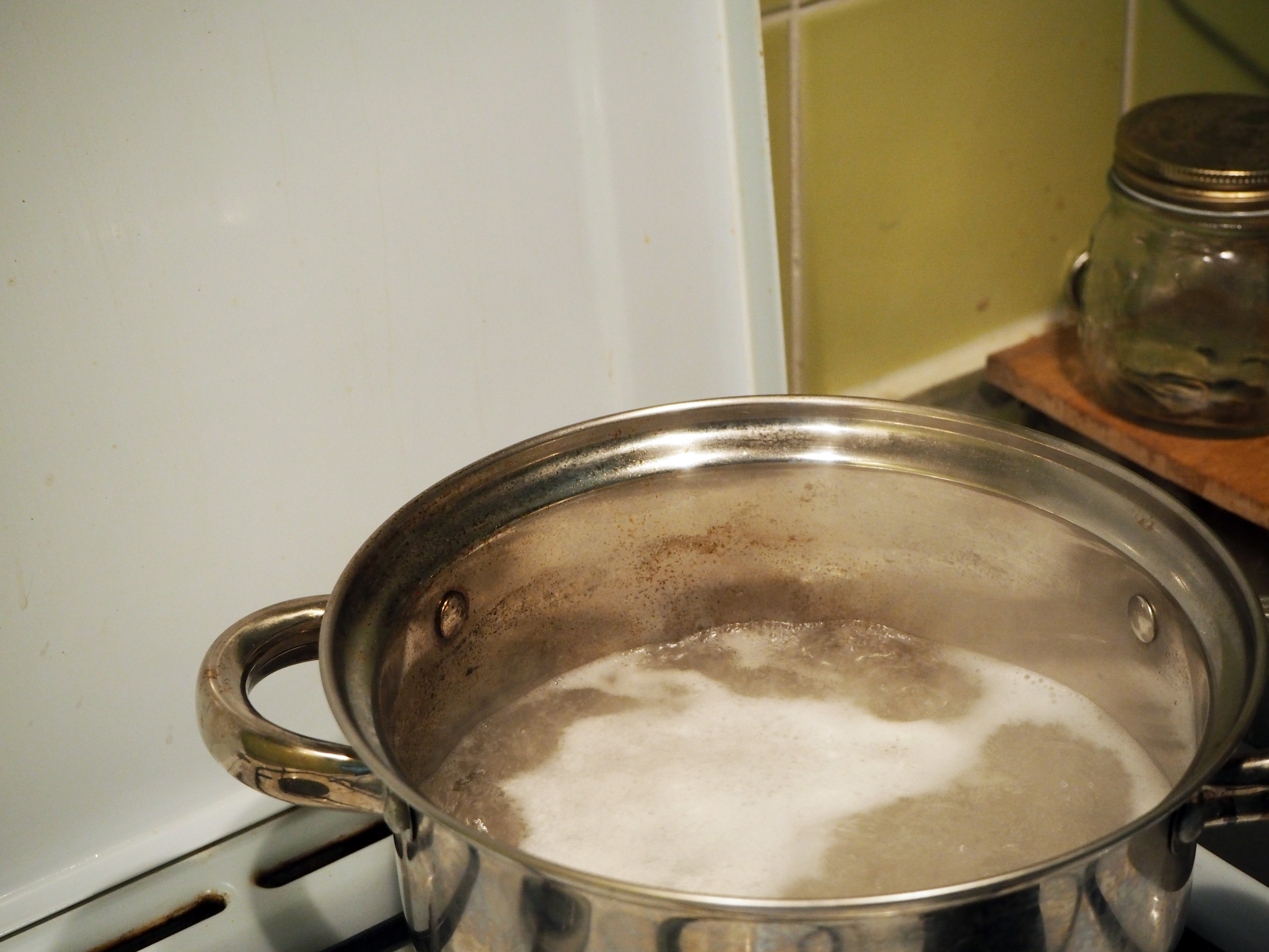 7. Now comes polenta. You can make Circassian chicken a bit earlier than service, but polenta is better cooked right before serving because it thickens up rather easily and it is not so nice after a couple of hours (at least, for my taste..). So, in a medium pan, put 4 cups of water and 1 tsp salt. I used the remaining water from boiling the chicken and added more water to make 4 cups. You can do the same or you can use plain water only. Bring the salted water to a boil on medium high heat.