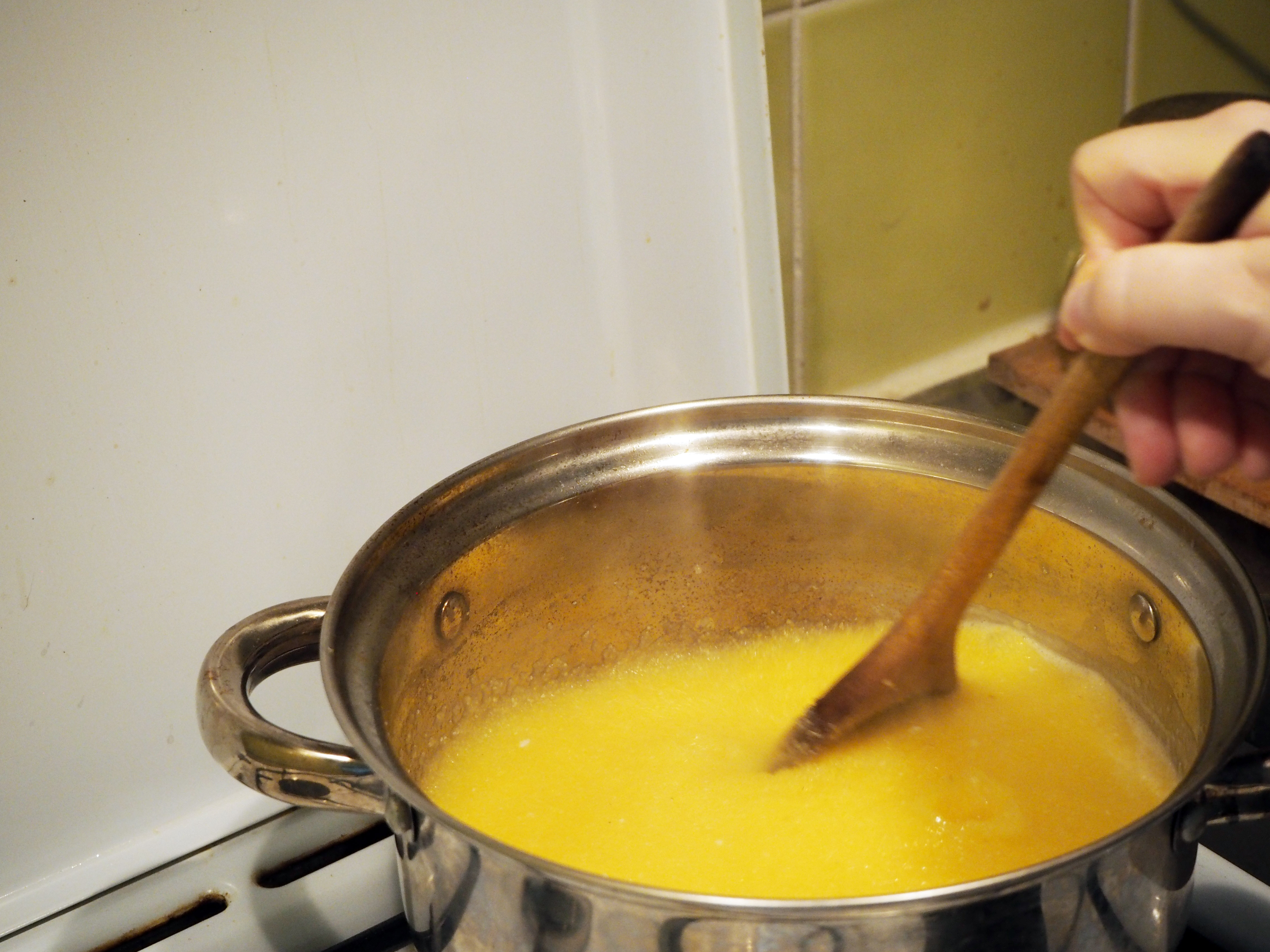 8. When the water is boiling, lower the heat to medium, add polenta while continuously whisking.