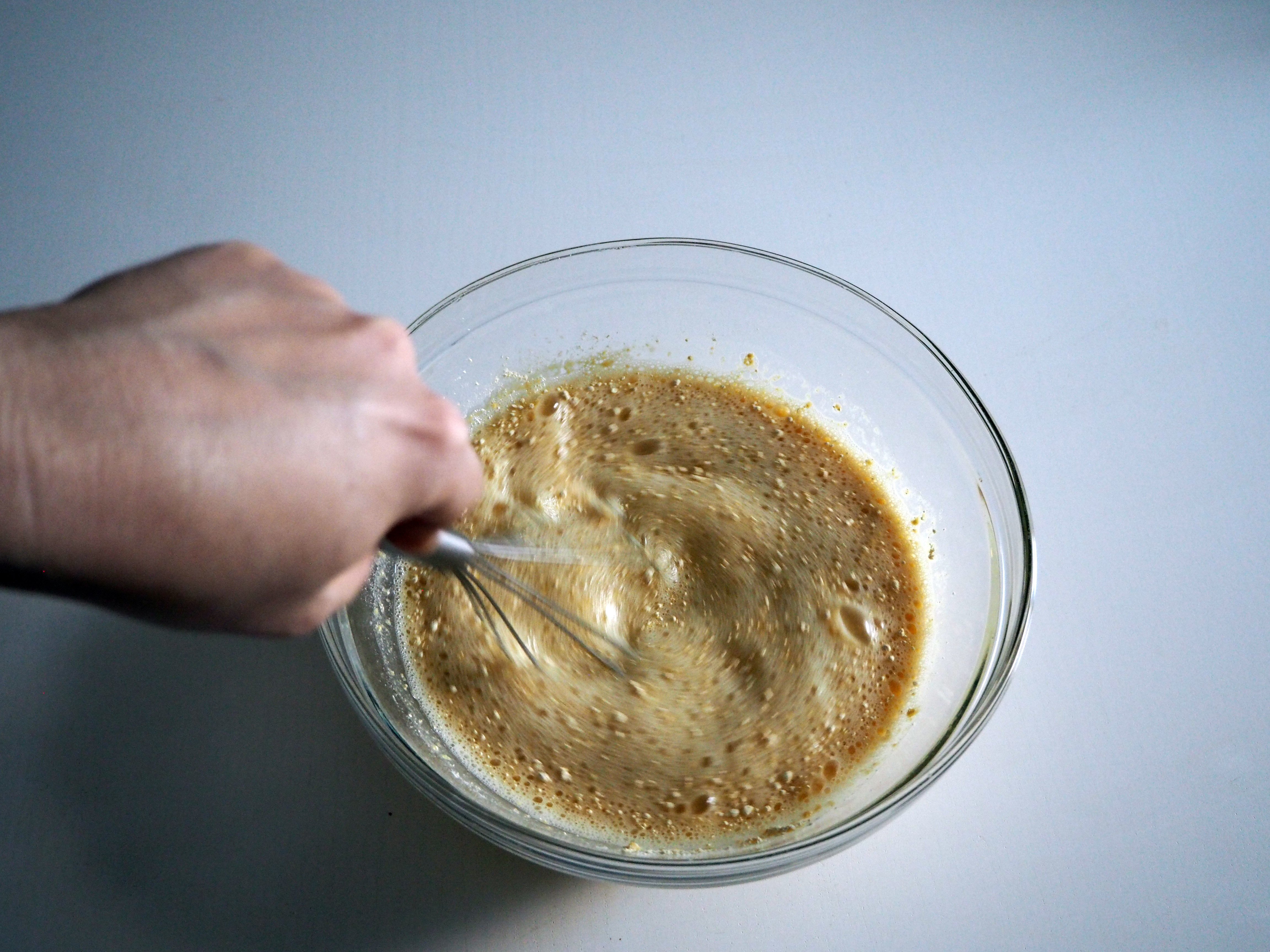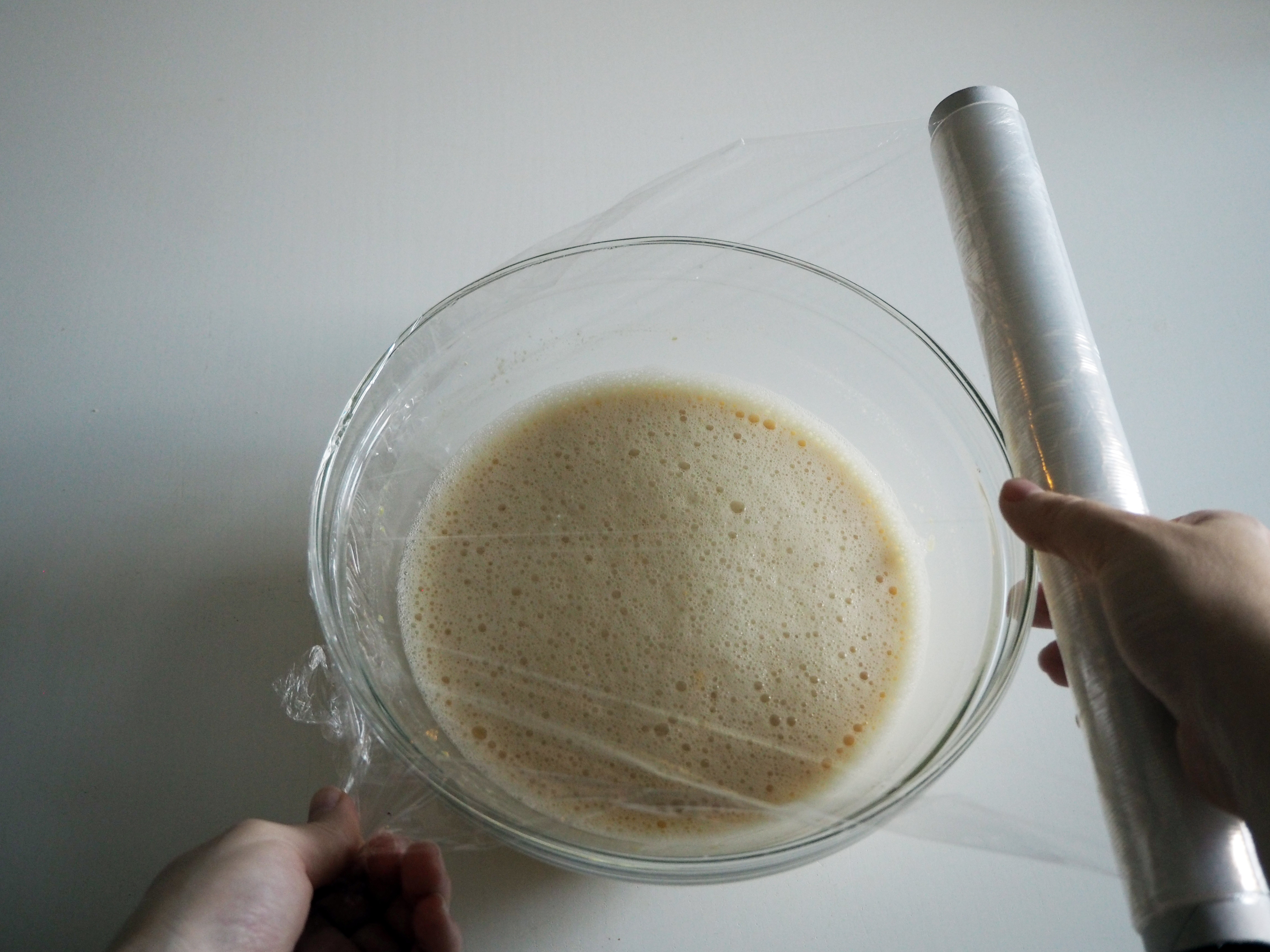2. After 2 (or more) hours, take out the stretch film. You’ll see that there will a layer of foam on top. Take this foam away using a spoon, then give it one quick whisk in case the water and flour separated a bit.