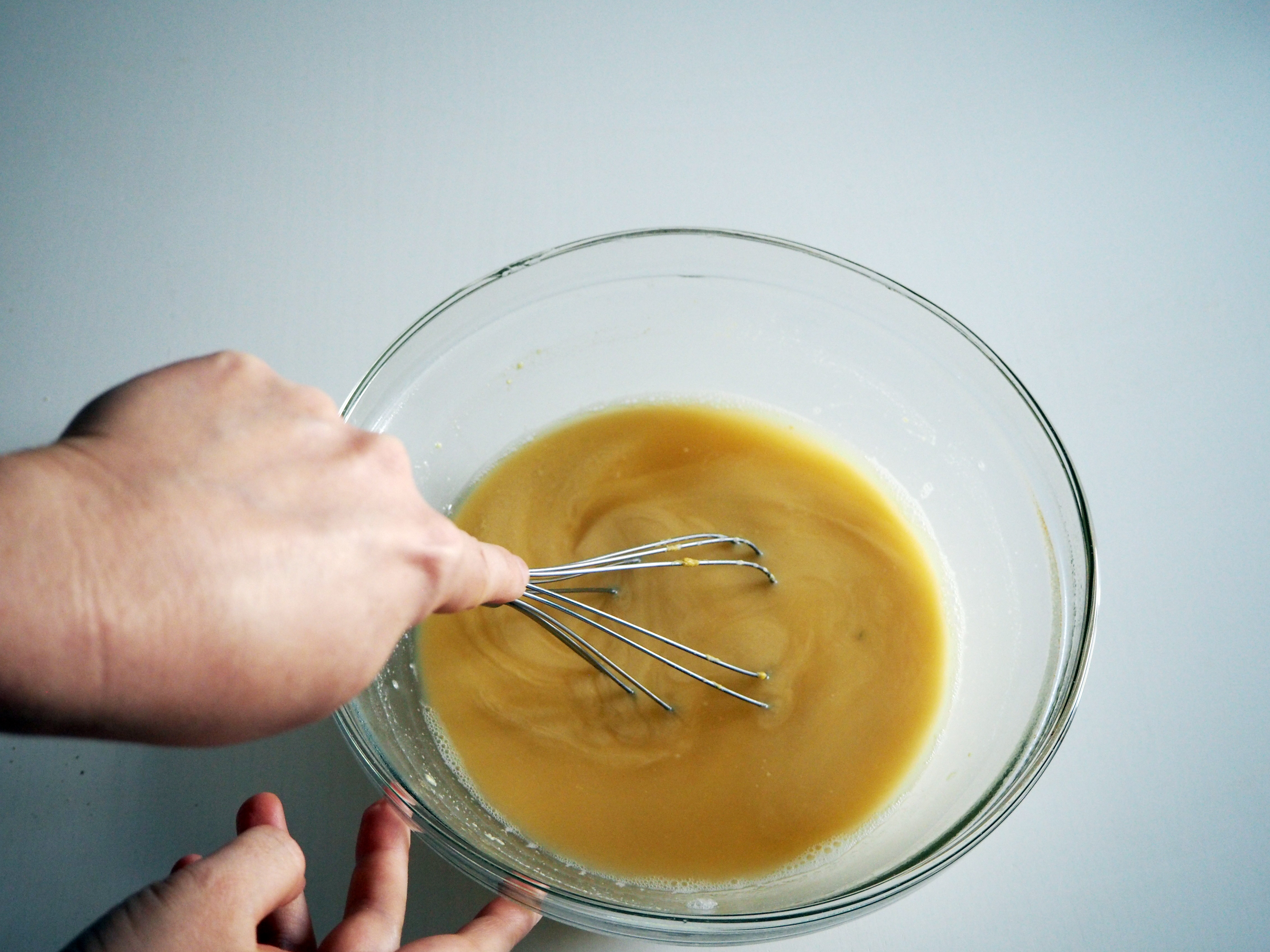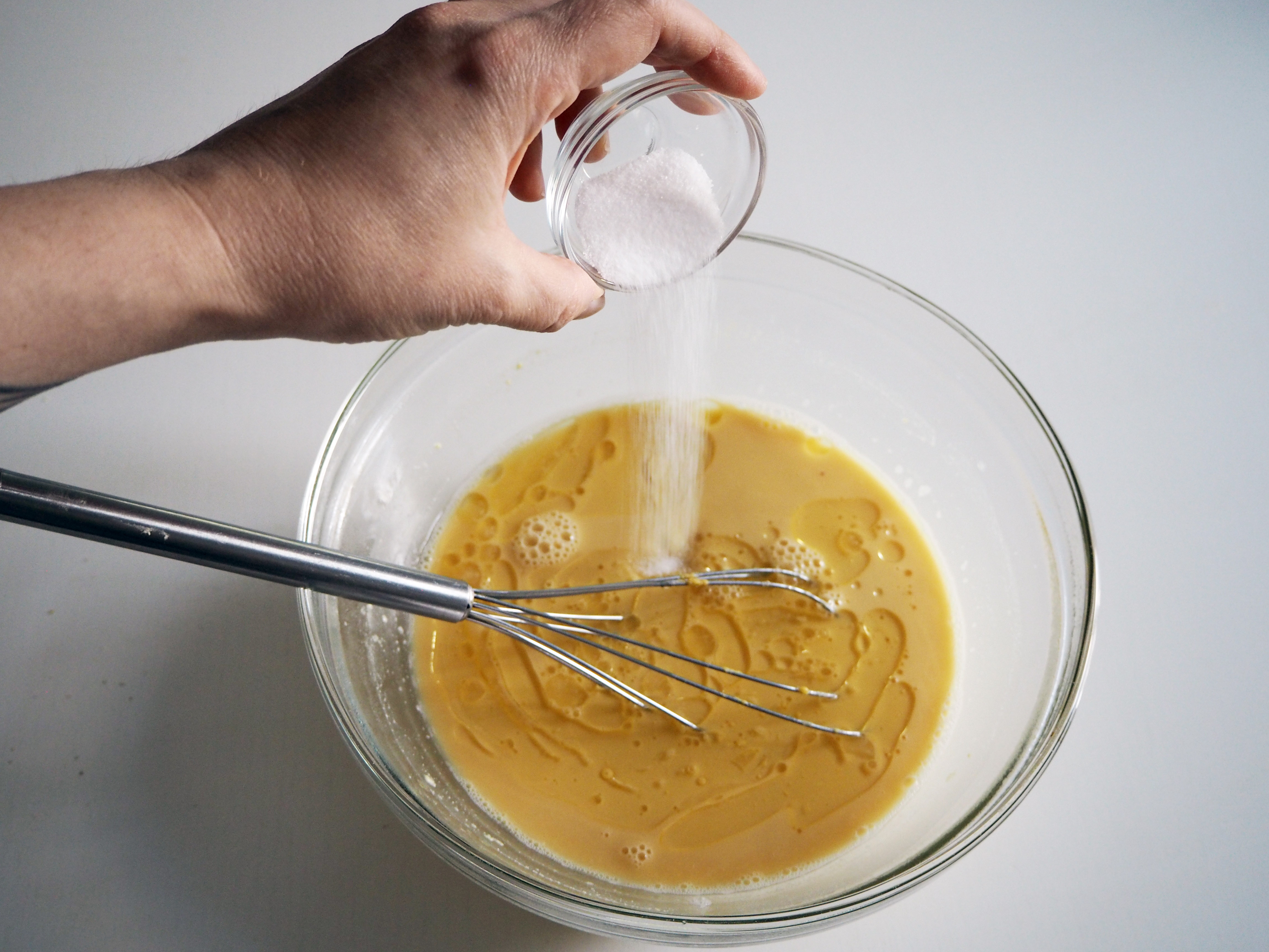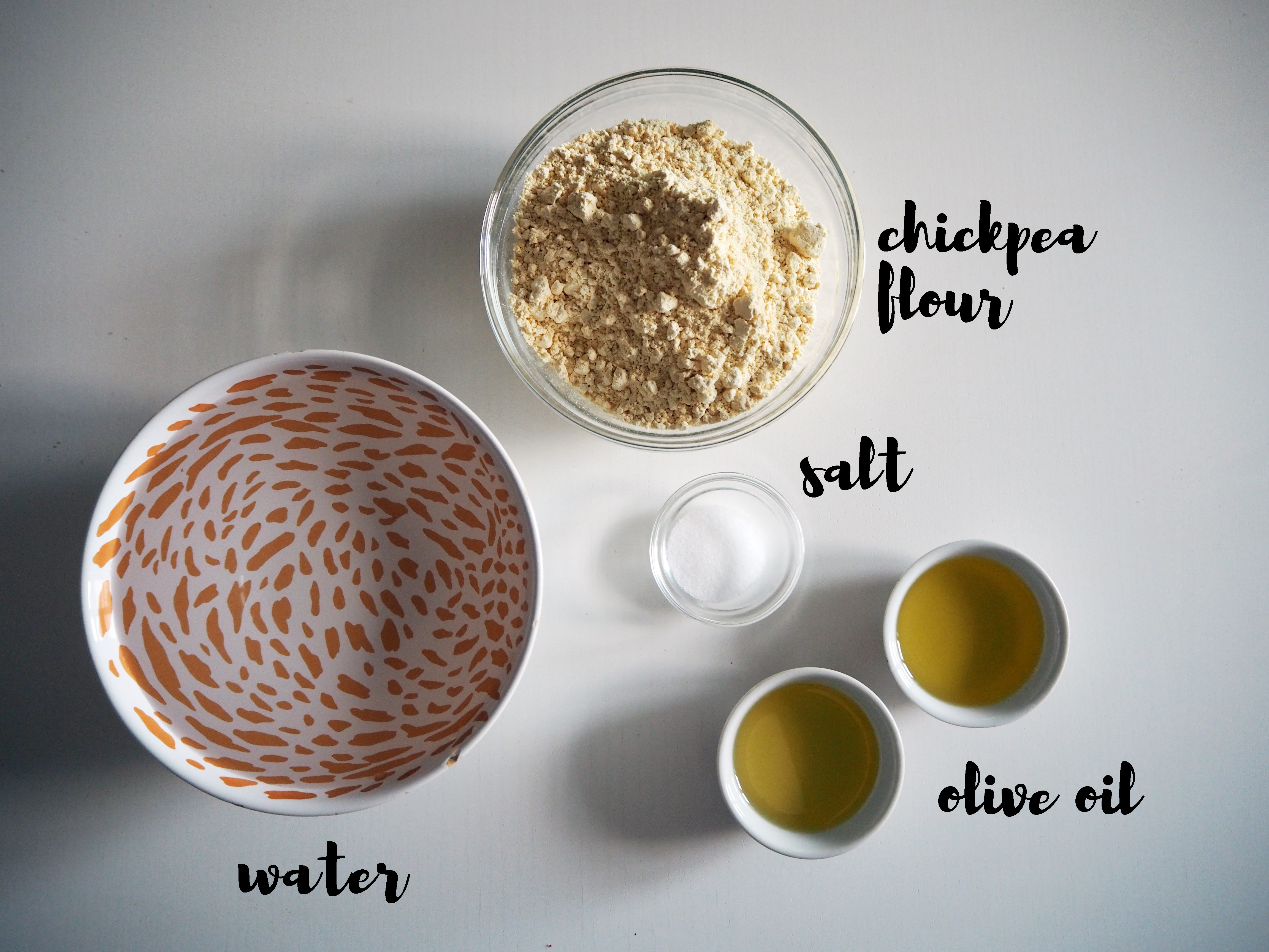 1. In a medium bowl, put chickpea flour and pour water. Whisk it really well. Cover with a stretch film and let it sit for at least 2 hours in room temperature (up to 4 hours).