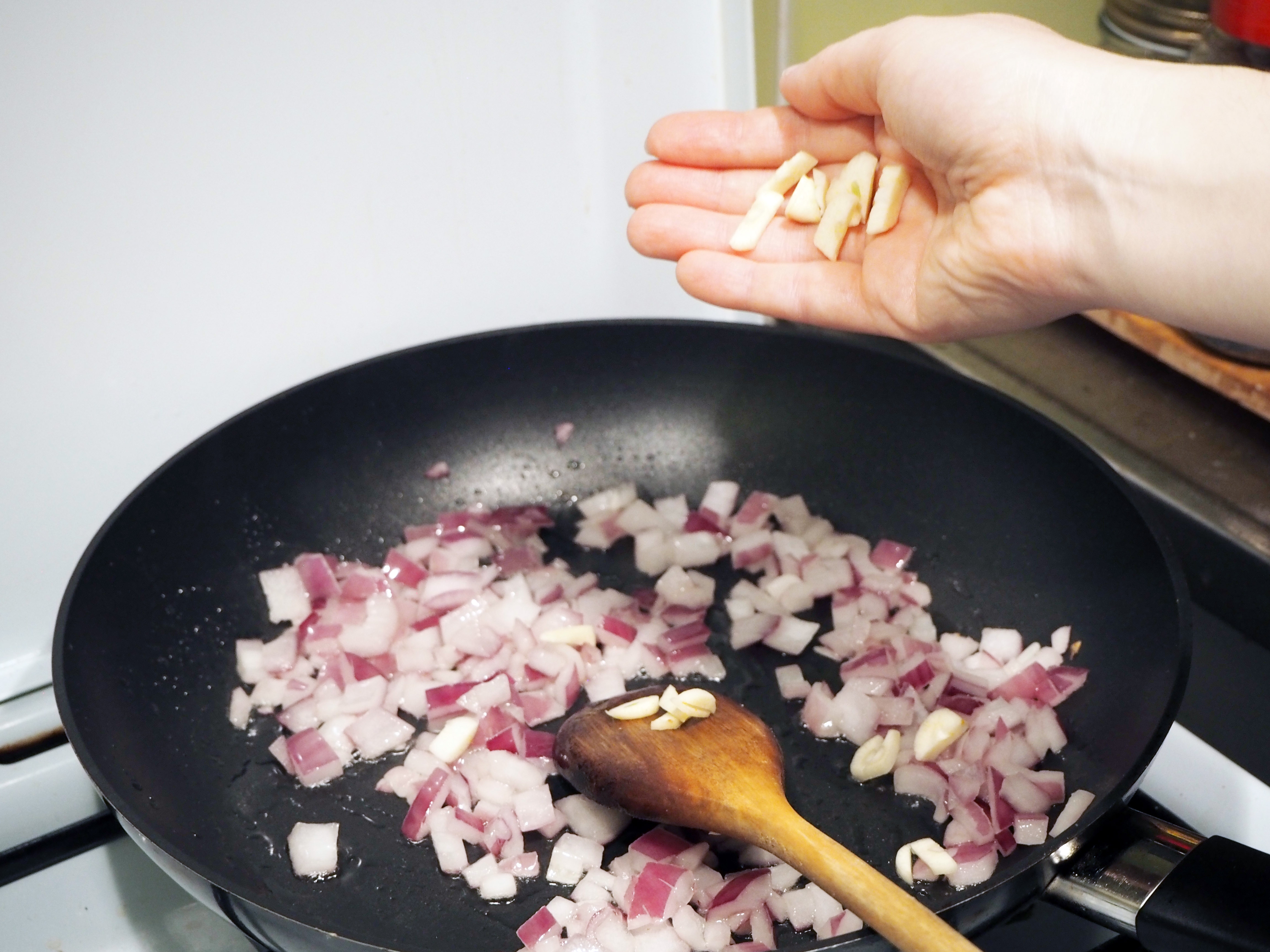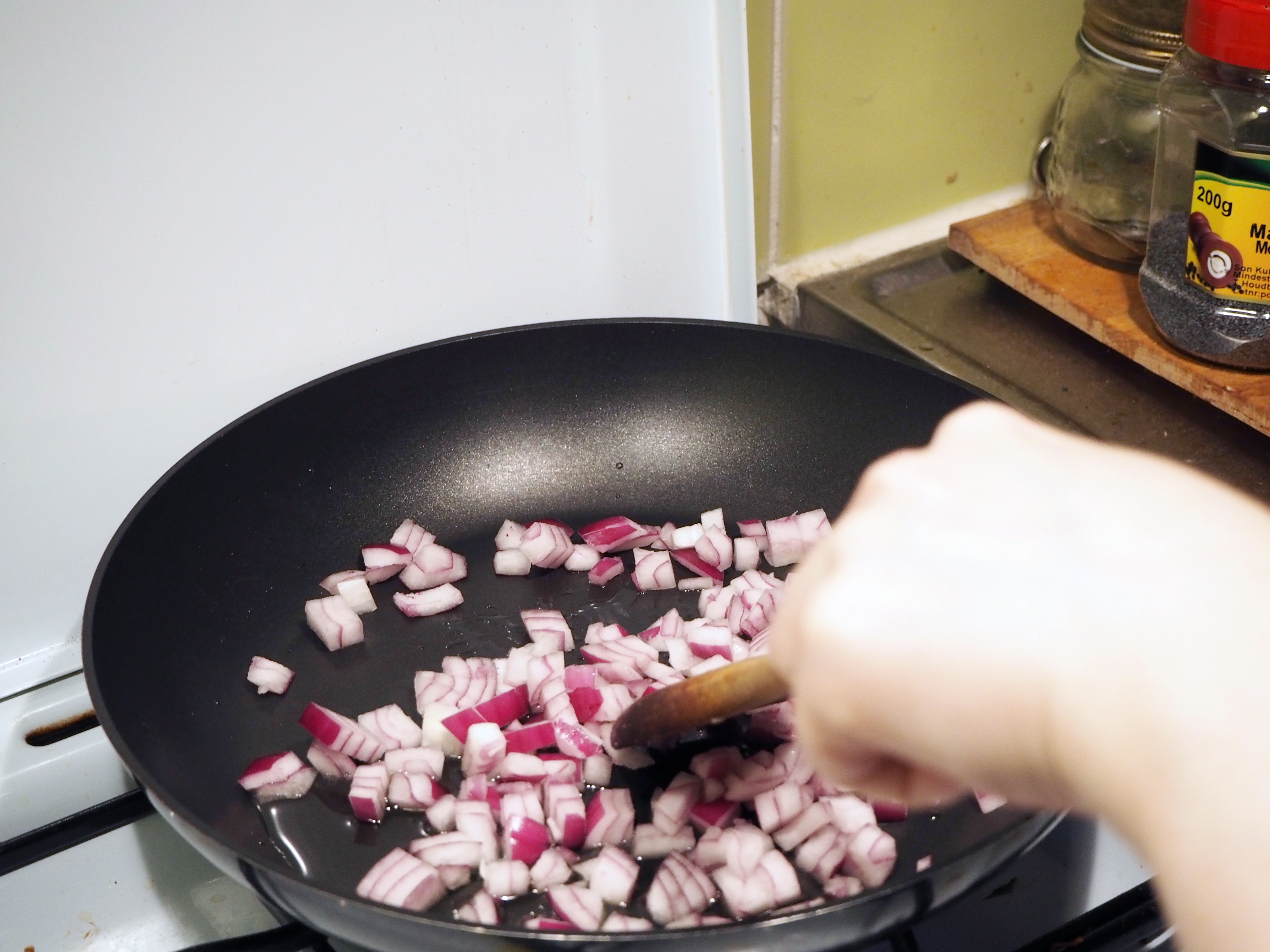 9. In a medium pan, put a generous splash of olive oil in medium heat for about a minute. Saute the onion until it is translucent.