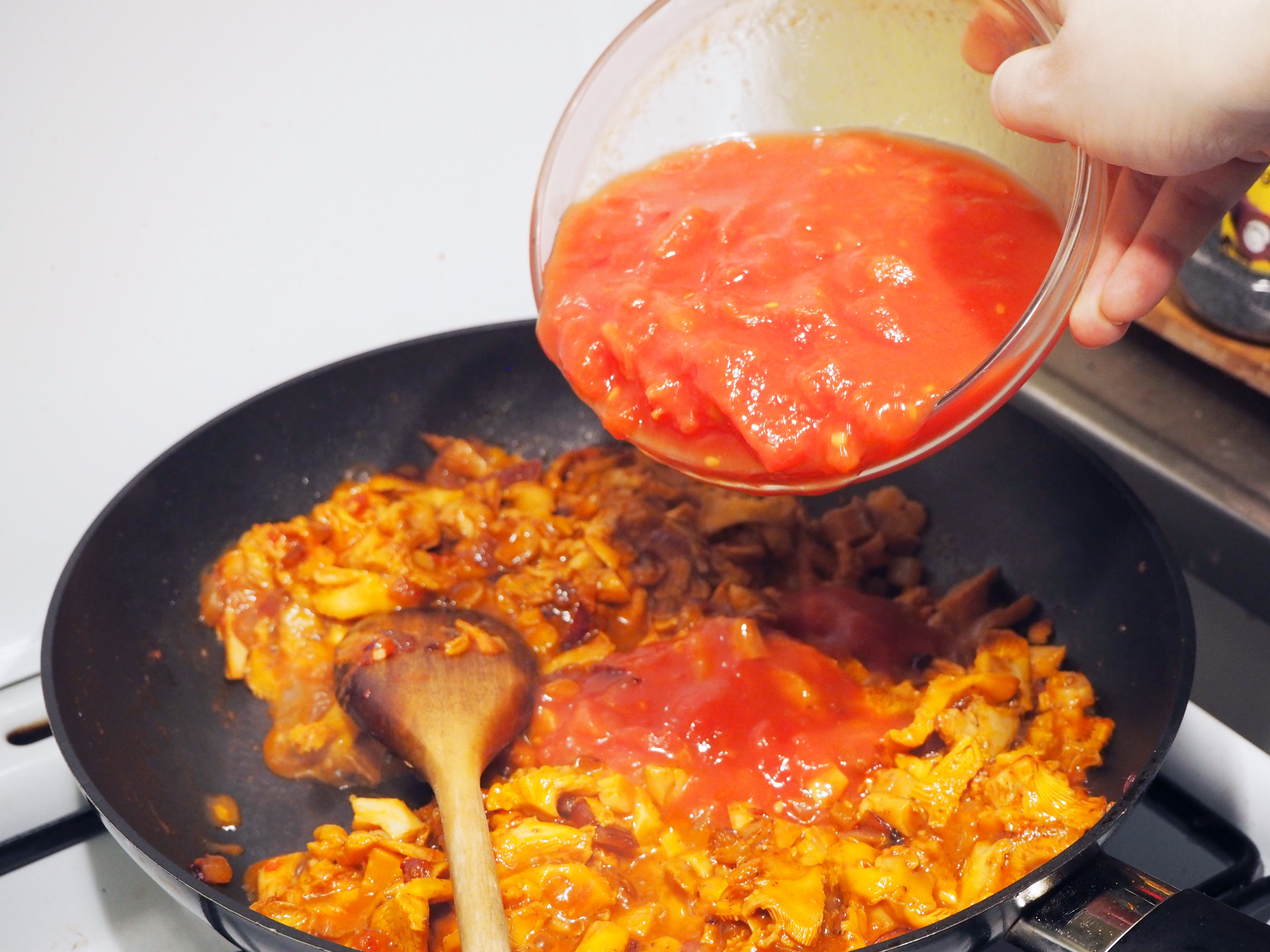 13. Add canned tomato. Stir and cook the whole thing until it gets well cooked and dry. Set aside to cool a little while you start preparing the béchamel sauce.