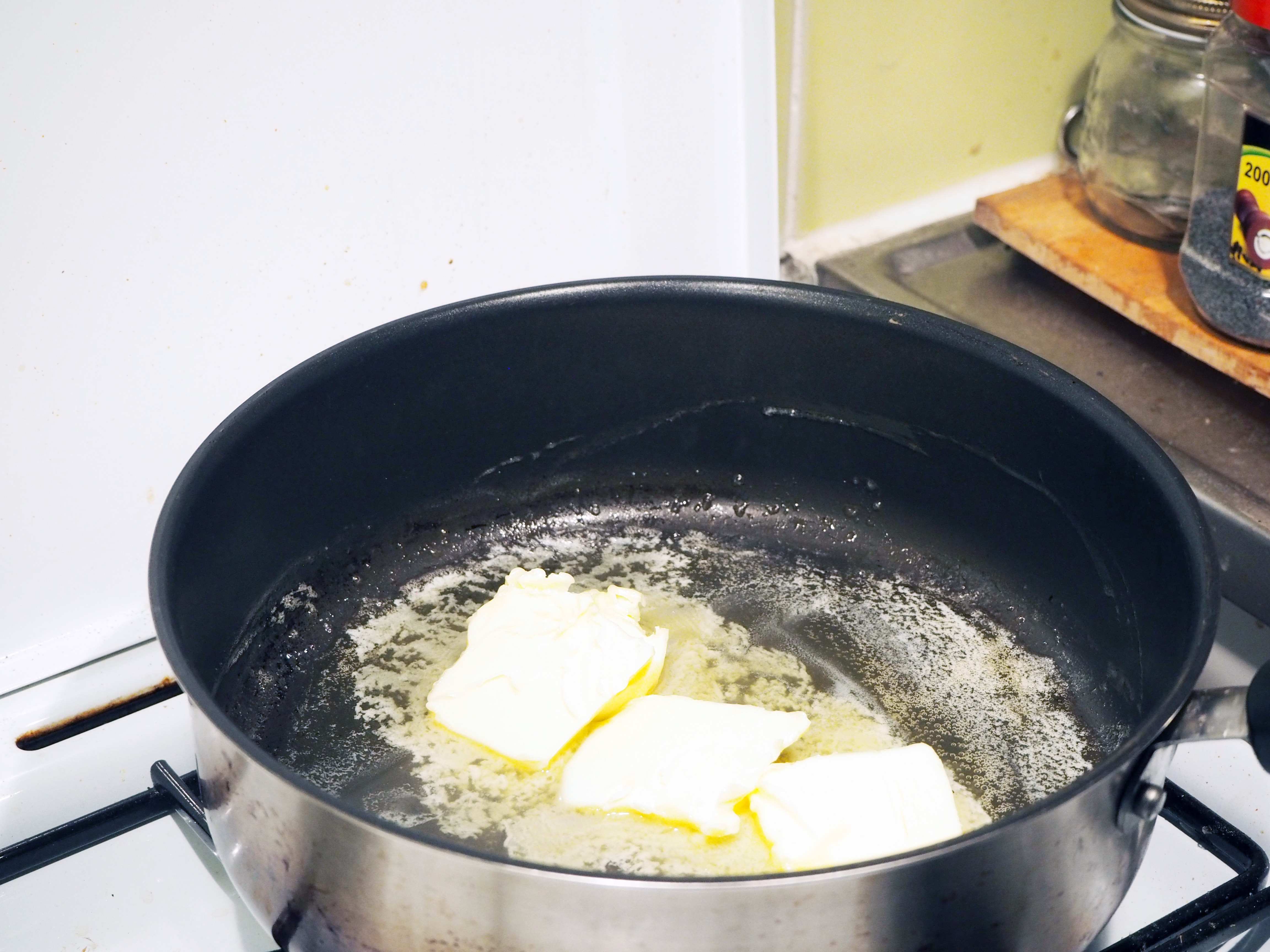 14. In a medium and a little deep pan, put butter on medium heat. Once half of the butter melts, add rice flour and whisk well, until all flour is covered and mixed with melted butter.