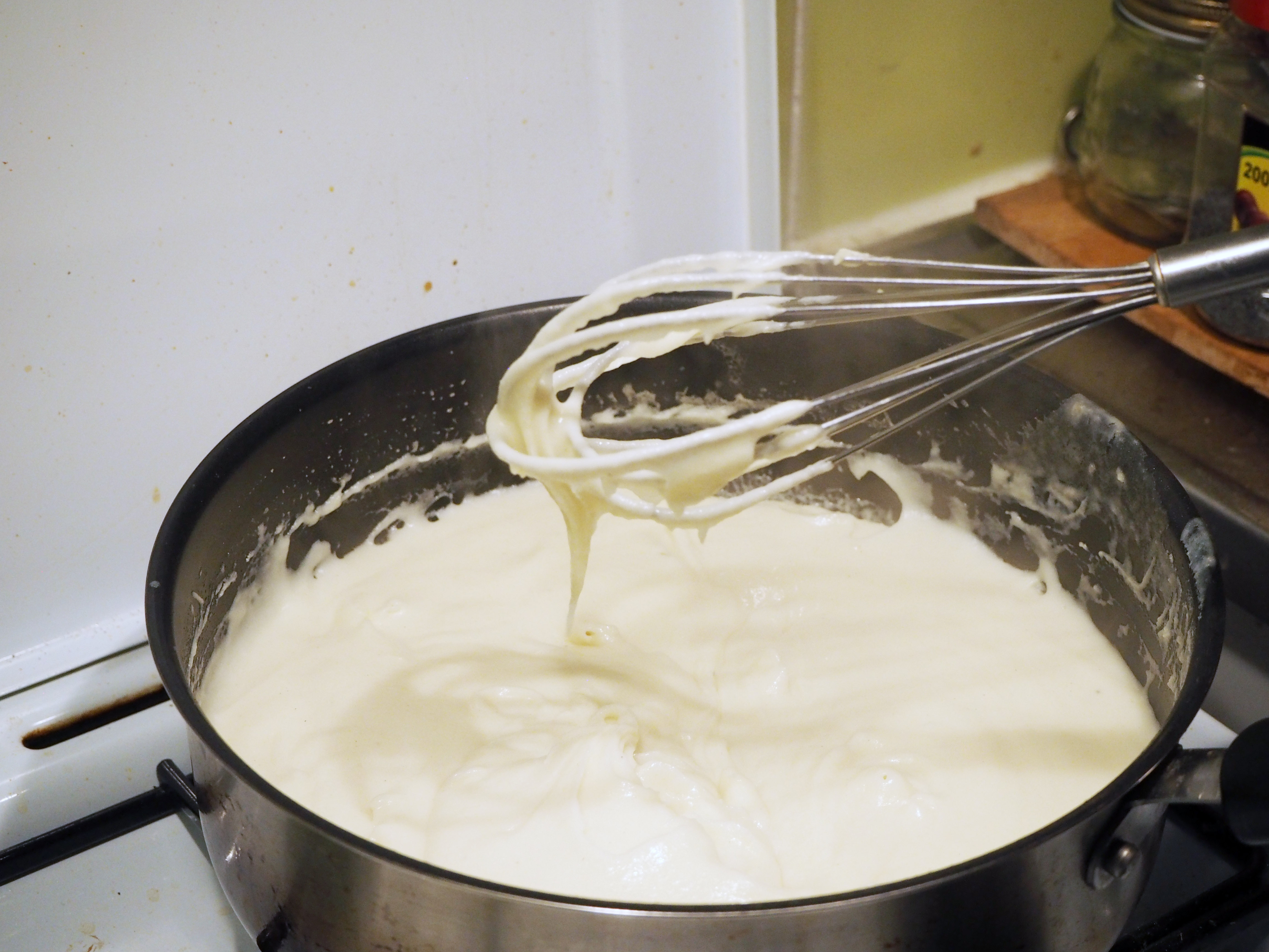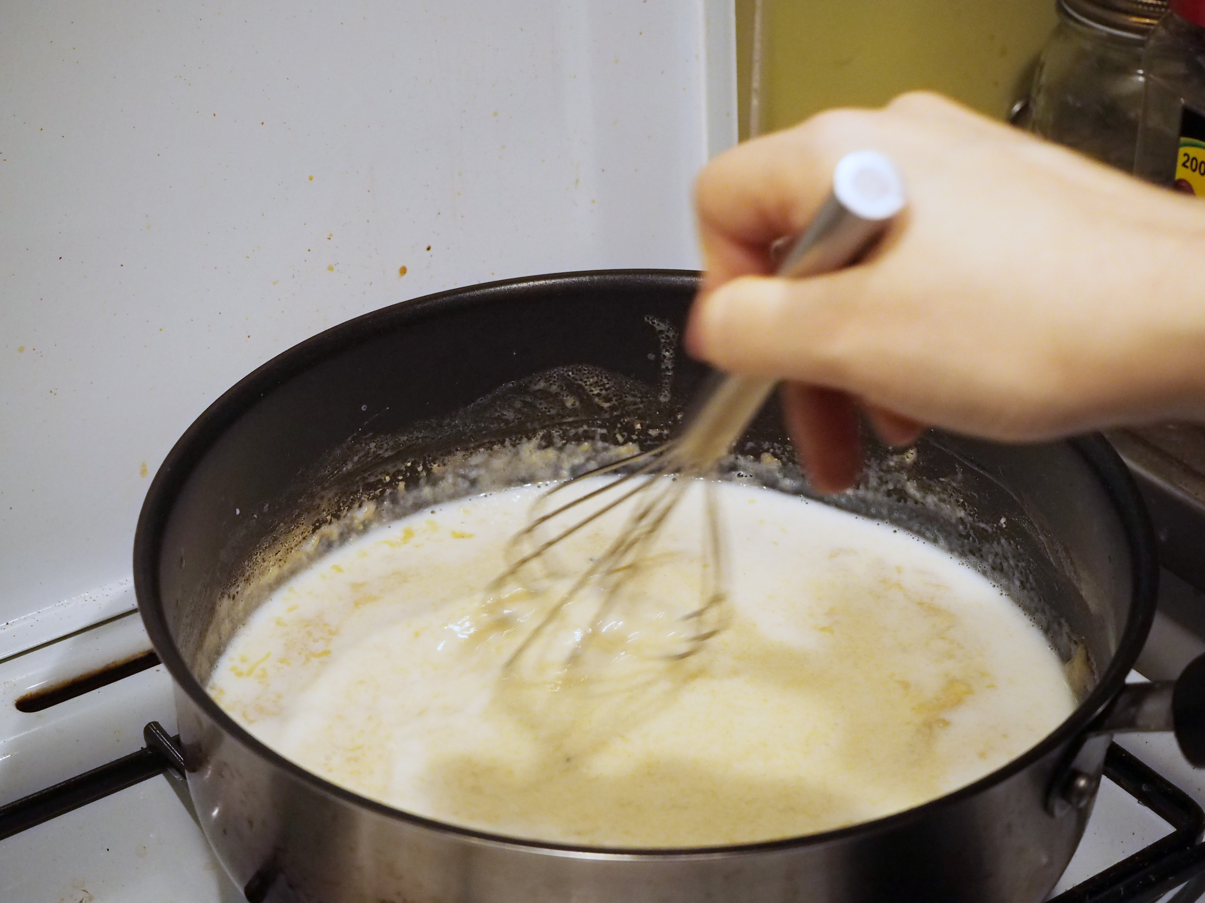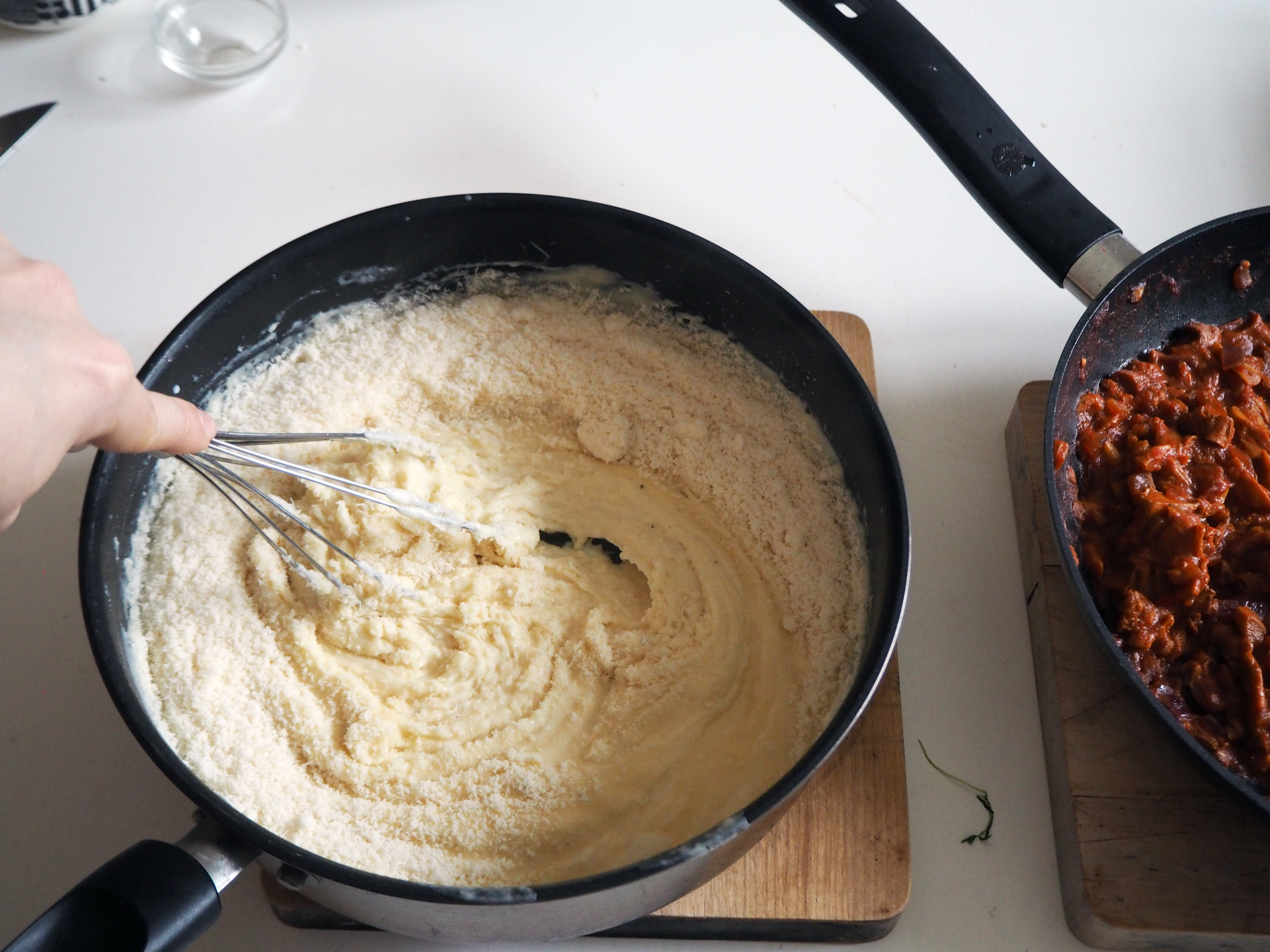 17. Add parmesan cheese to the sauce and whisk again.