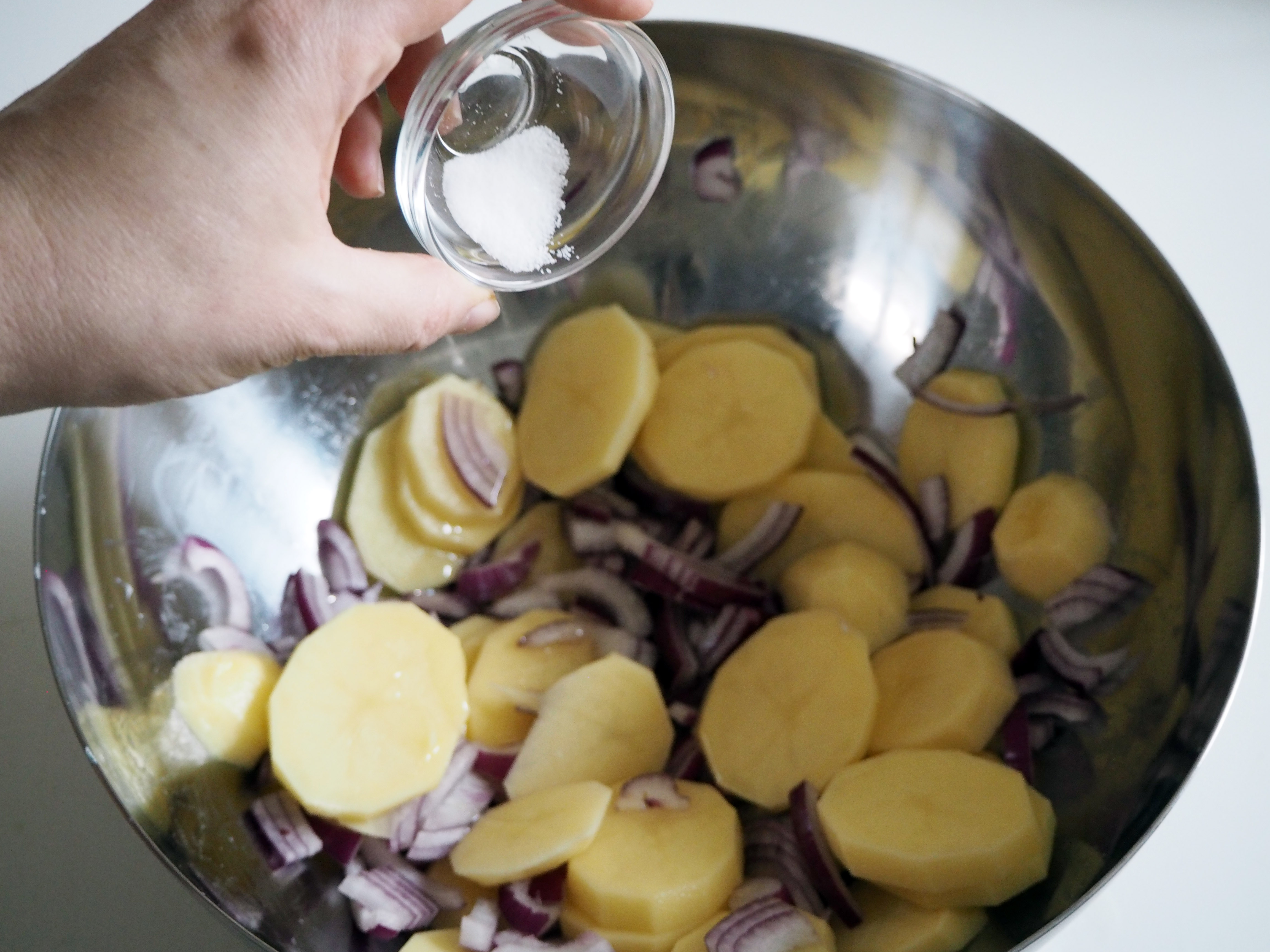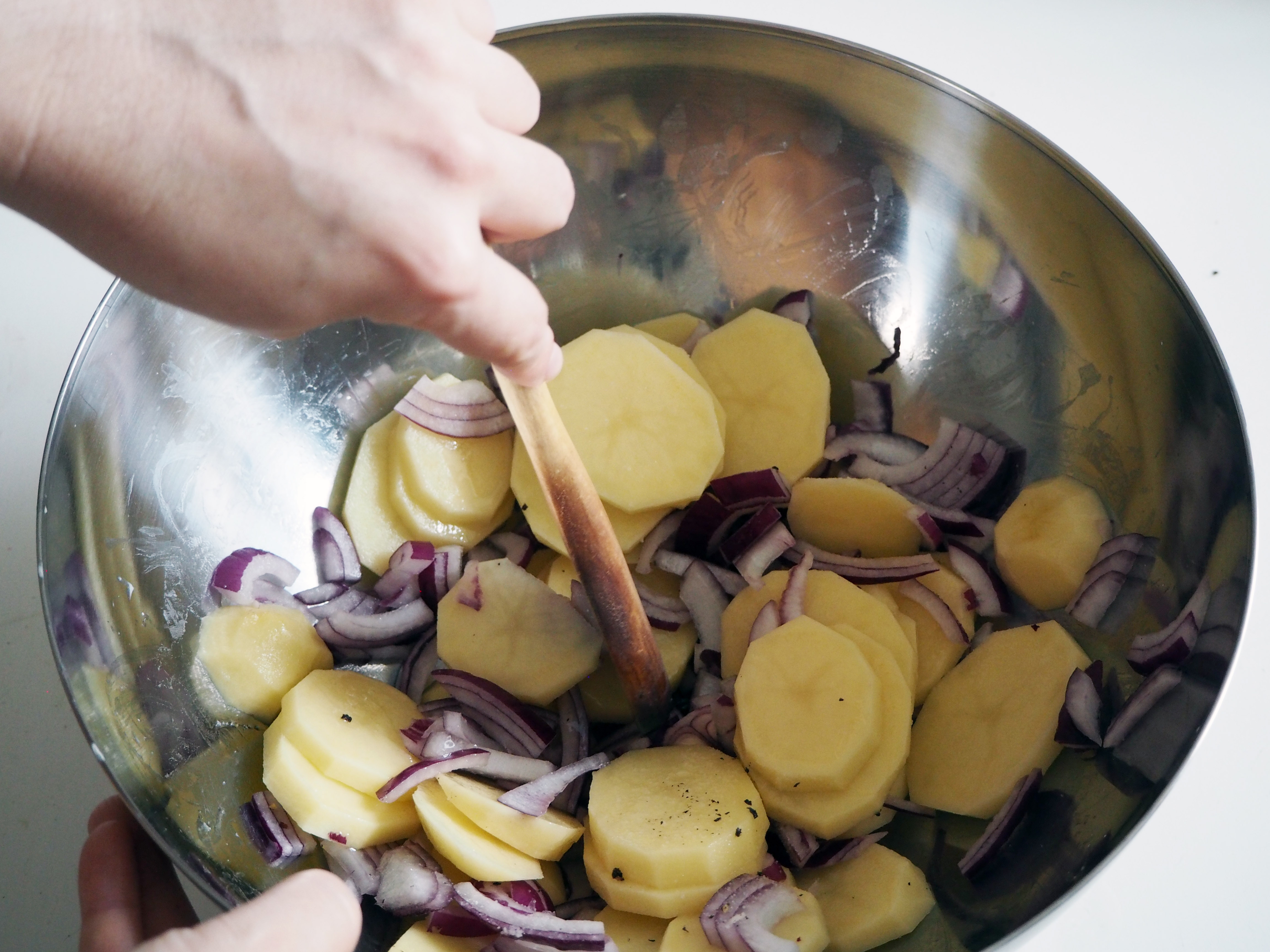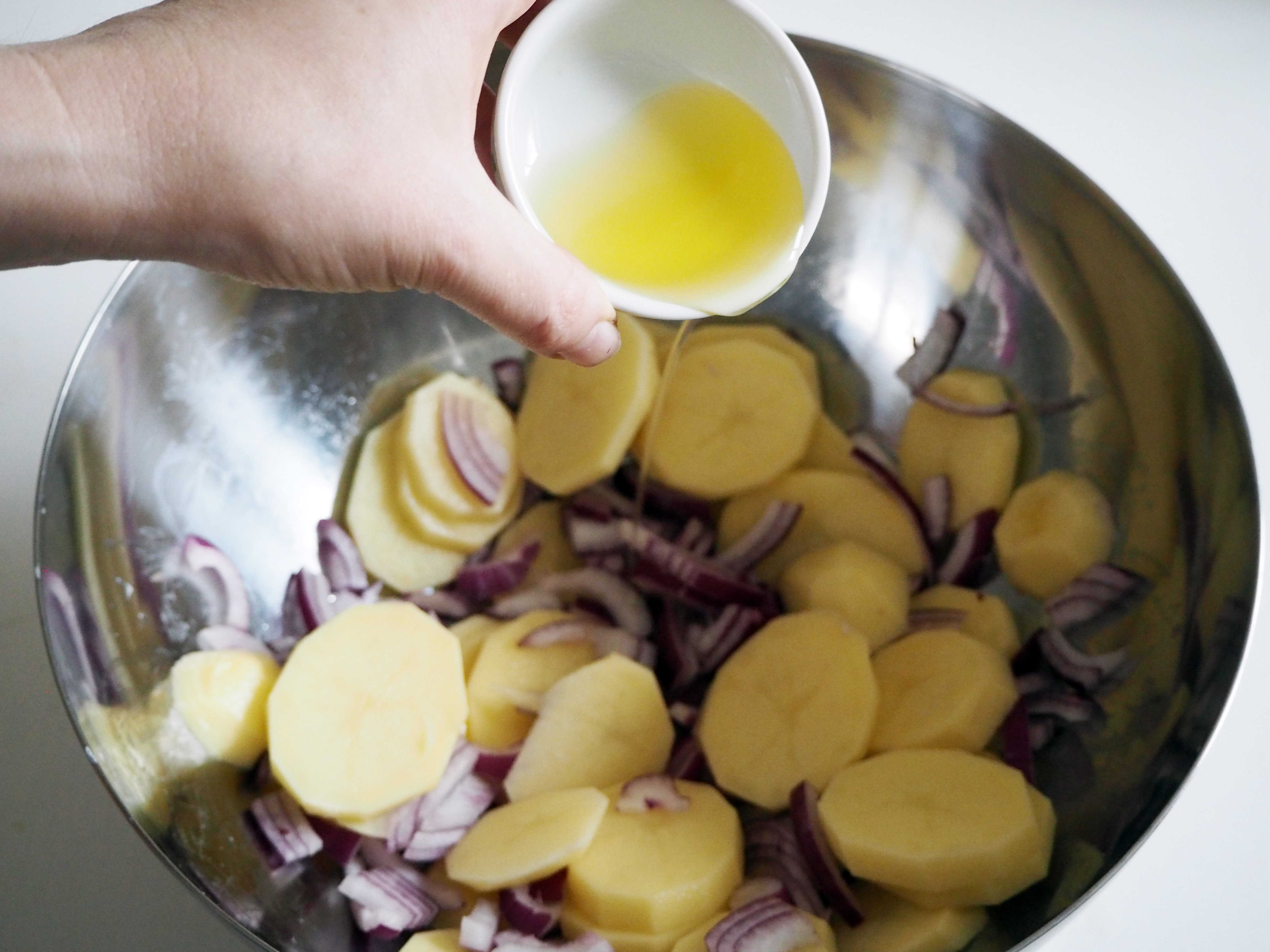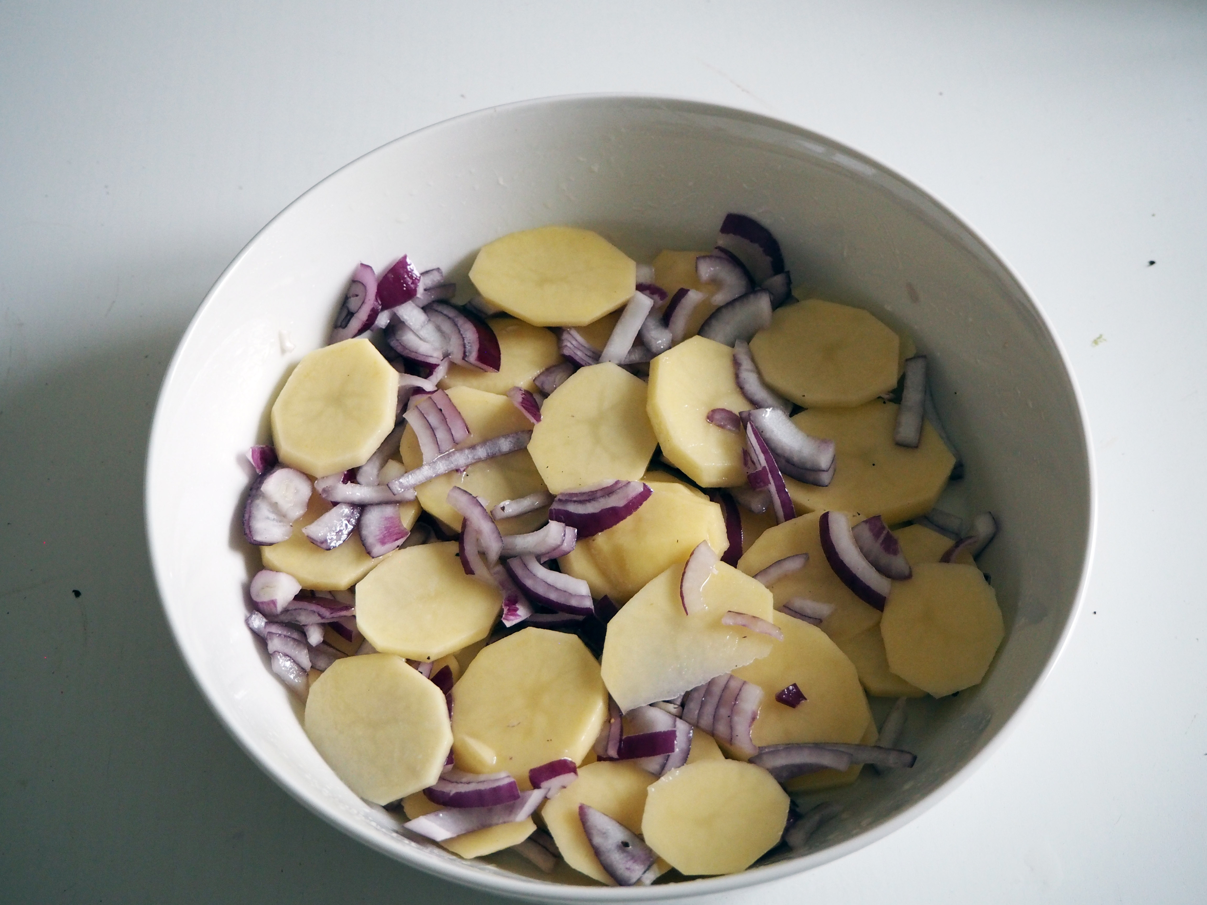 3. Slice 1 red onion and the potatoes finely. Put them in a bowl, put a generous splash of olive oil, a generous pinch of salt and pepper and mix well.