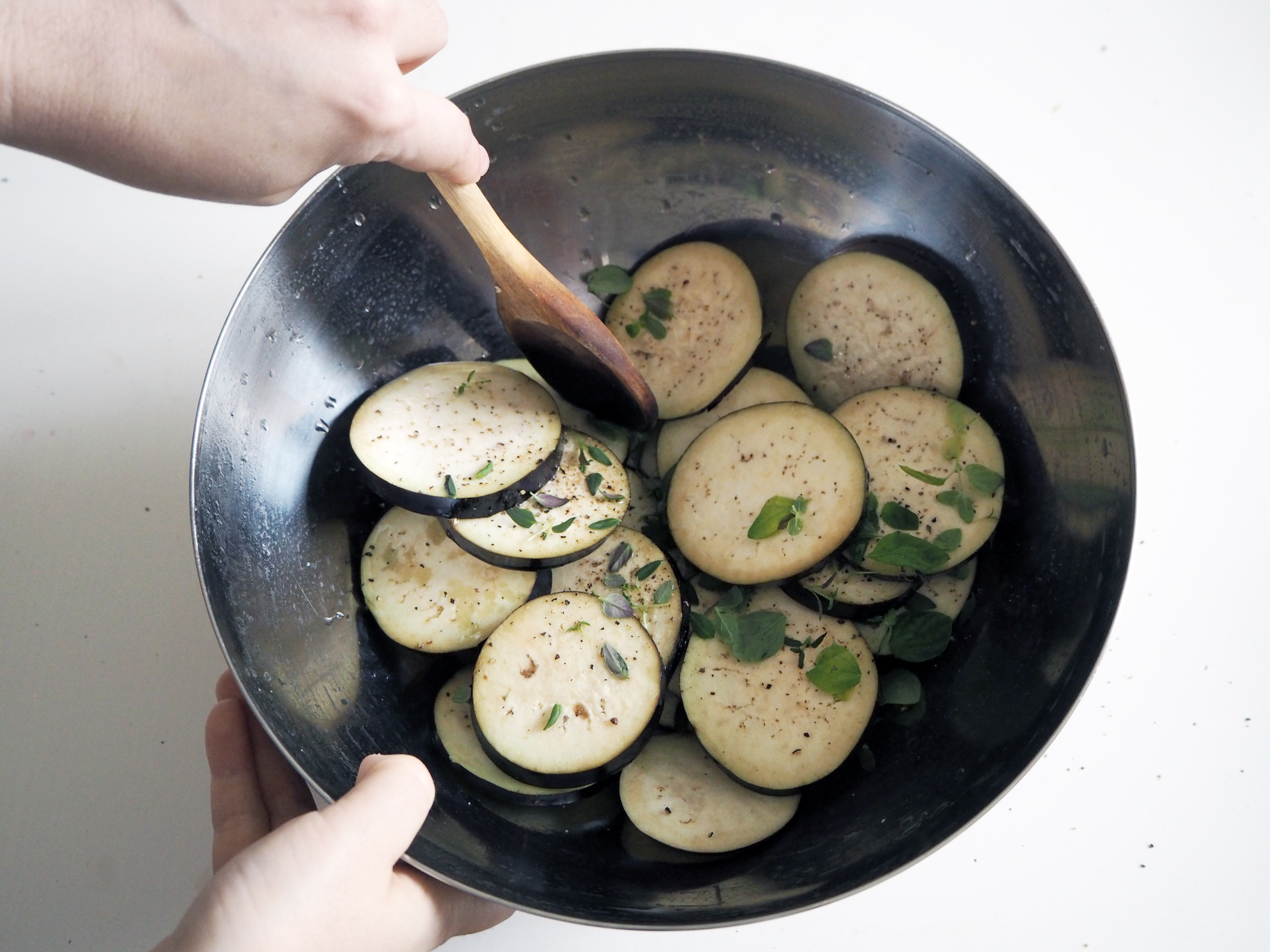 5. Repeat the same with eggplants: put in a bowl, add olive oil, salt and pepper and this time add also a couple of sprigs of oregano and thyme (only the leaves). Mix well.