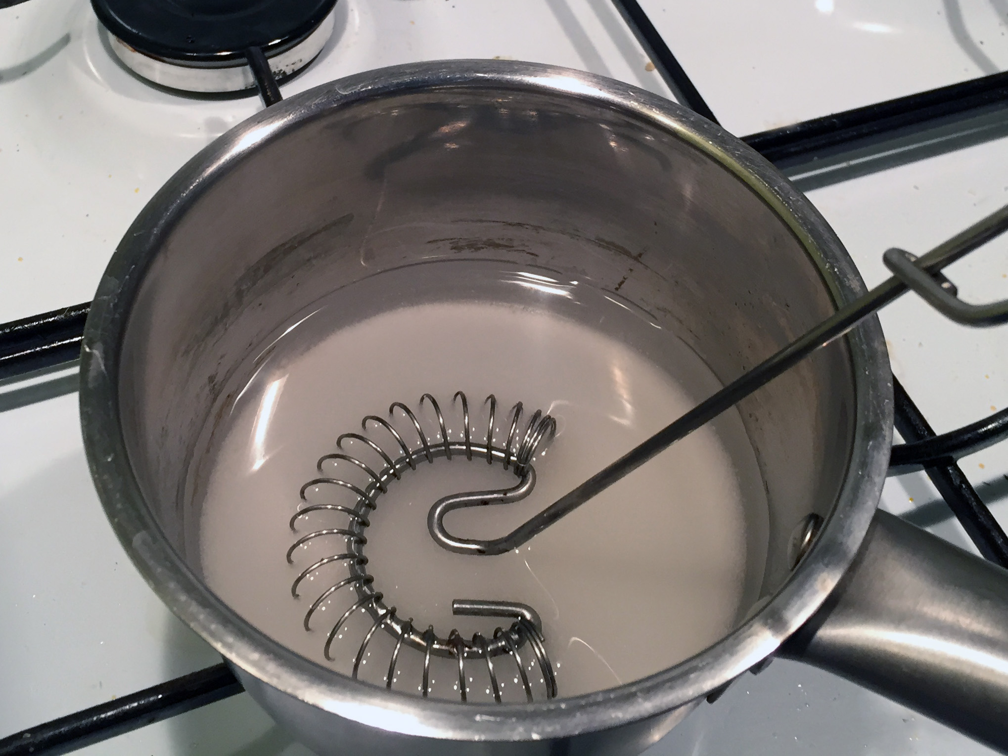 13. While buns are baking, prepare simple syrup by heating water and sugar in a small saucepan, continuously whisking it. Let the mixture boil for a minute and take away from the heat.