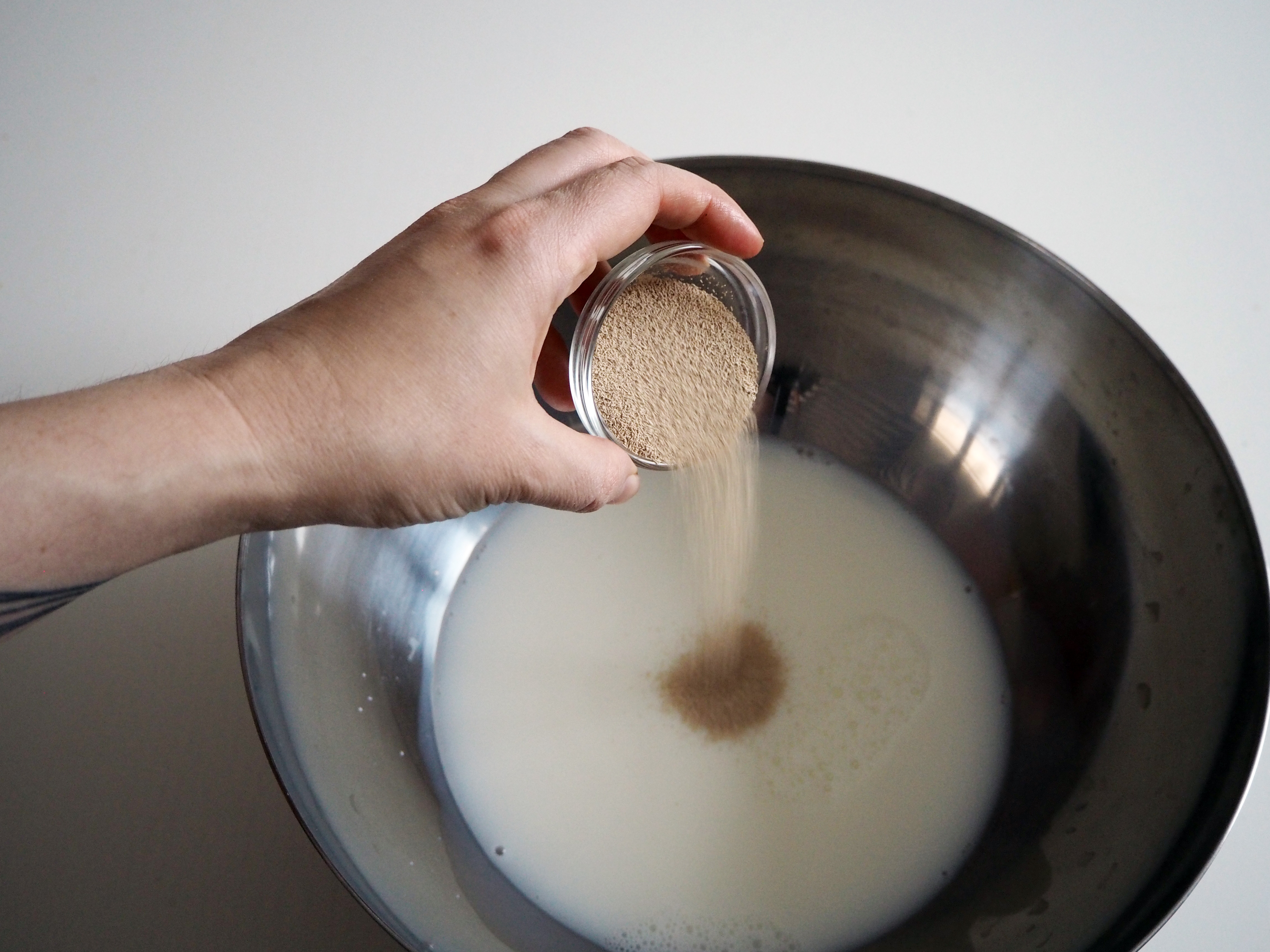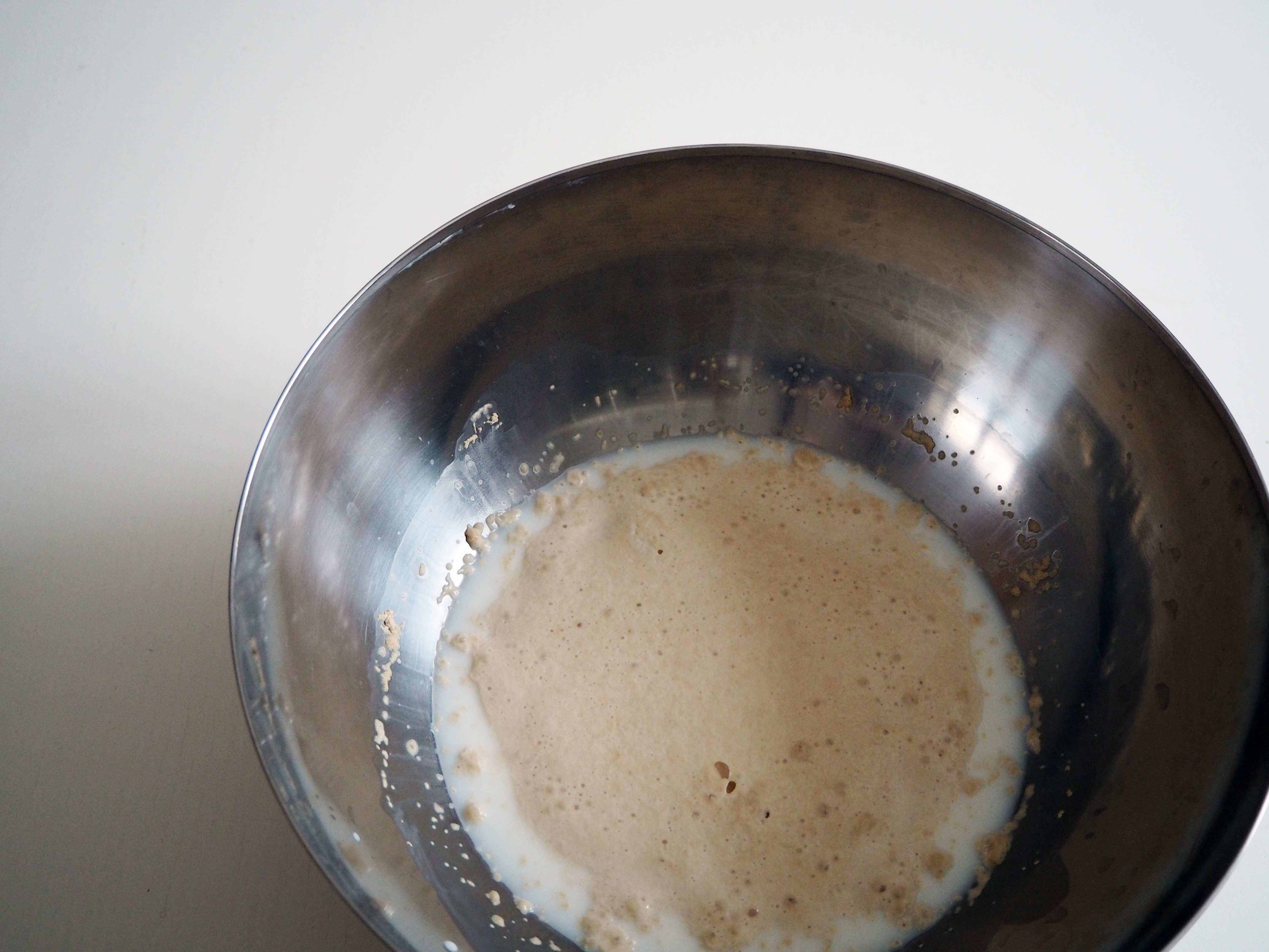 1. In a medium bowl, put warm milk and warm water. Add yeast and mix a little with a spoon. Let it sit for 10 minutes to activate the yeast – you will see that it gets foamy when yeast is activated at the end of 10 minutes.