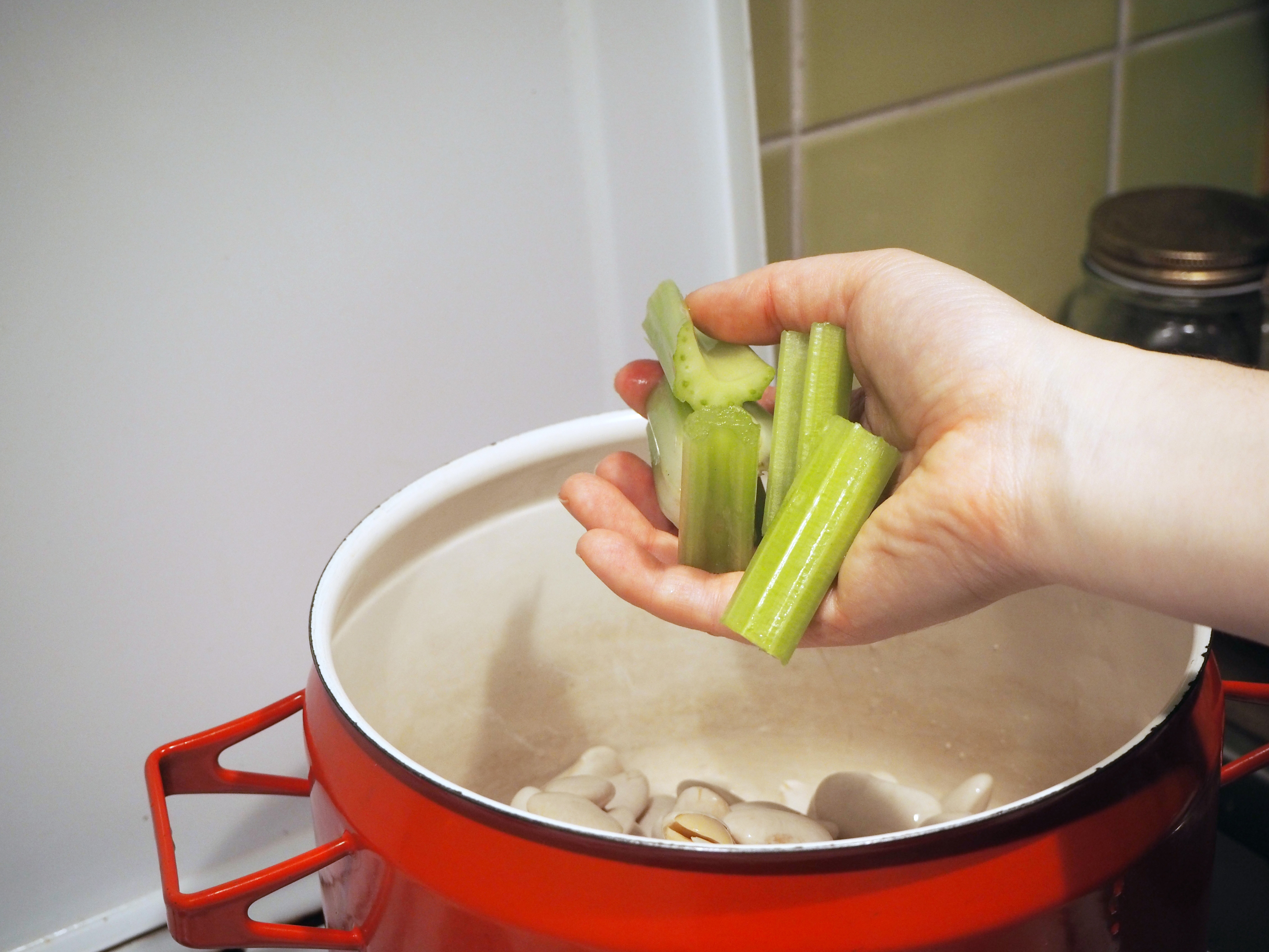 1. In a big pan, put soaked beans, celery stalk and herbs bundle. Cover with water, at least 2 cm higher than beans, put the heat on medium high and bring to a boil. When it boils, put the heat to low and simmer, occasionally stirring, for at least 2 hours, or until the beans are soft and tender. Once cooked, add a generous amount of salt and stir a bit. If you are going to make the rest of the dish right away, then drain and discard the herbs and celery stalk right after it’s cooked. If not, you can cover the pot and put it in the fridge (after it cools down to room temperature) and keep it like this with the water and everything up to 3 days. I cooked the beans in the evening and made the rest of the dish during the next day.