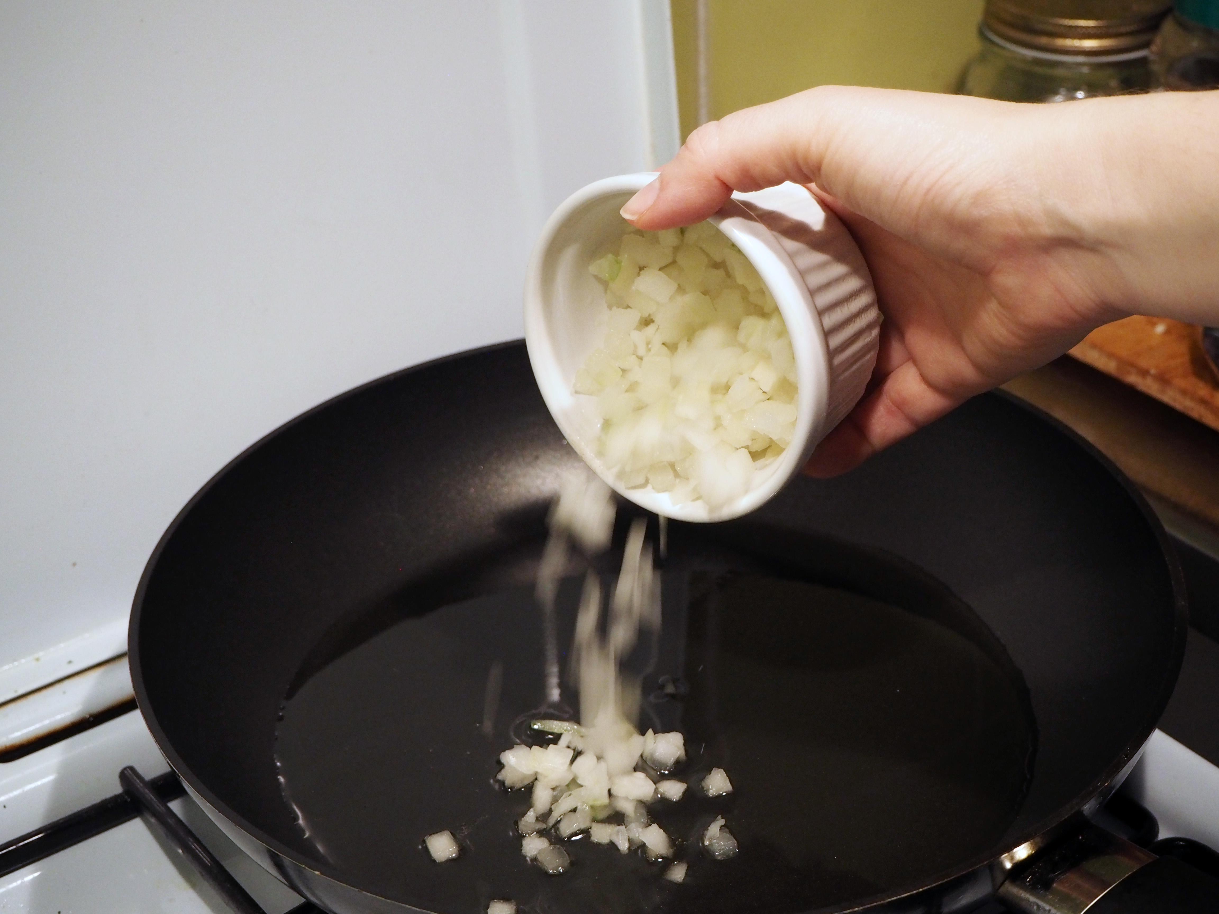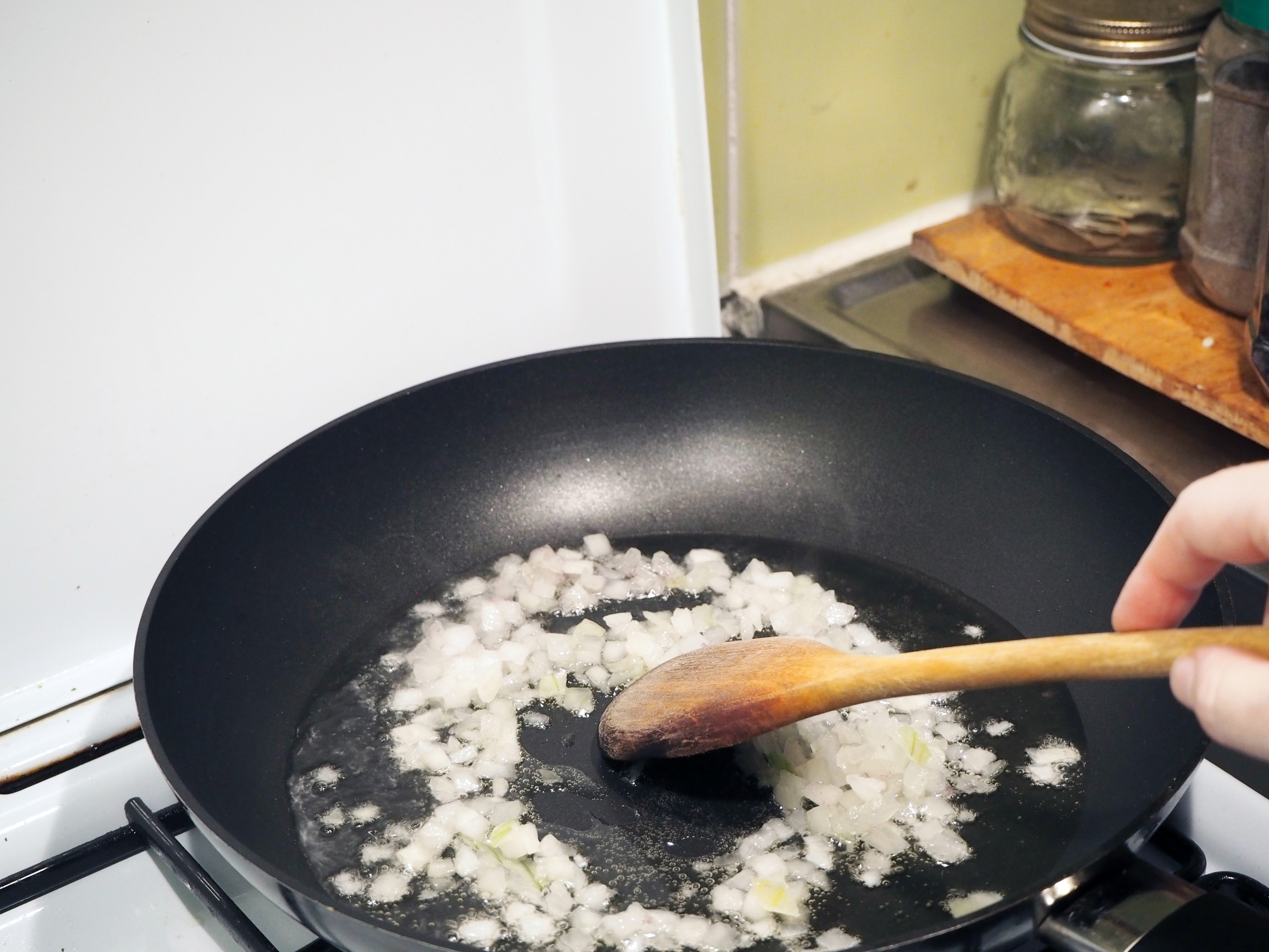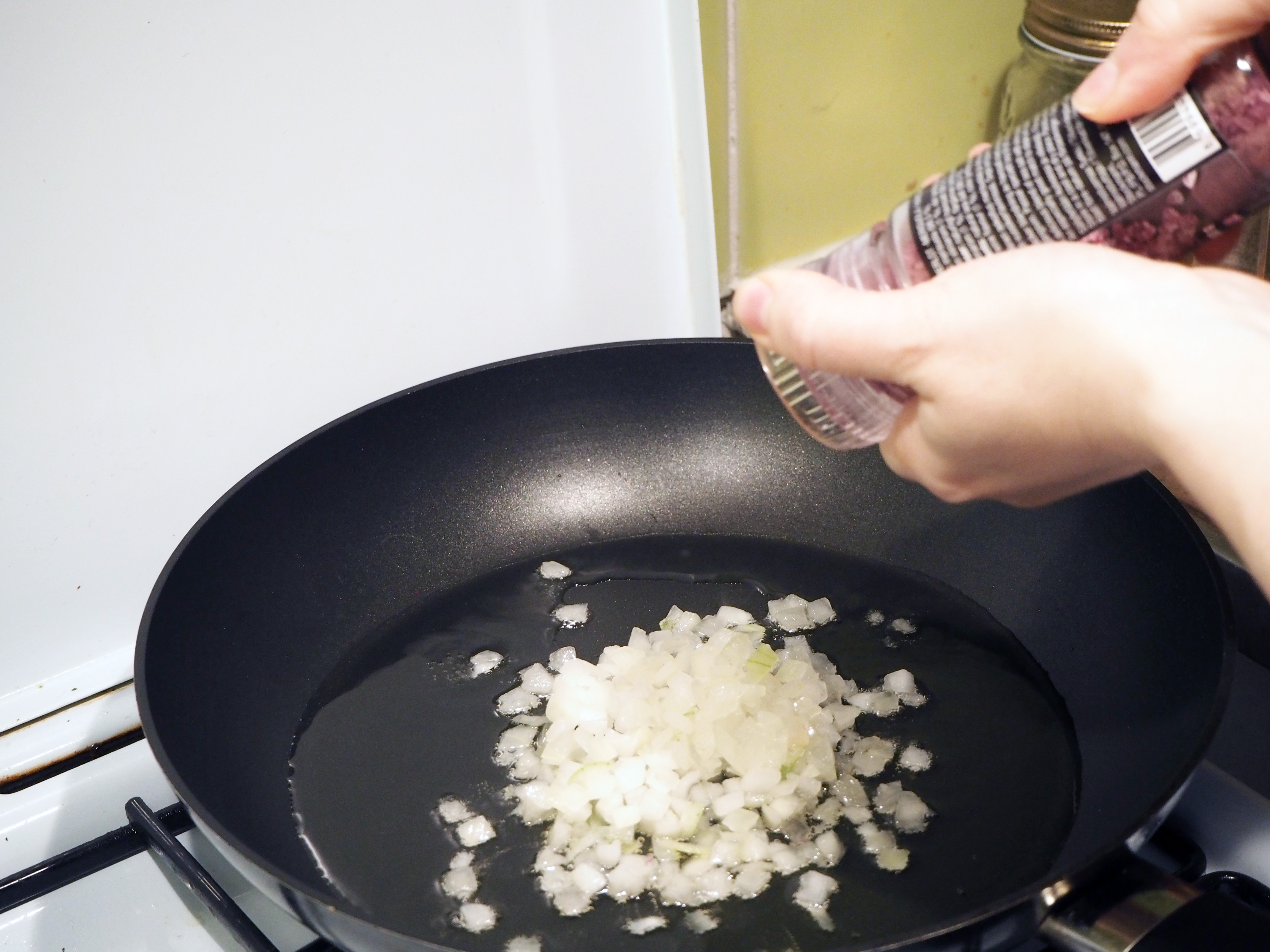 3. In a medium pan on medium high heat, put olive oil and heat it for a minute. Add onions and a pinch of salt and sauté until the onions are soft and translucent.