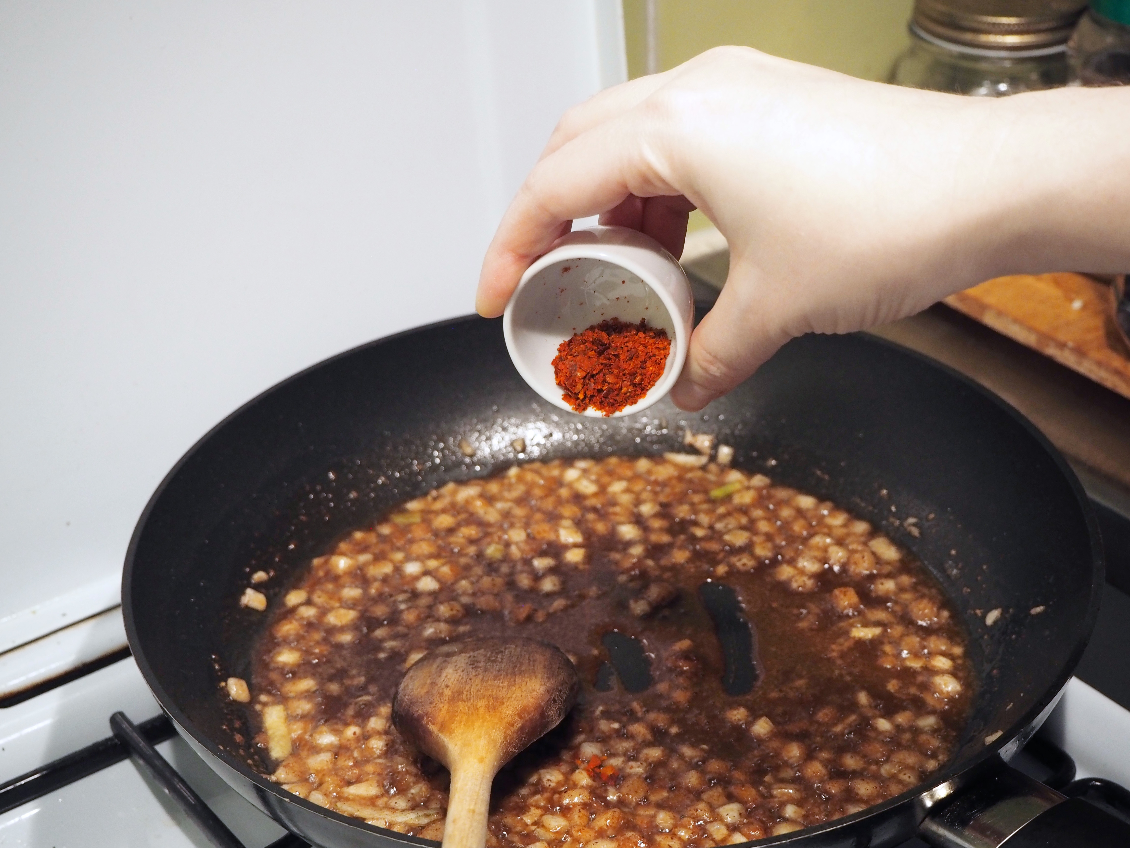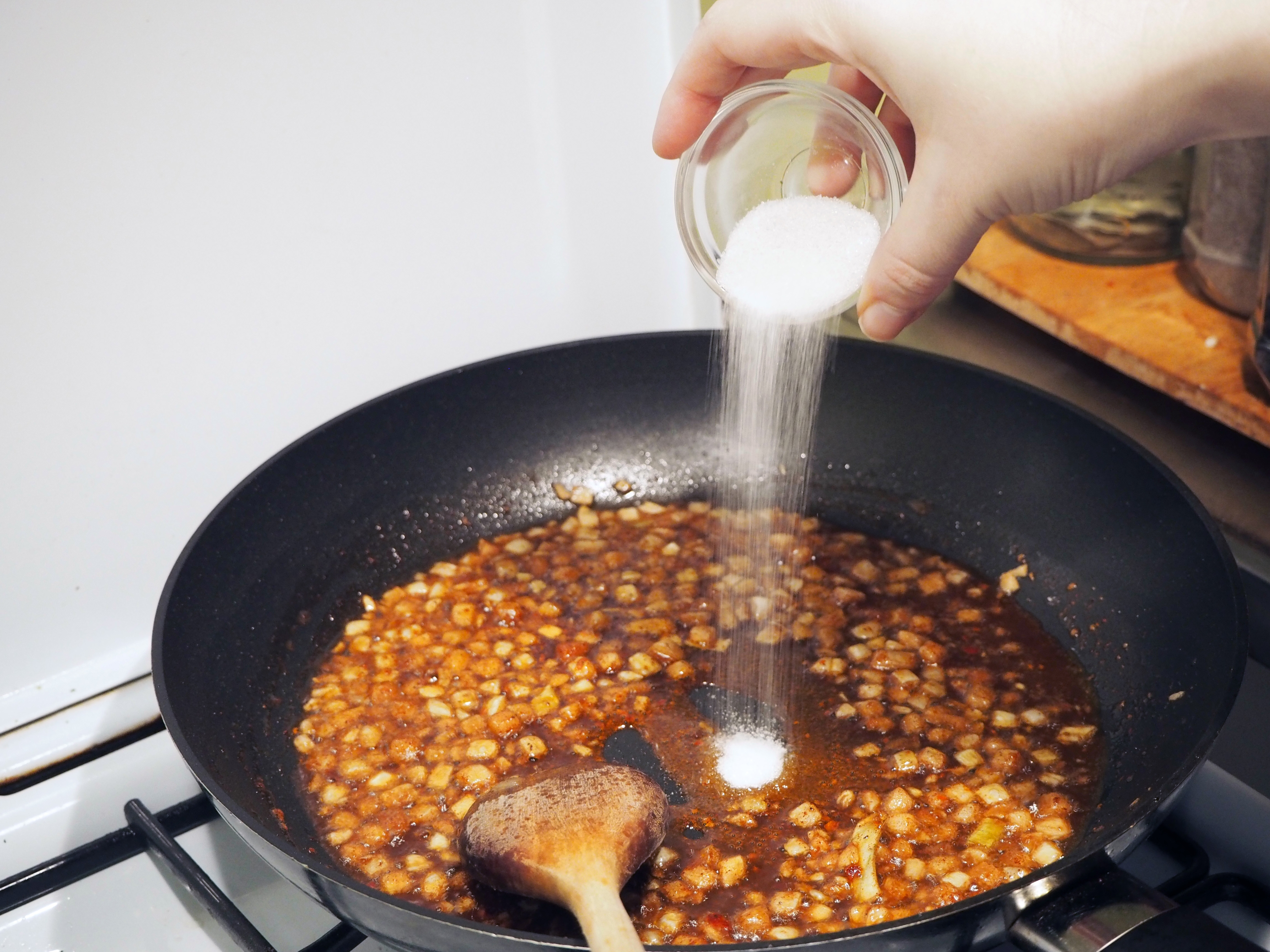 5. Add red pepper, sugar, garlic and stir a bit more.
