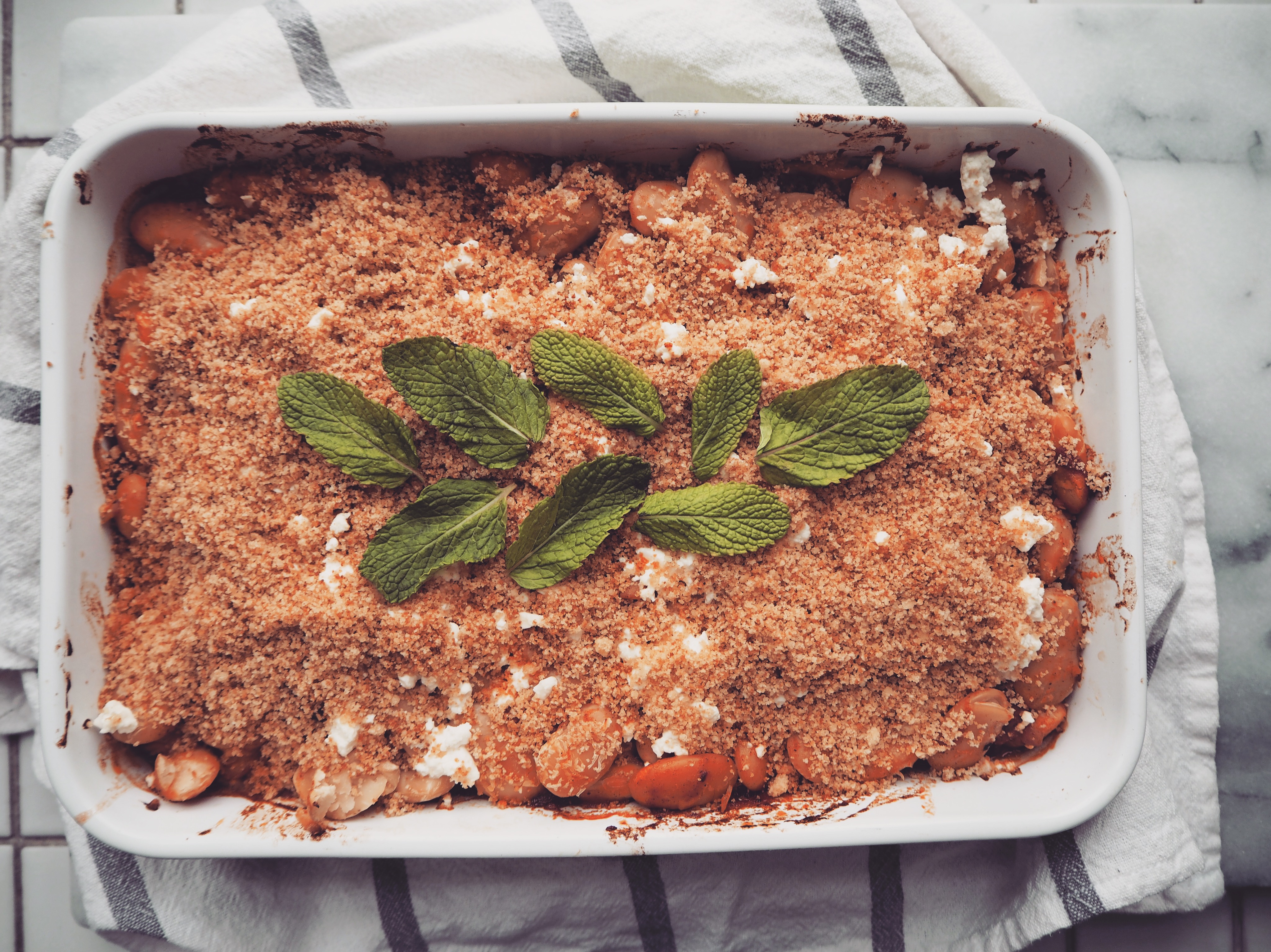 9. When the beans are baked, spread the browned breadcrumbs on top, garnish with fresh mint leaves (and drizzle some olive oil if you like – I didn’t do that). Enjoy!