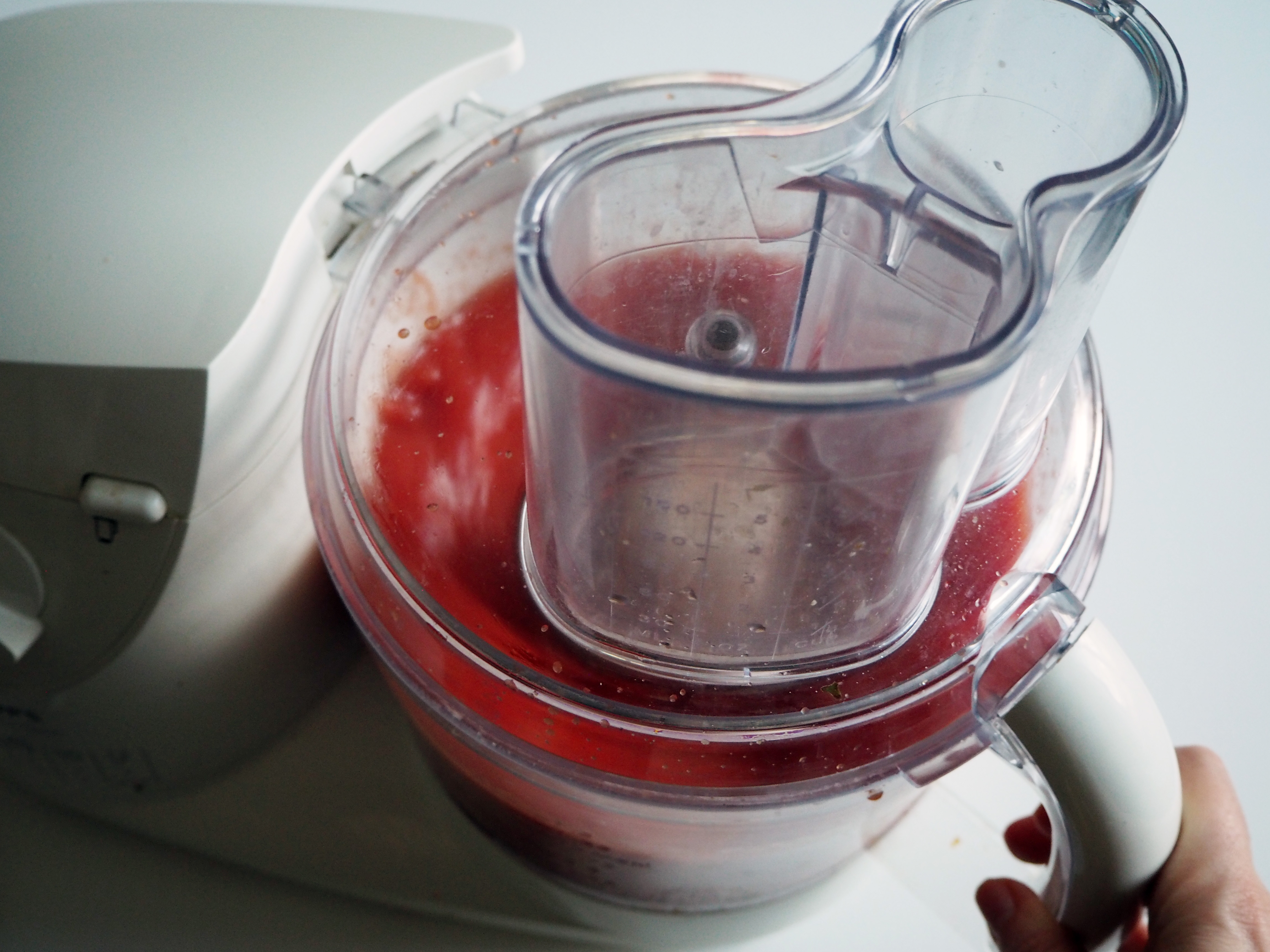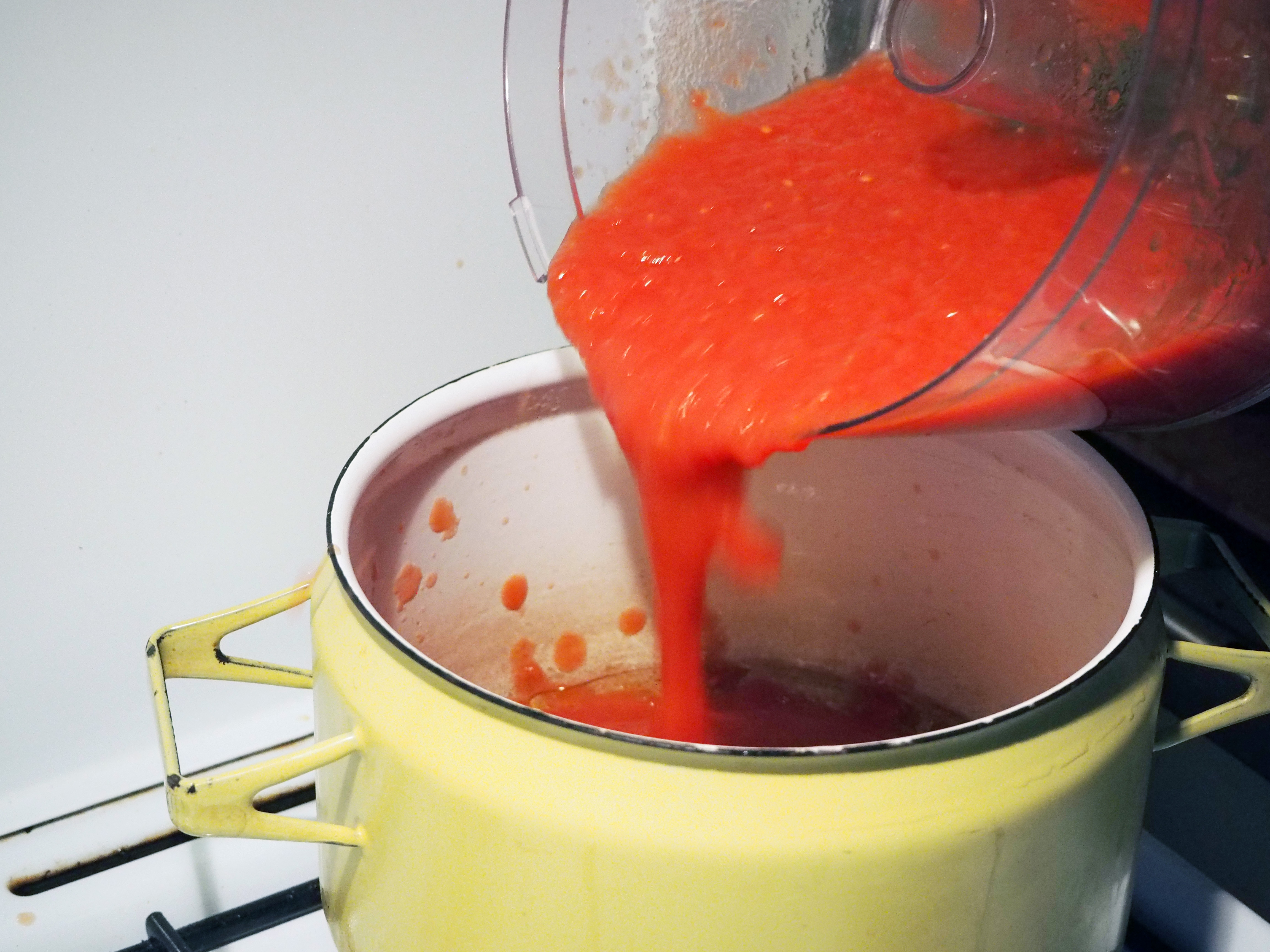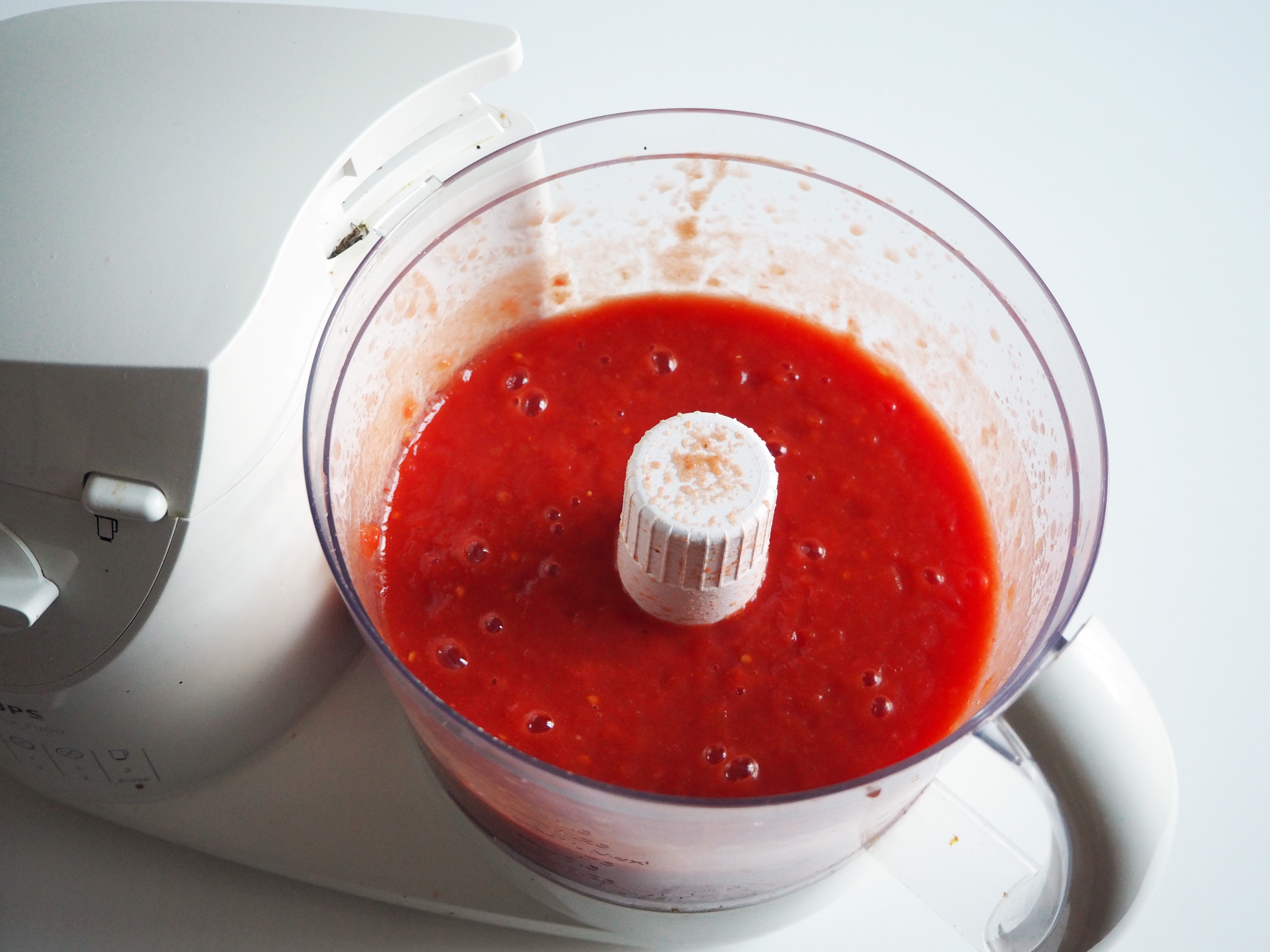 *If you can find fresh tomatoes that are juicy and delicious, you can use 3-4 tomatoes instead of canned tomatoes. Just peel them before you process.