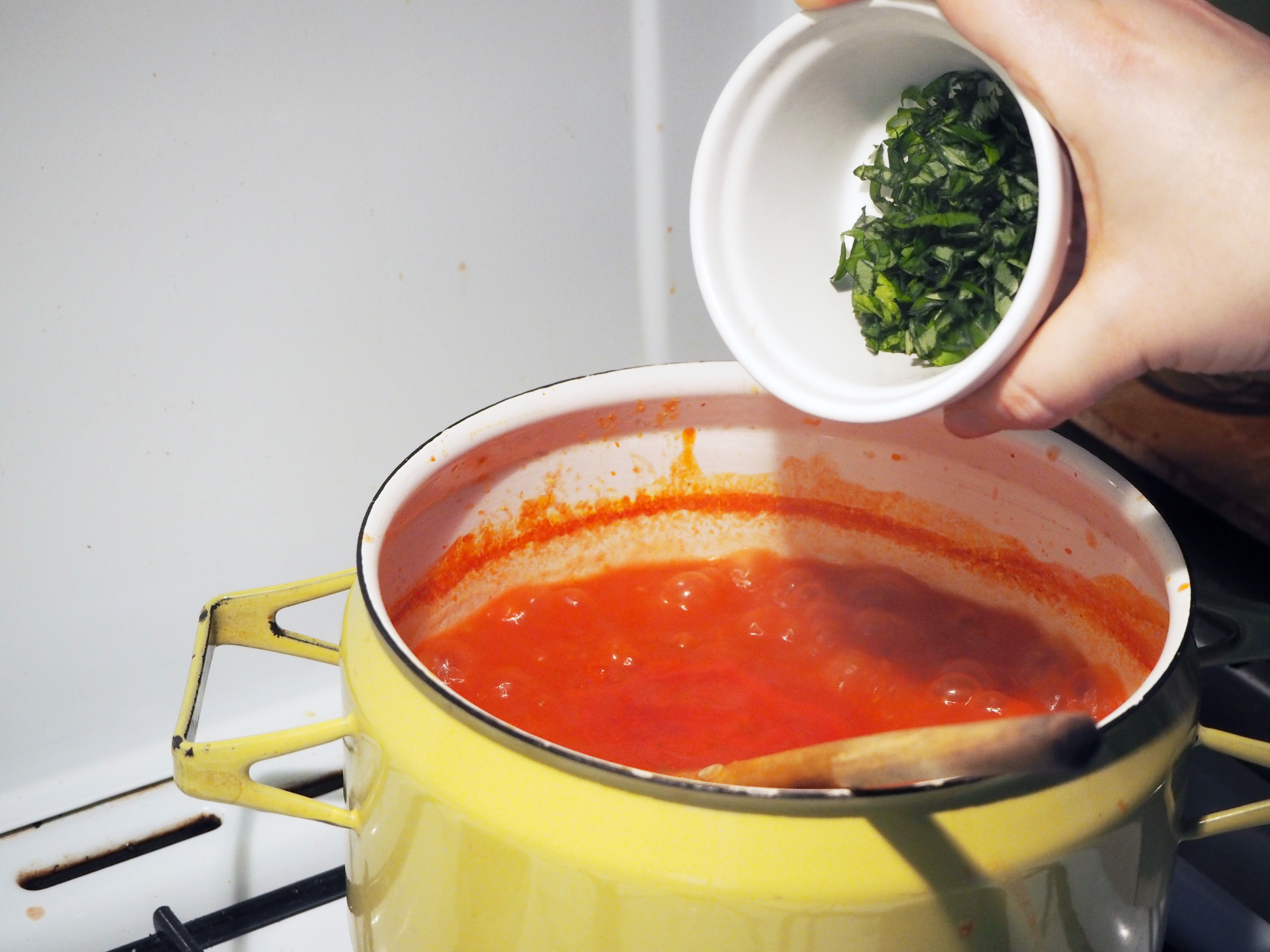 4. Once it starts boiling, add basil, stir and put the heat down to low. Let it simmer for 10 minutes, stirring frequently (or orzo will stick to the base of the pan). At that point, if you want to make the soup thinner, you can add warm water (I added 1 cup of water).