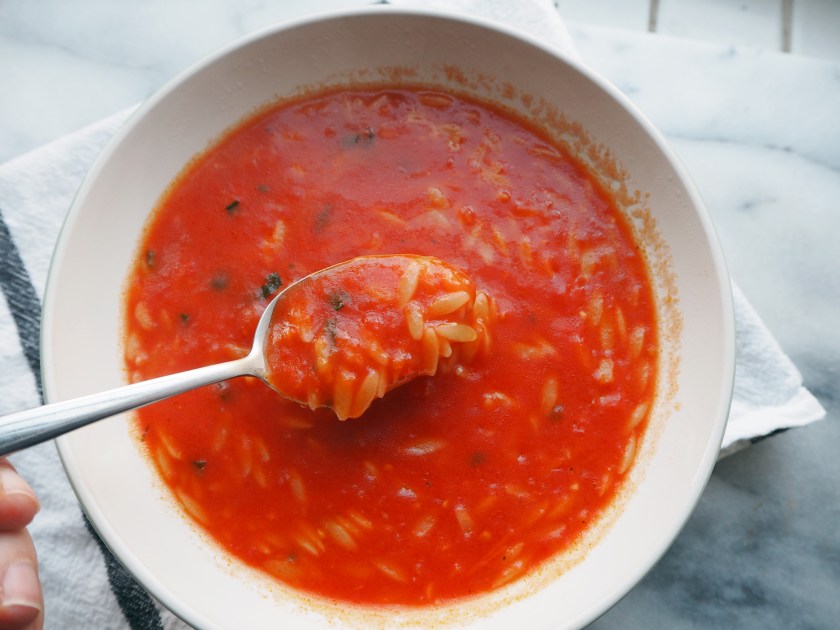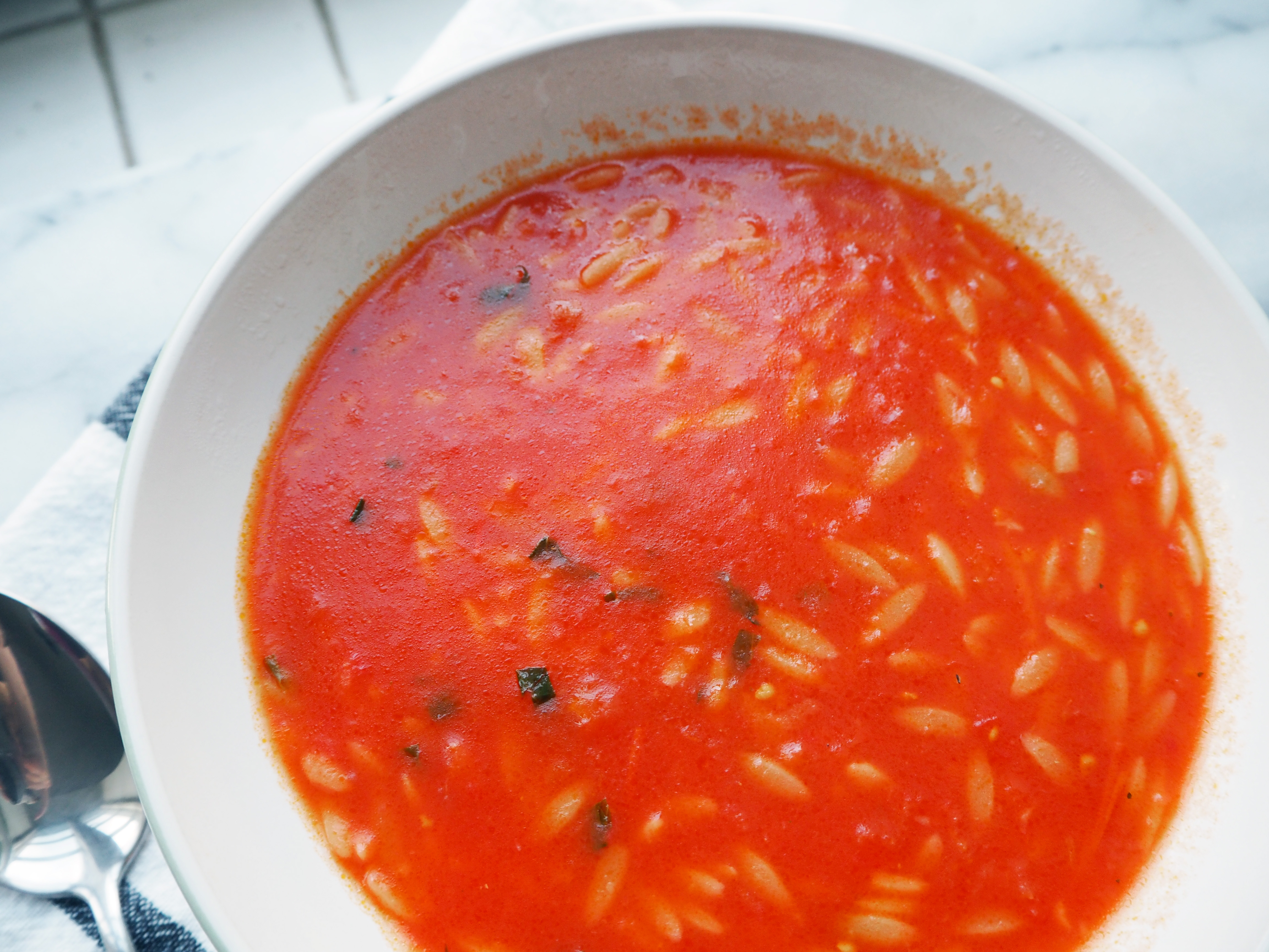 The soup is so easy to make that you will get addicted to it, especially if you have a busy schedule. It is one of the fastest and most delicious lunch dishes. Especially if you use canned tomatoes like me, then you will not spend time to grate the tomatoes either (though, in any case you can use a food processor, more about that below). The fresh basil part is my little addition to my mother’s traditional soup – I love the combination of tomato and fresh basil so much that I try to use them together whenever I can! So if you don’t like basil (is that possible??) or if you don’t have it at home, you can perfectly make the soup without it. In addition to this, you can change use vermicelli instead of orzo if you want a thinner texture. Enjoy your soup!
