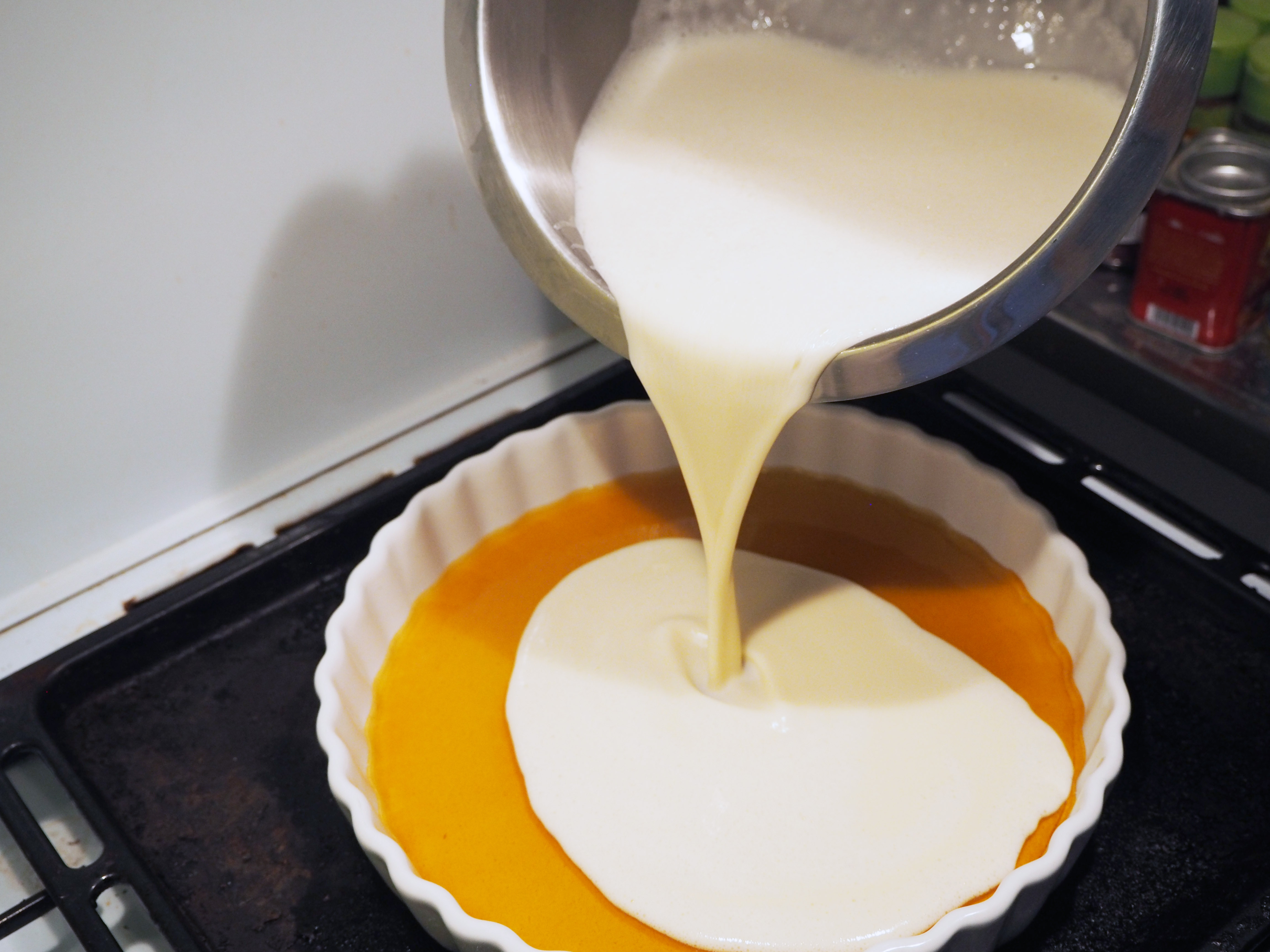 3. Once the sugar caramelises, quickly pour it into your mould. By moving the mould around, make sure that the caramel spreads equally to cover the entire base. Do not ever touch the caramel, it will burn your skin immediately and it will burn bad.. Put the mould inside a bigger and deep tray / oven dish and put it aside while preparing the rest.