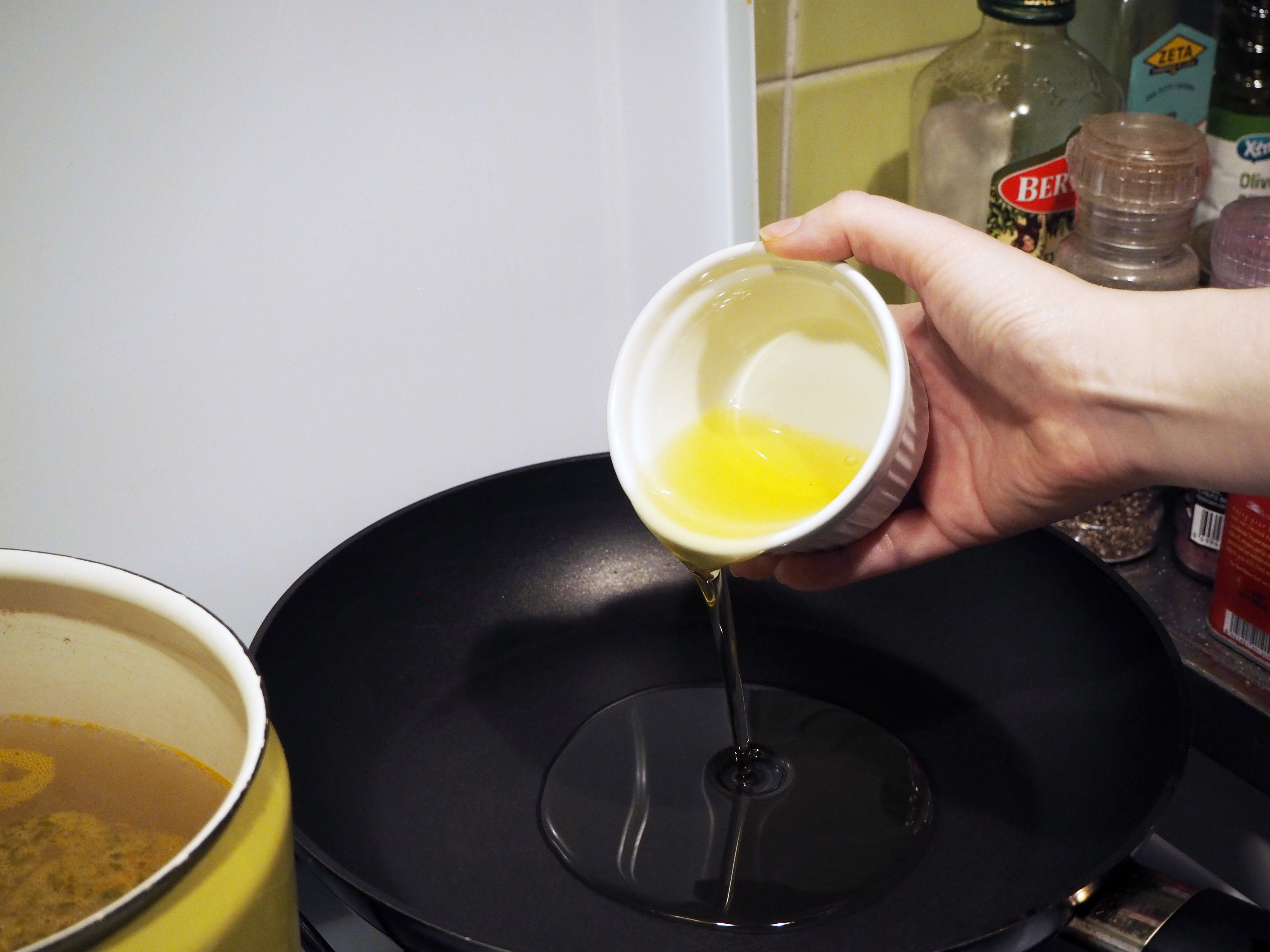 2. In a medium pan, put olive oil and heat for a minute on medium heat. Add mushrooms and stirring occasionally, cook until slightly browned.