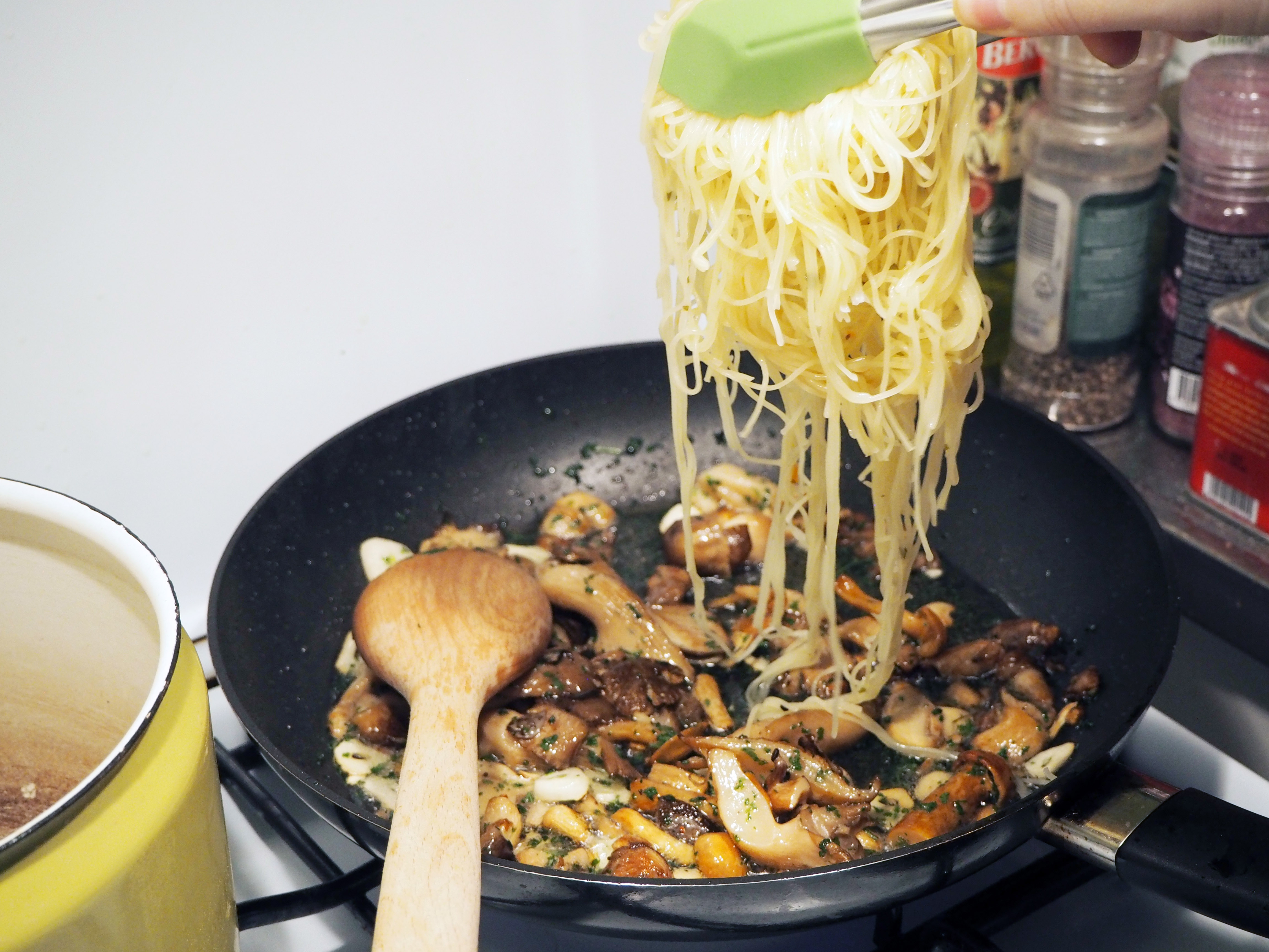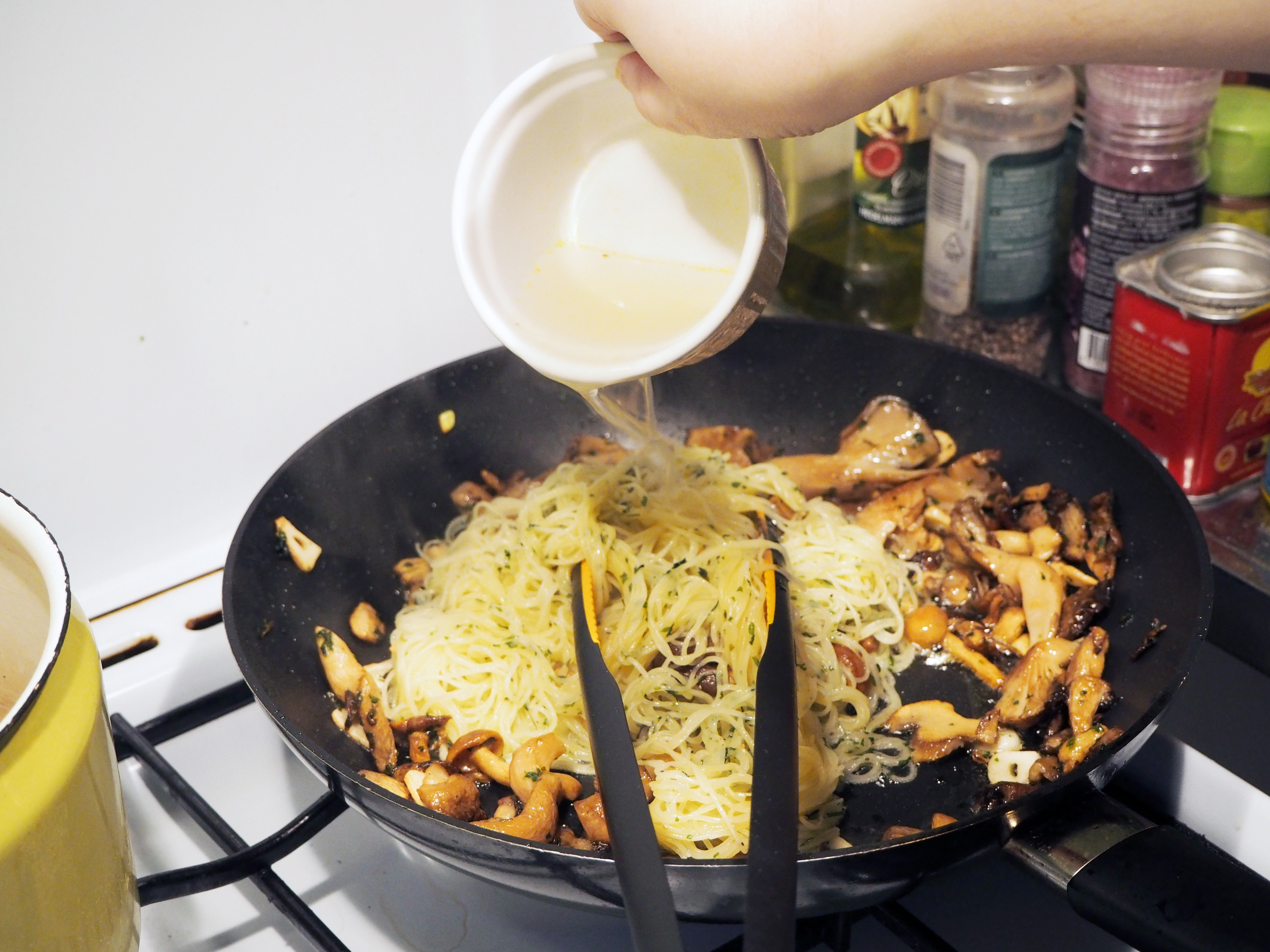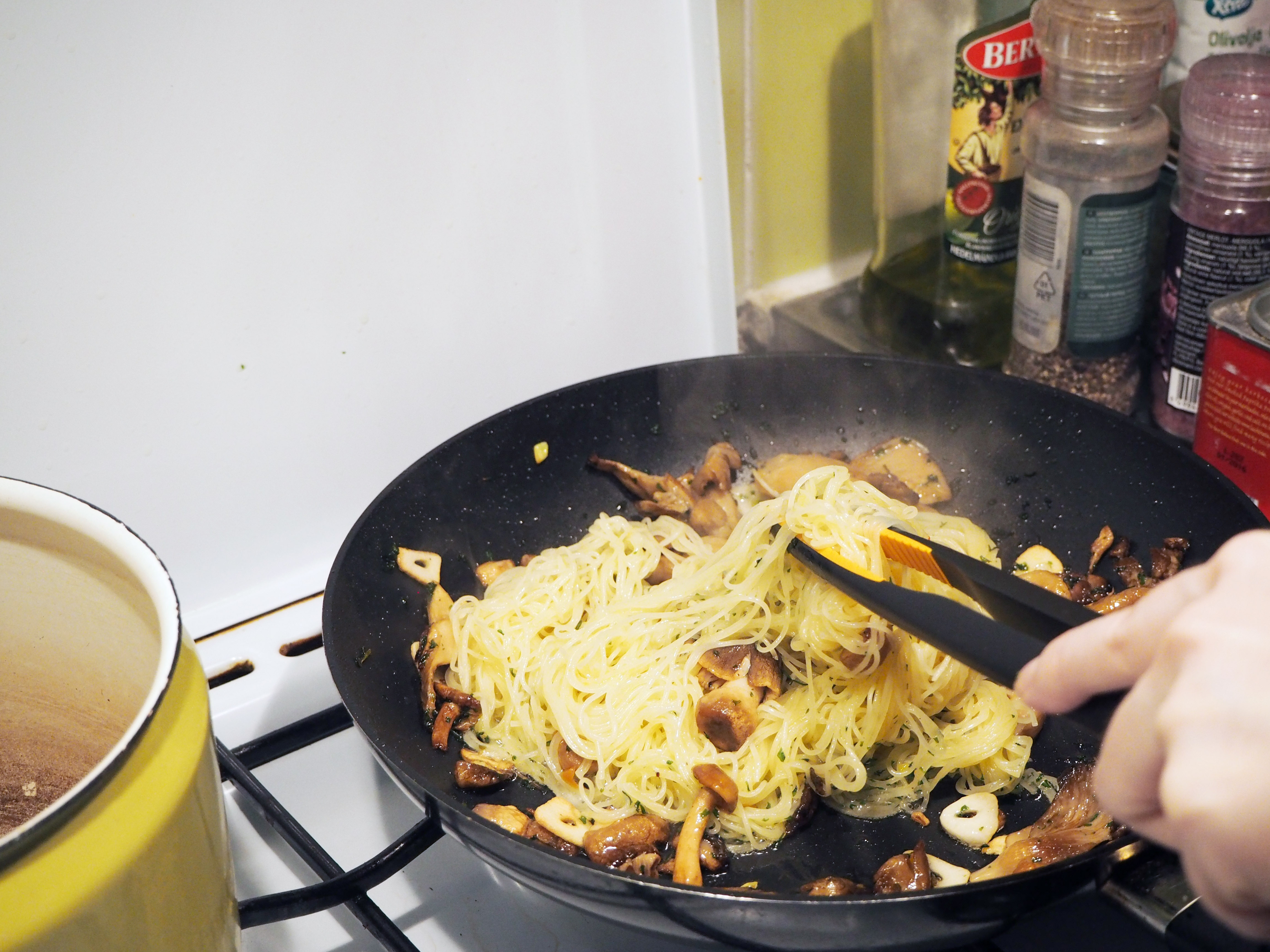 The original recipe calls for porcini mushrooms and taglierini pasta (a thinner version of tagliatelle). I used a variety of mushrooms that included oyster mushrooms, porcini and funnel chanterelle since there isn’t fresh porcini mushrooms and I used angel hair pasta. But I will definitely make that again when it is porcini mushroom (herkkutatti in Finnish) season.