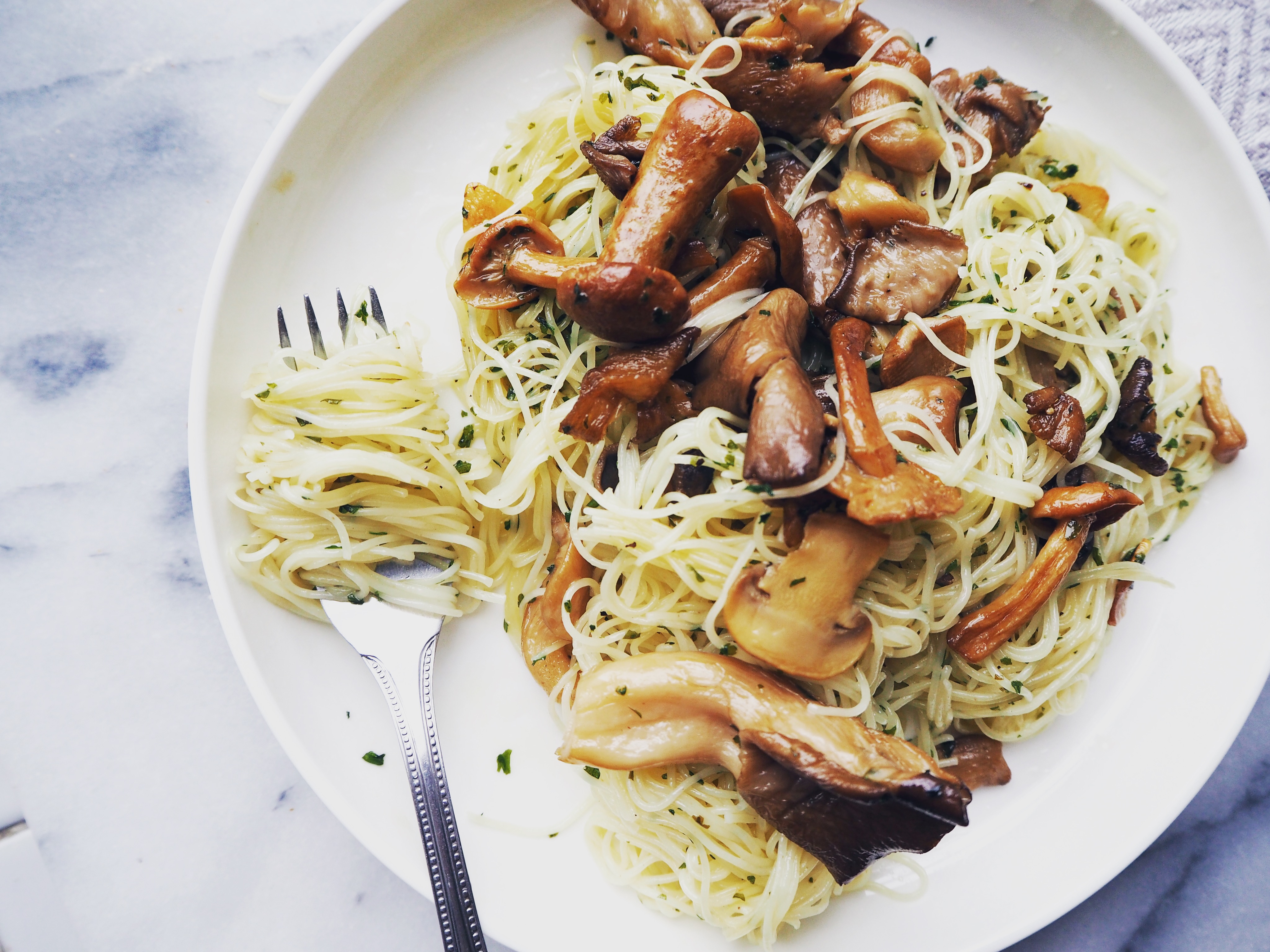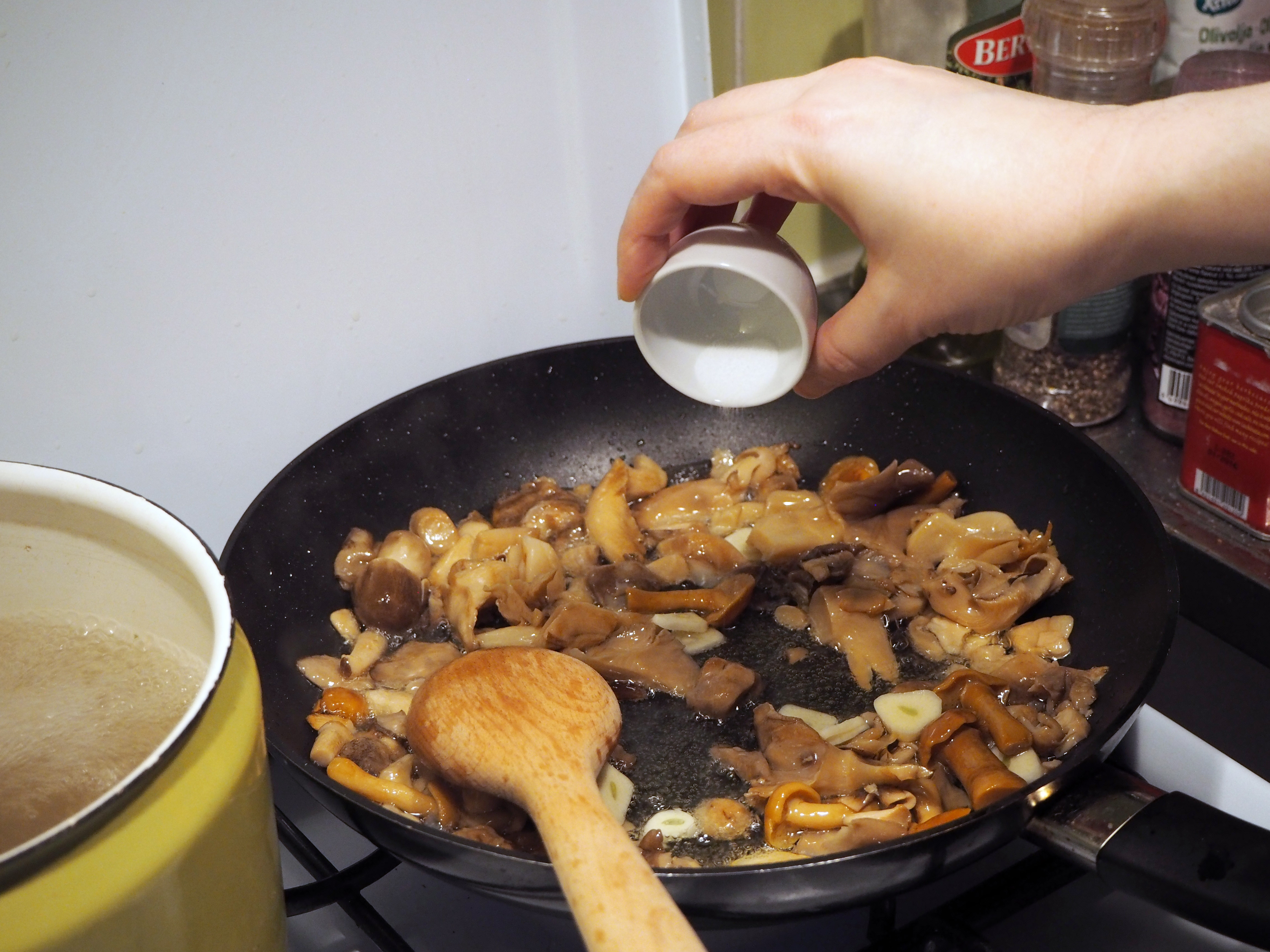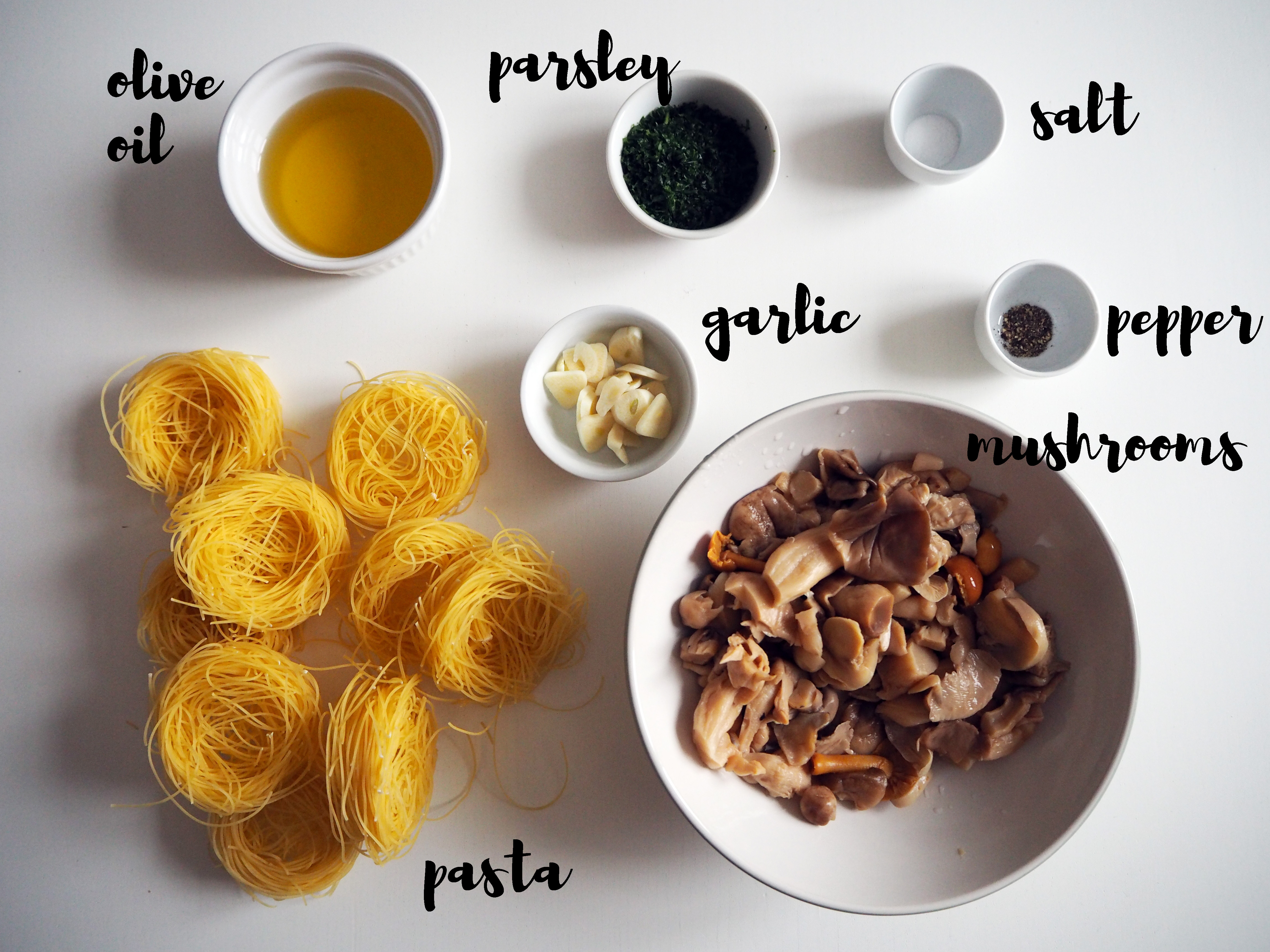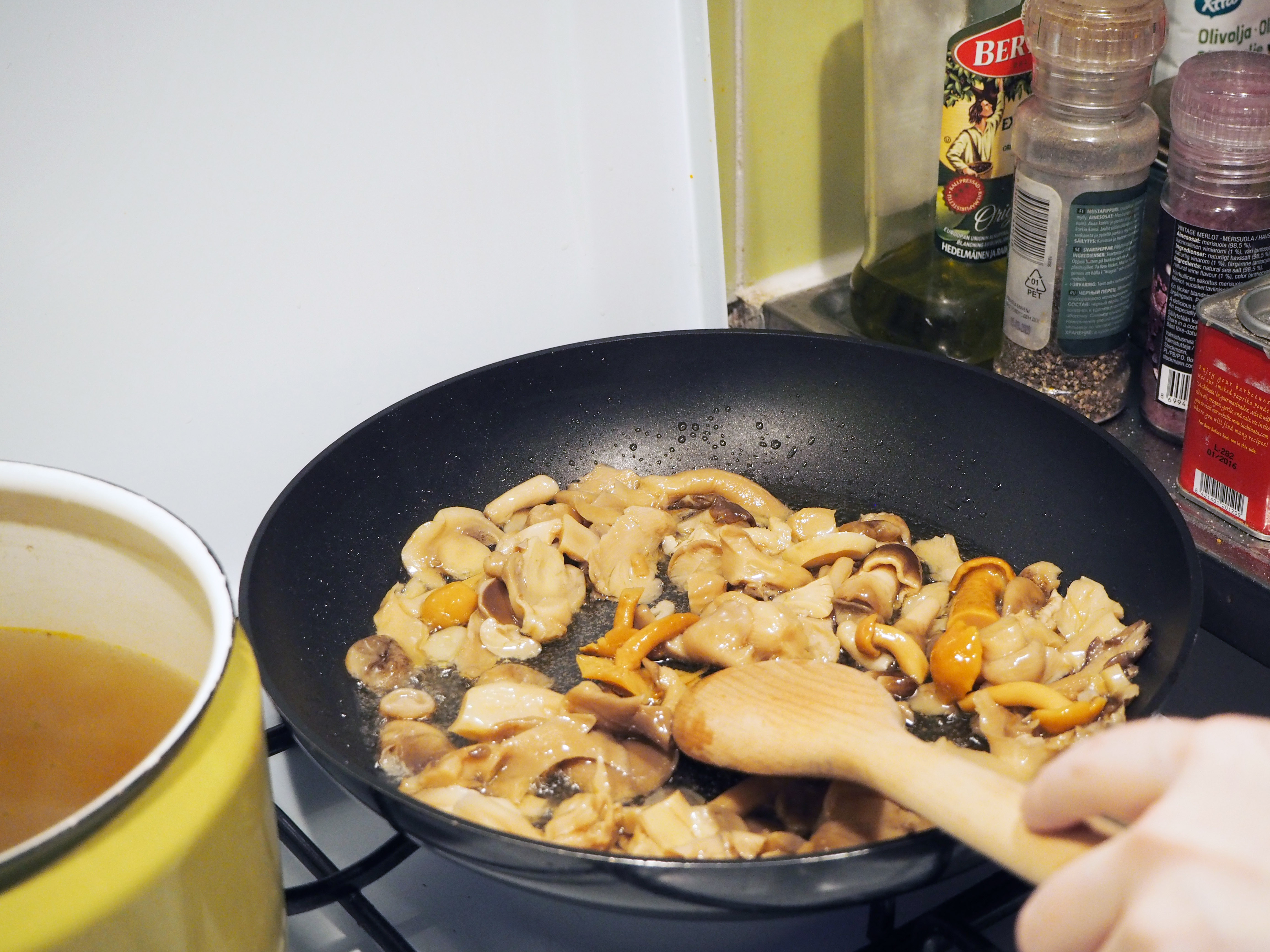 The original recipe calls for porcini mushrooms and taglierini pasta (a thinner version of tagliatelle). I used a variety of mushrooms that included oyster mushrooms, porcini and funnel chanterelle since there isn’t fresh porcini mushrooms and I used angel hair pasta. But I will definitely make that again when it is porcini mushroom (herkkutatti in Finnish) season.