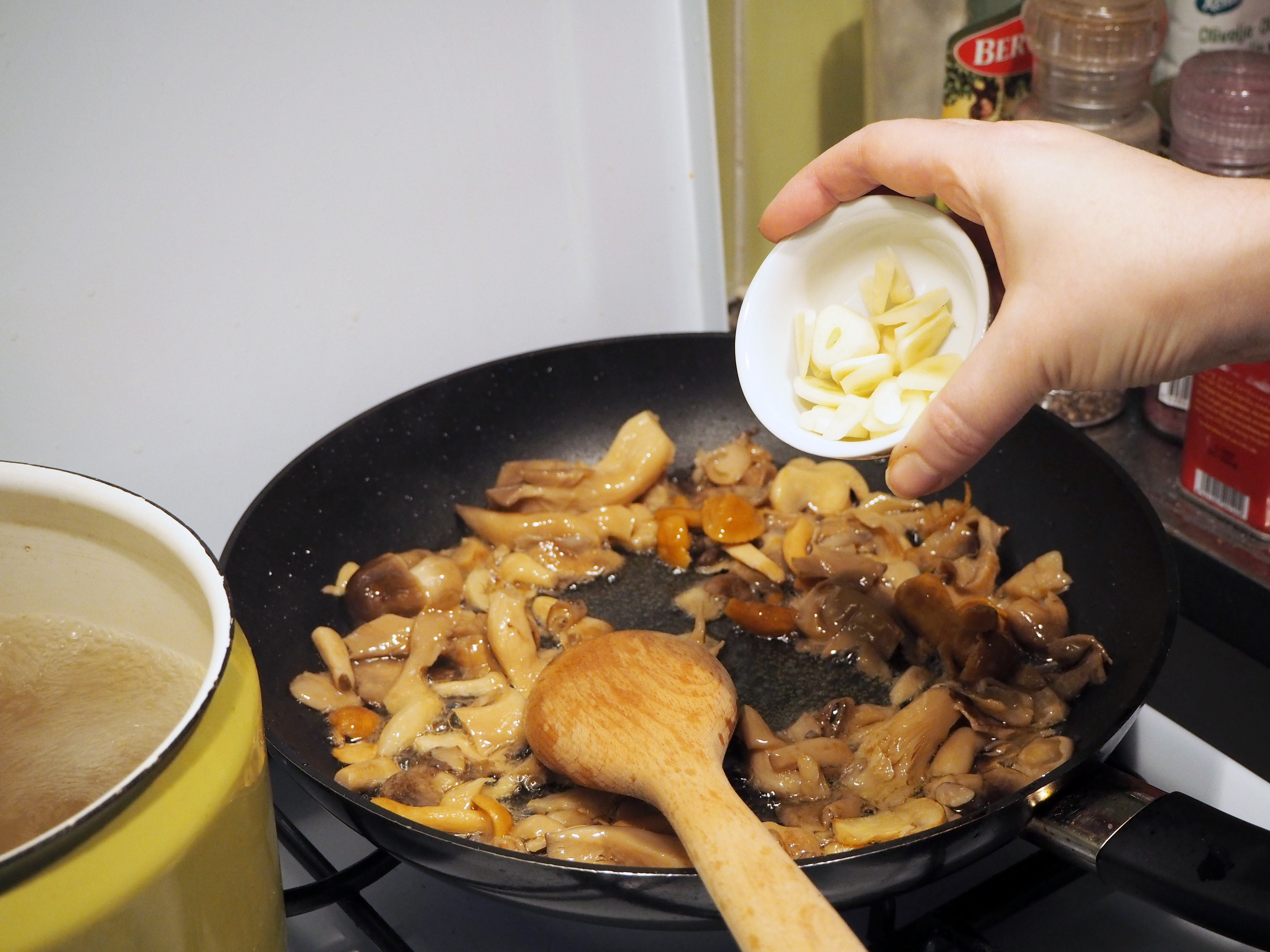 1. Boil a pot of water for the pasta. Angel hair pasta cooks just in 3 minutes so you can first boil the water while cooking the mushrooms (if you are using another kind of pasta, please check cooking instructions on the package). For the water I partially used vegetable broth – I had just a little bit homemade vegetable broth left and I thought using it would add a great taste, however you can use plain water.