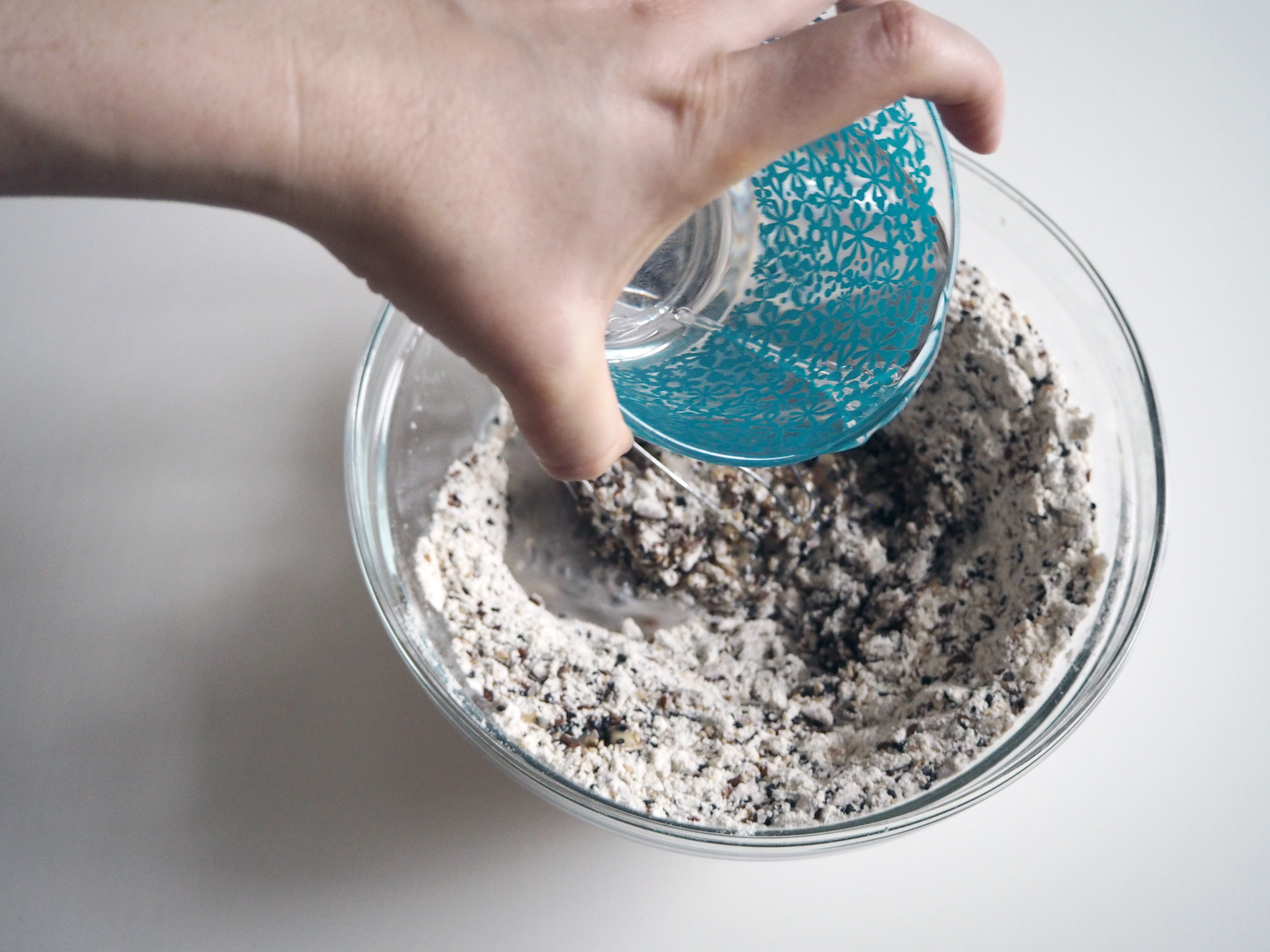 4. Add olive oil and water and whisk until all dry ingredients are moist.