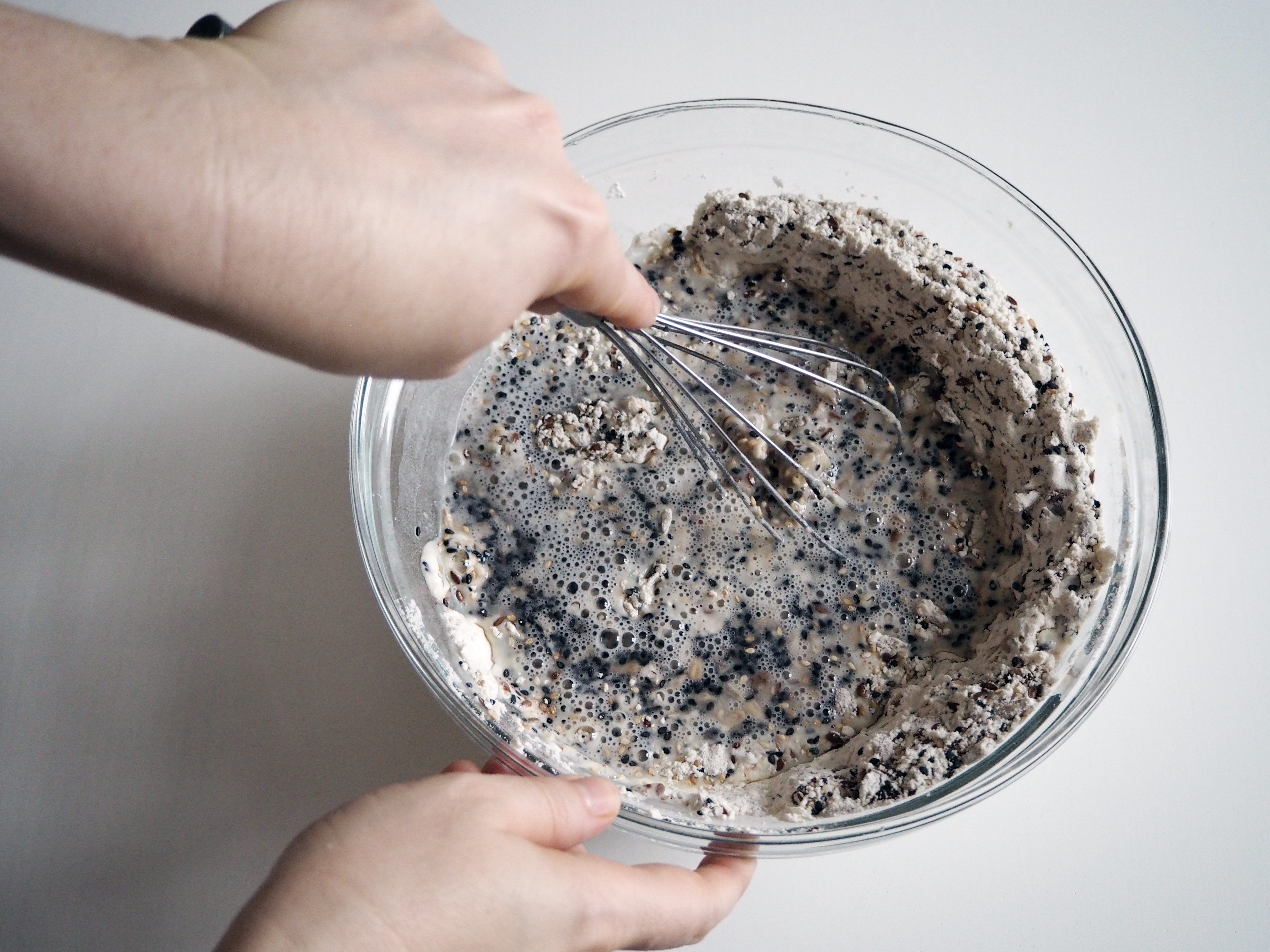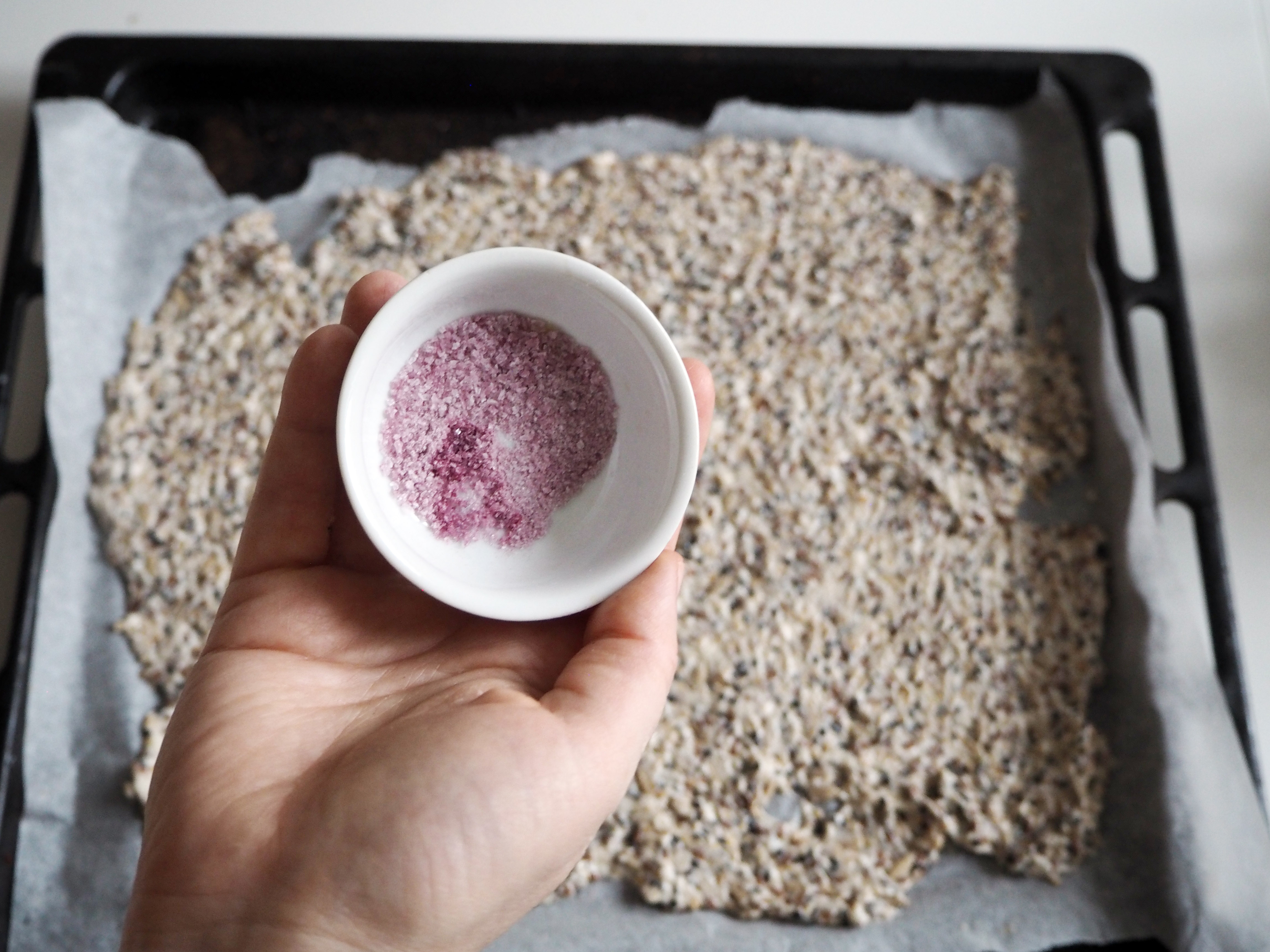 So instead of the smoking salt, I used my new favourite vintage merlot sea salt that I bought from Stockmann about two months ago. It is a blend of sea salt with wine powder and natural wine flavours. On the package, it says that it is especially a good match with steak and poultry, but I’ve been using it for many different dishes, including bread like this one.