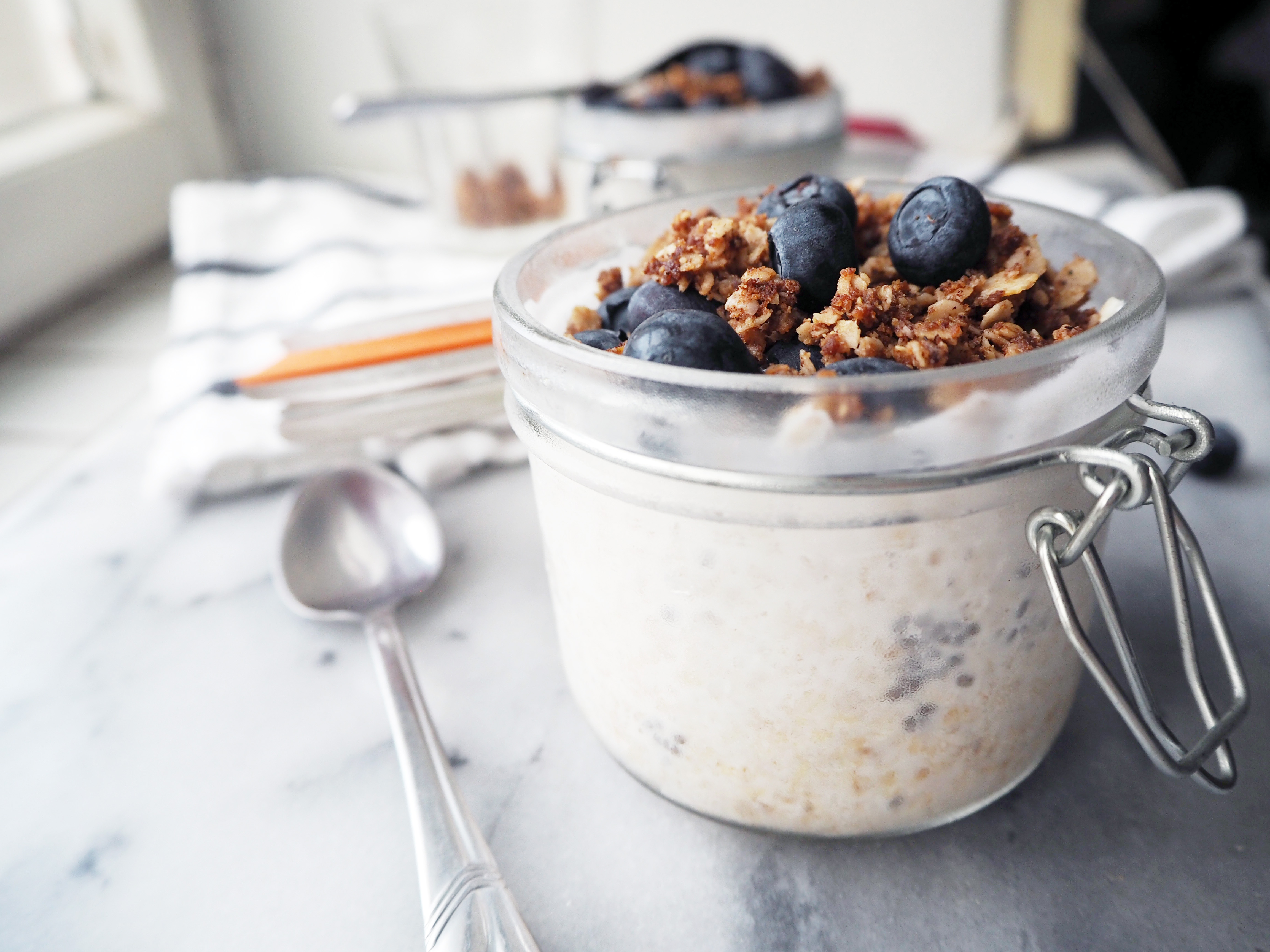 4. Take the jars out of the fridge and stir a bit. Put some fresh (or frozen) blueberries and the baked topping on top. You can also put some blueberry jam in between. Enjoy!
