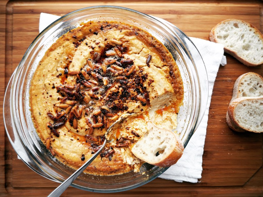 8. Pour line nut/butter/red pepper mixture on creamy hummus mixture (try to spread as evenly as possible). Put in the oven, in medium rack and bake for 20 to 25 minutes, until at least half of melted butter is absorbed by hummus. Serve immediately after taking out of the oven with warm, crusty bread slices. Enjoy!