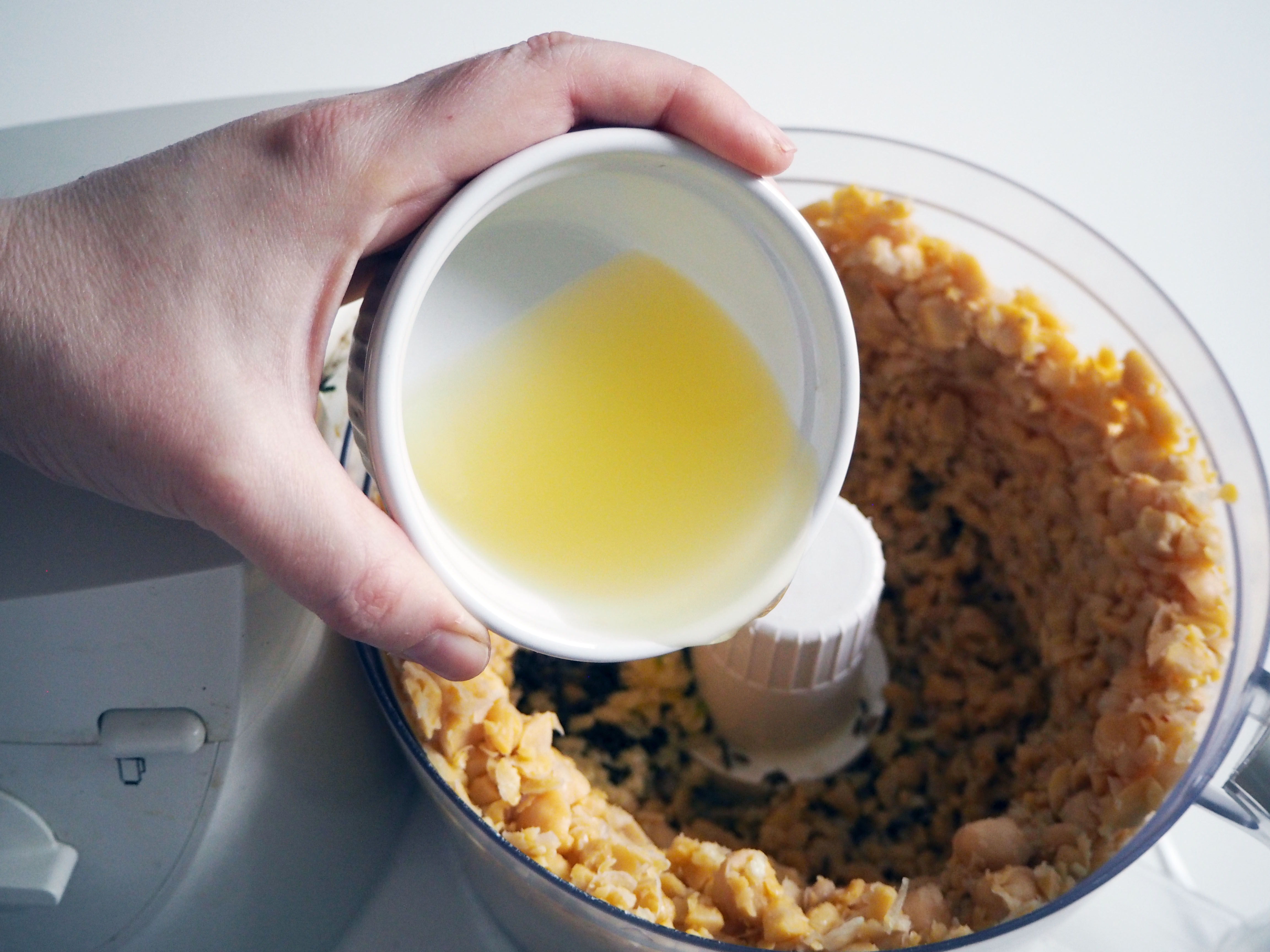 3. Add cumin seeds, crushed garlic, olive oil and lemon juice and process more.