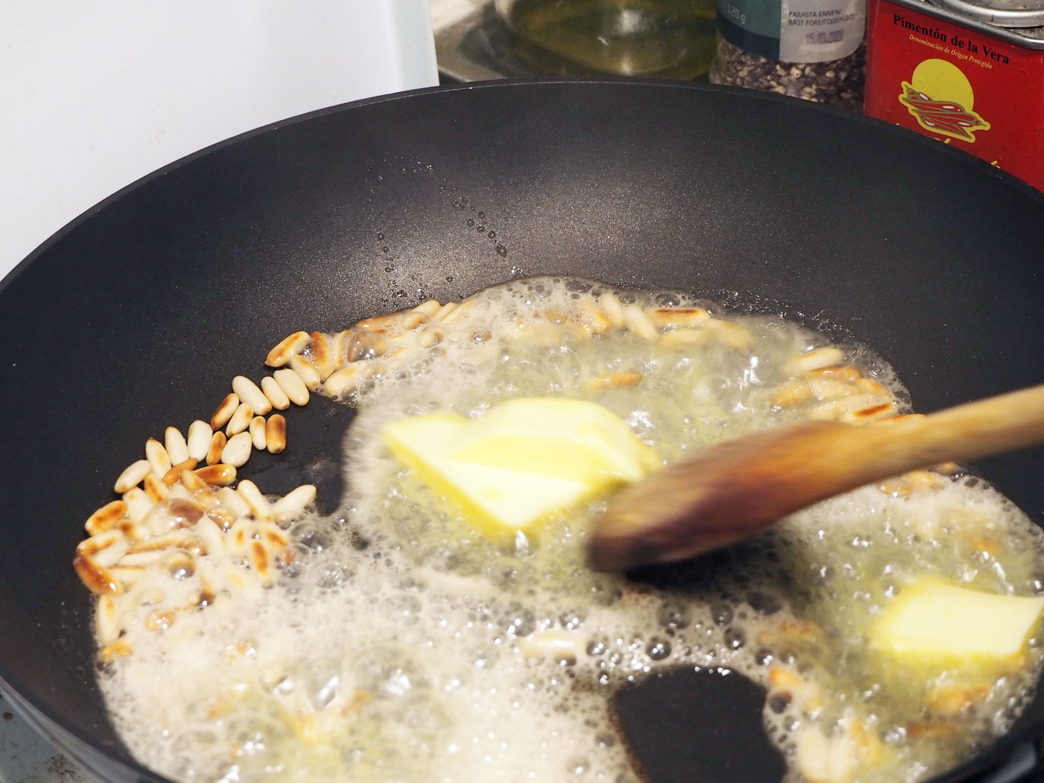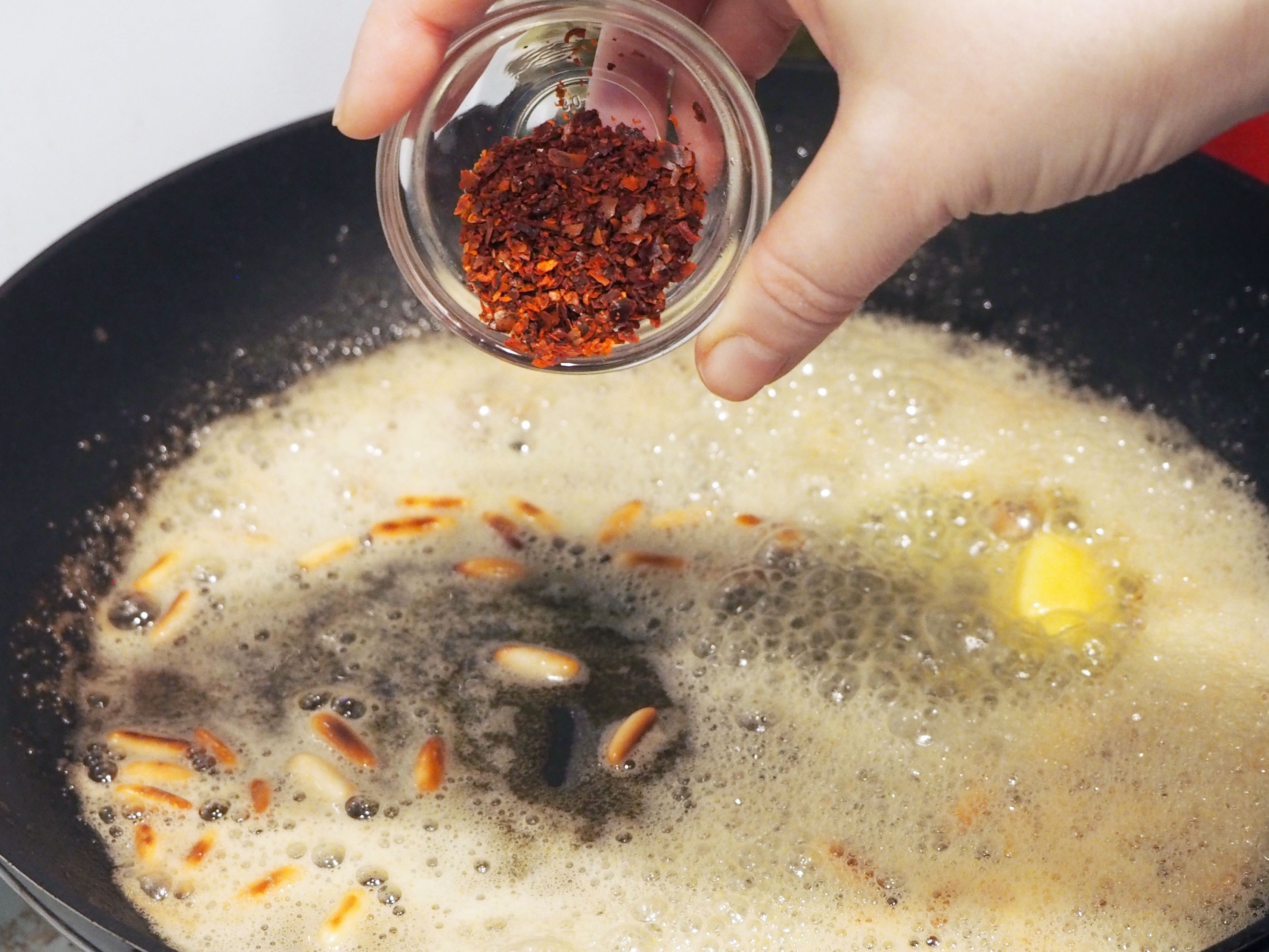 7. In a medium size frying pan on medium heat, put pine nuts and roast them until they begin to brown and release their aroma. Add butter and stir until it melts (if you are doing vegan version, add coconut oil and melt it, or add canola oil and warm it together with roasted pine nuts). If using, add red pepper flakes and stir for half a minute maximum (do not burn the pepper).