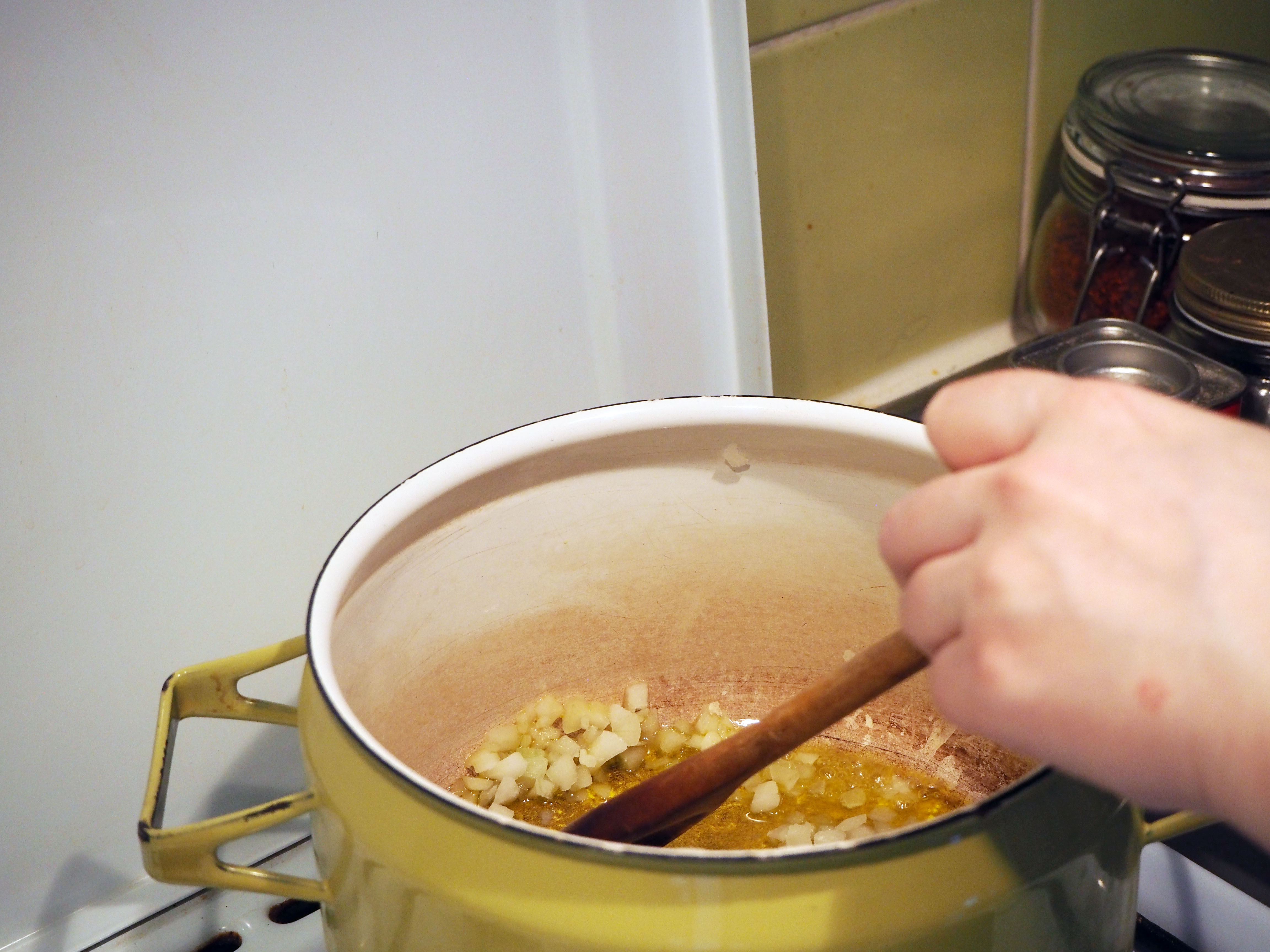 1. In a soup pot, add olive oil on medium high heat for about half a minute. Add onion and sauté until it is translucent, for about 5 minutes.