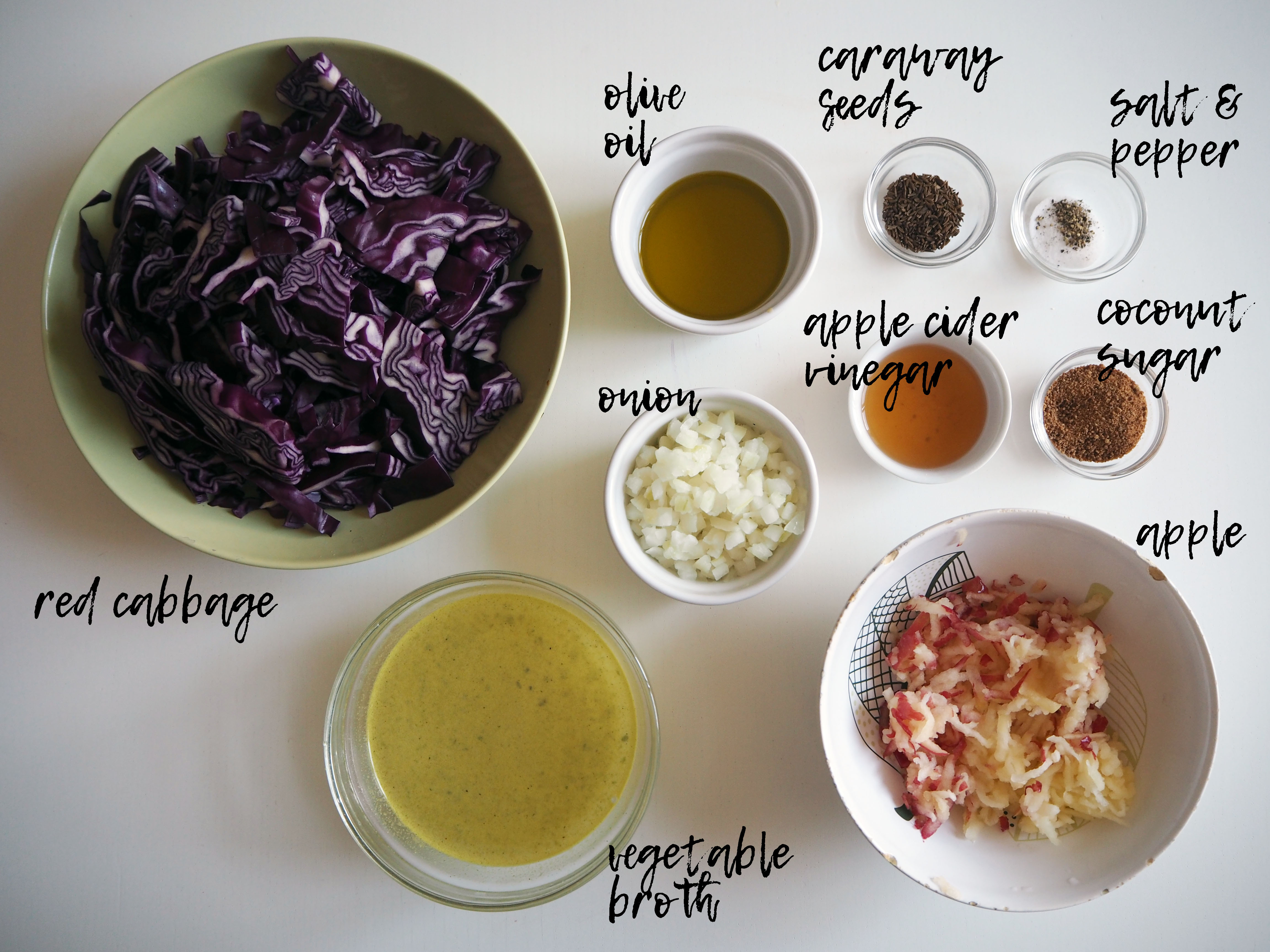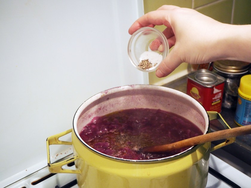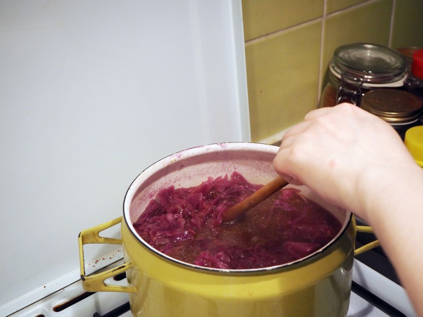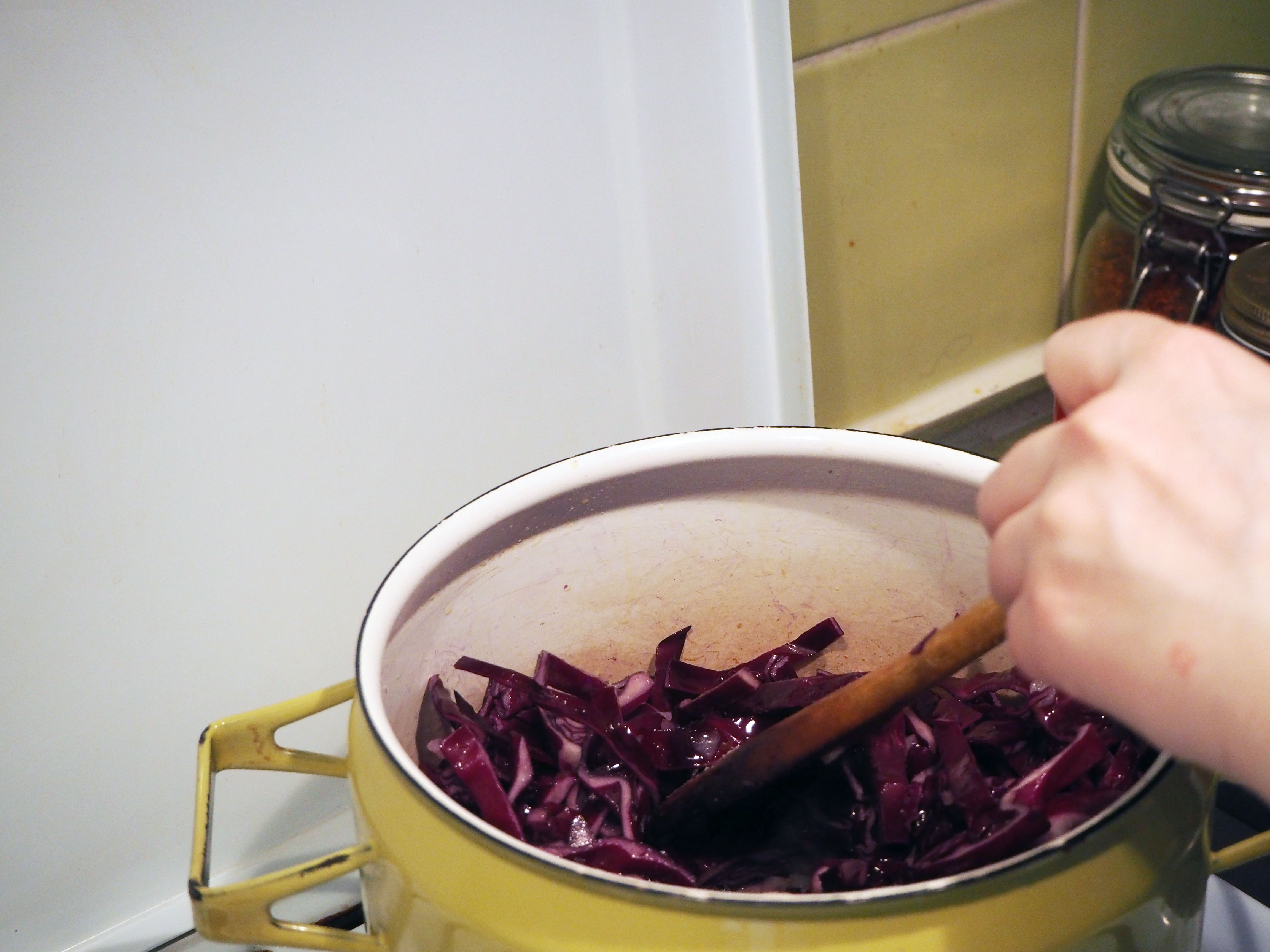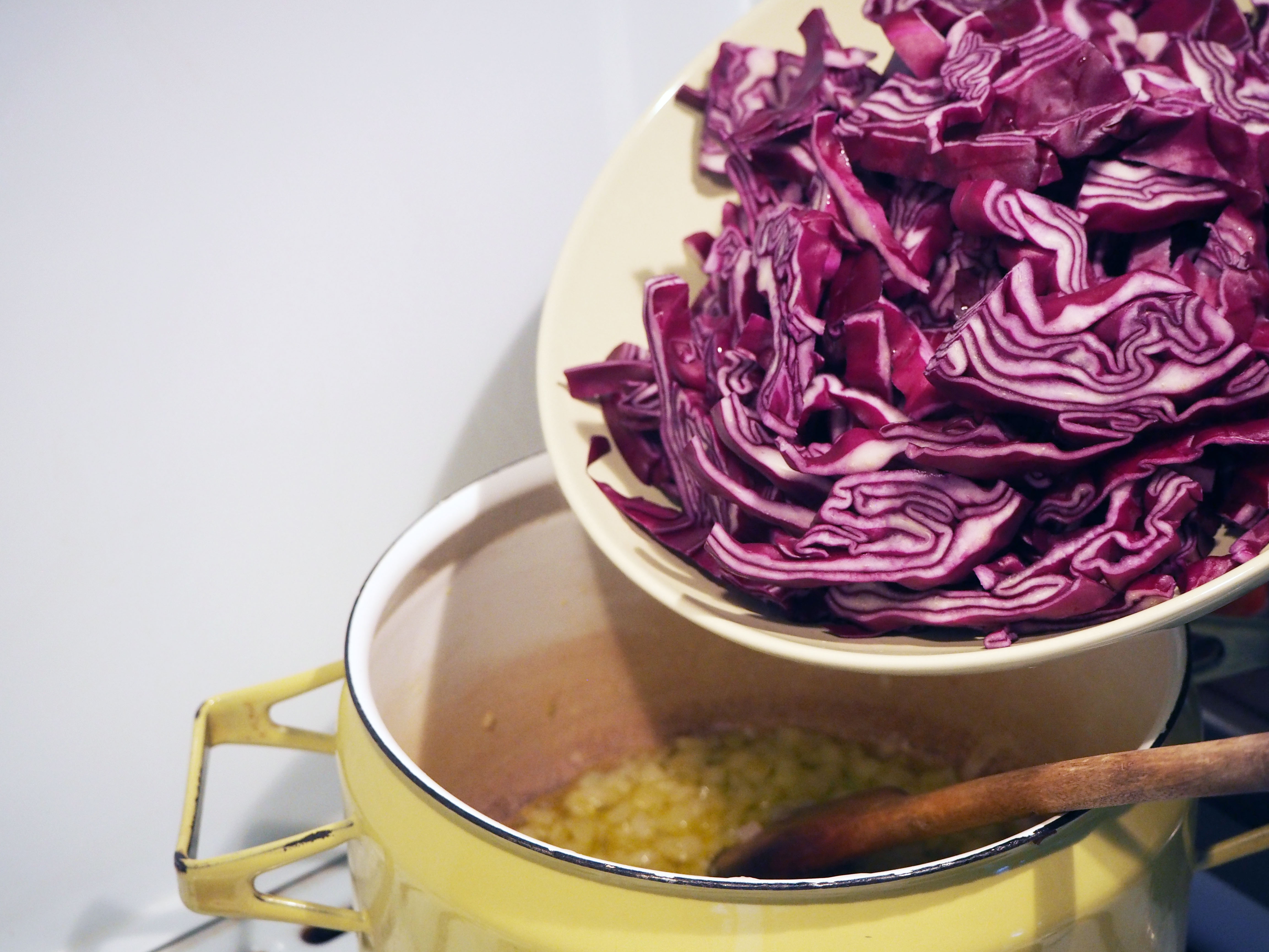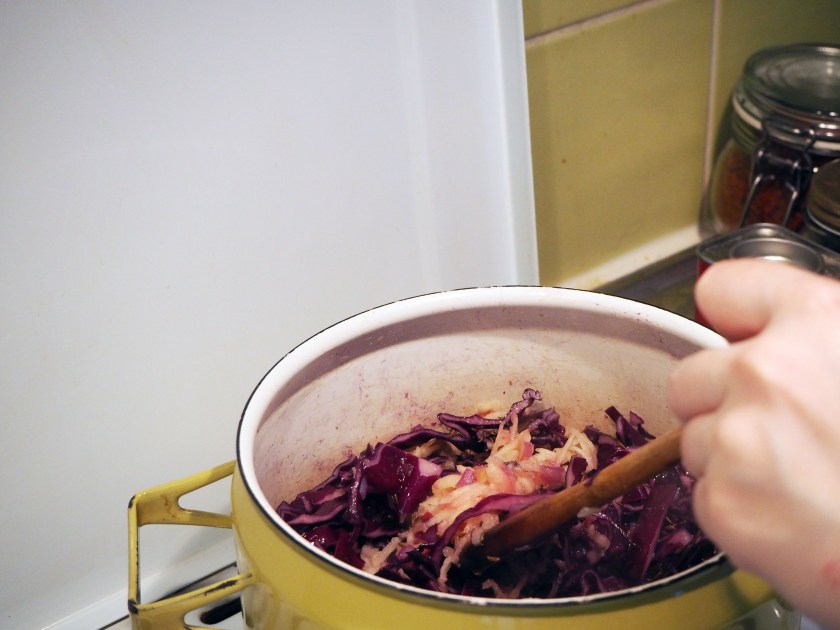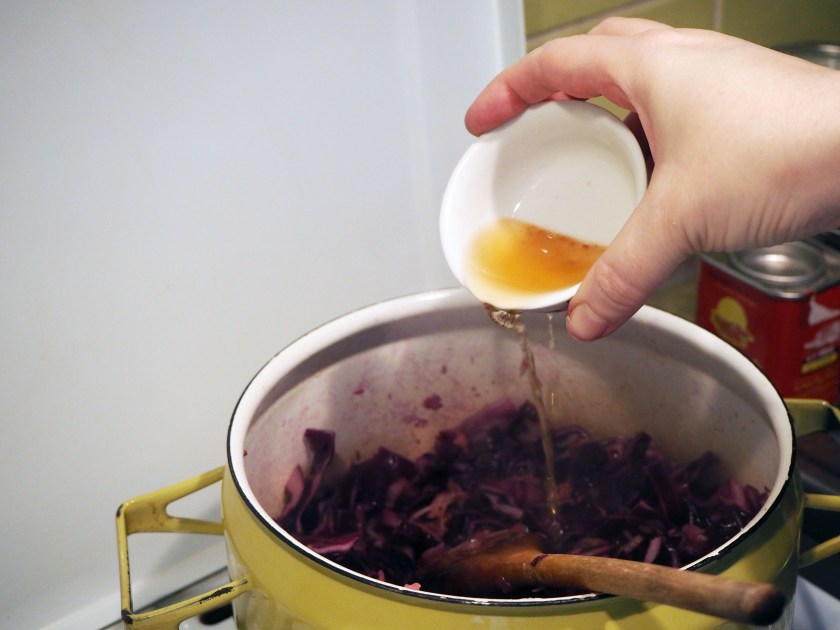 450 gr. red cabbage, first quartered then sliced thinly (or grated)