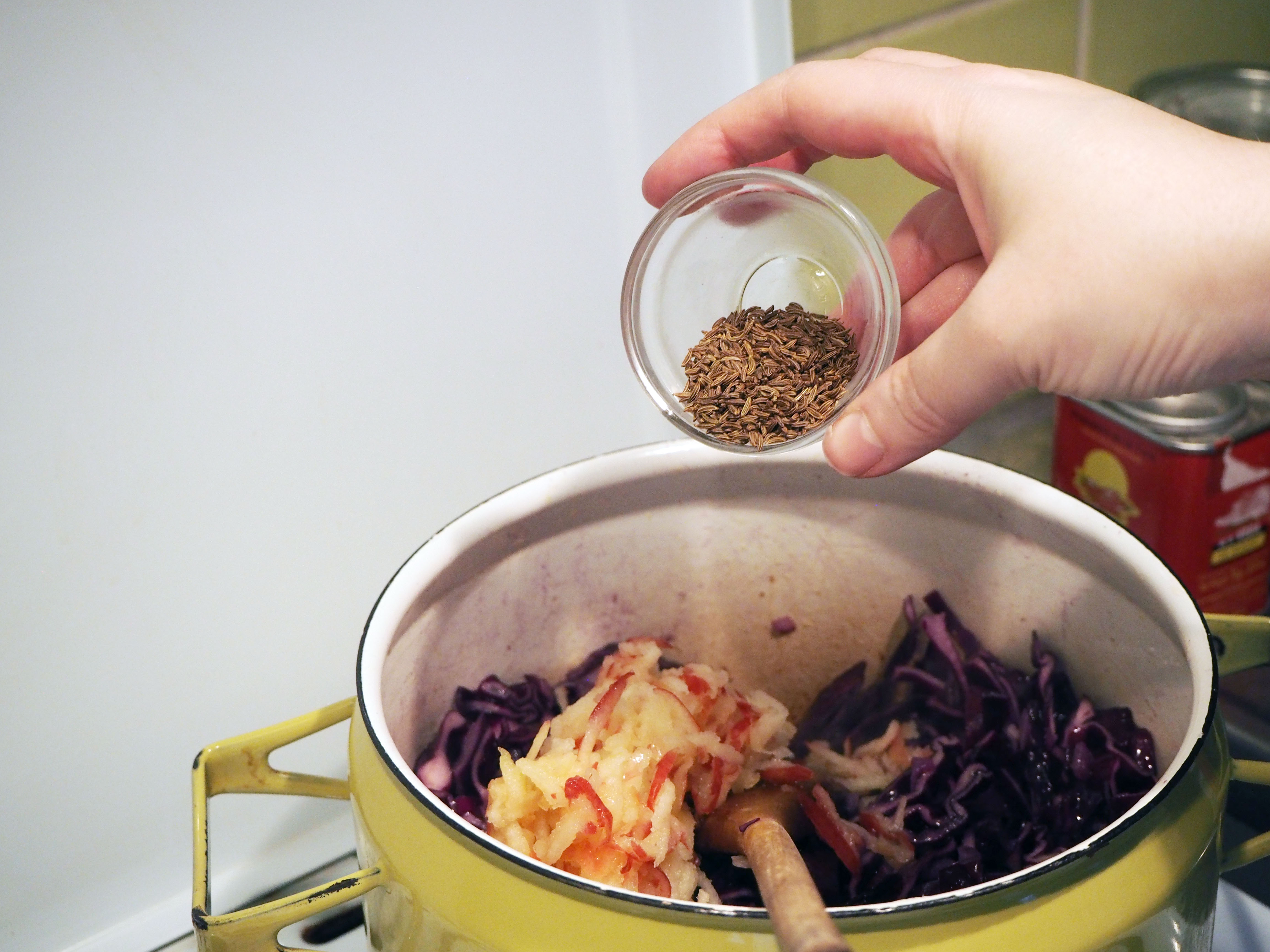 3. Add apple and caraway seeds and continue to cook for 1 more minute by continuously stirring.