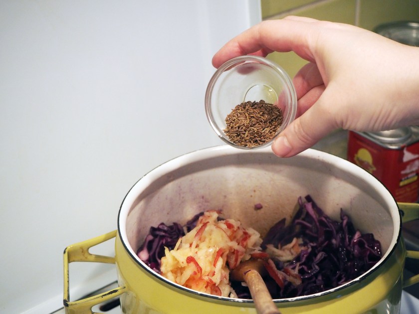 Red cabbage may cause flatulence and bloating for many people to be honest. However, the use of apple cider vinegar and caraway seeds in this recipe takes care of this problem significantly. Other seeds you can use, if you are not a fan of caraway seeds, are cumin seeds or fennel seeds, each changing the taste slightly with their own distinct aromas.