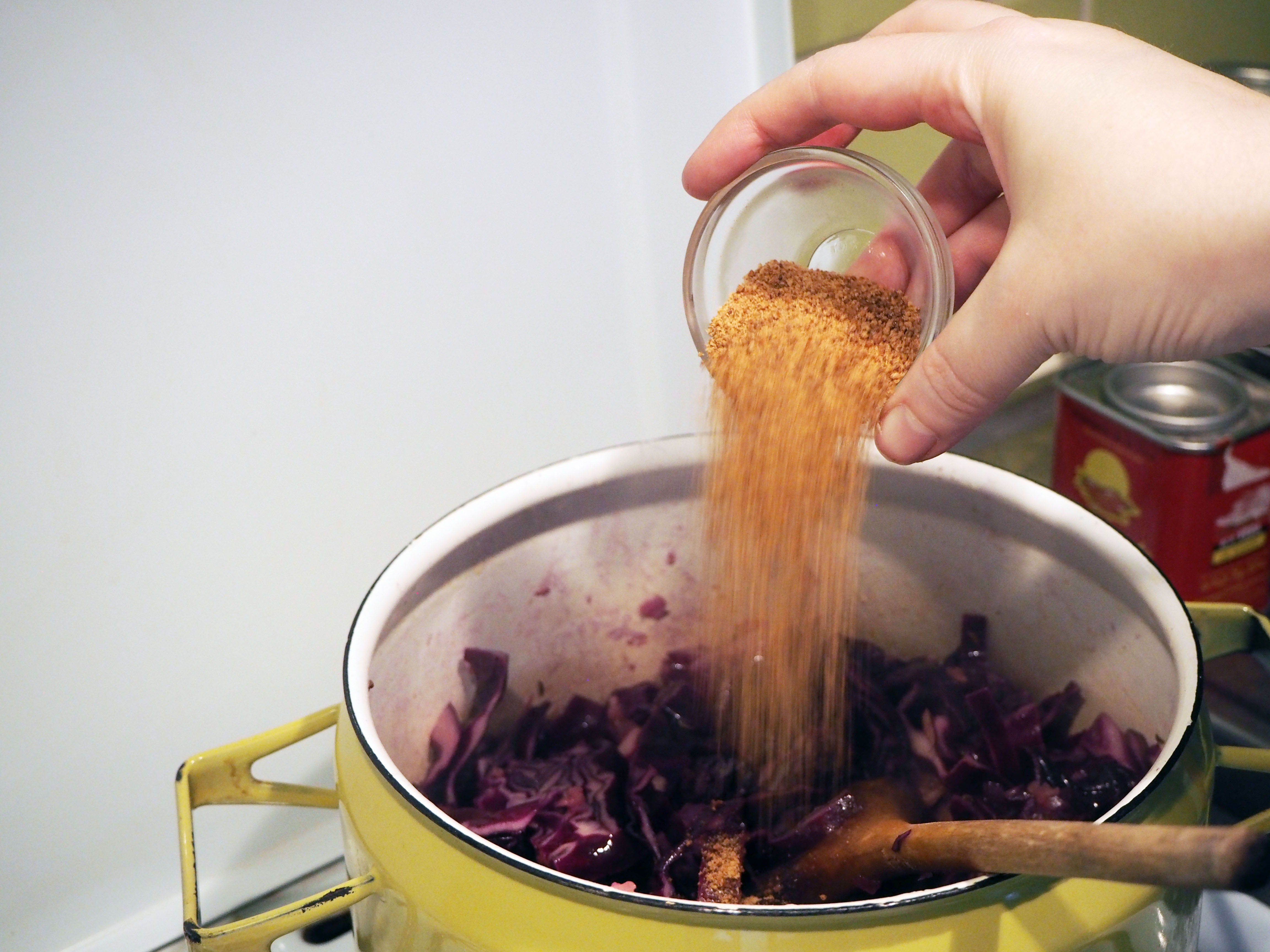 4. Add apple cider vinegar, sugar and about 2 dl of broth/water, cook for 5 minutes by stirring frequently.