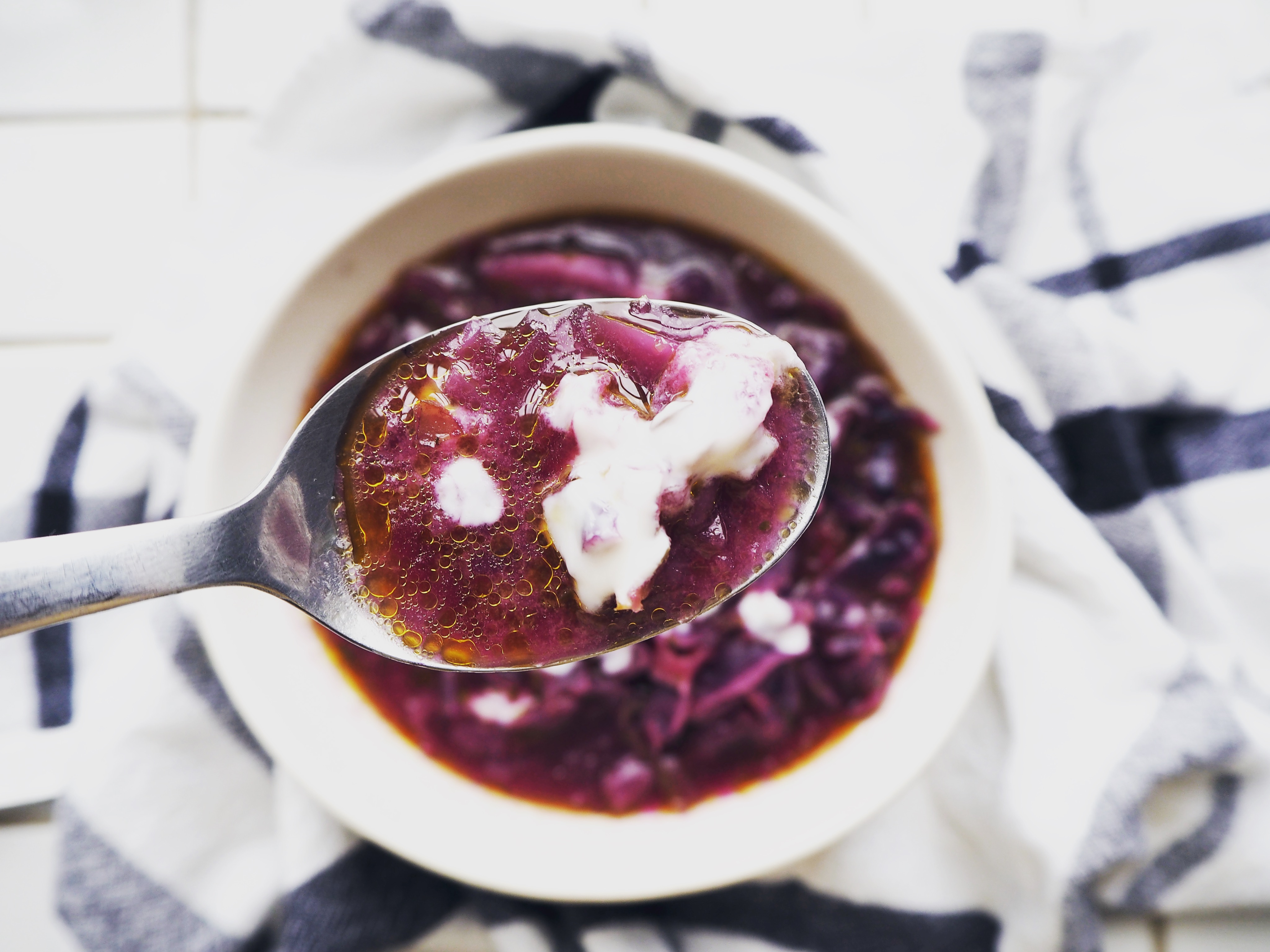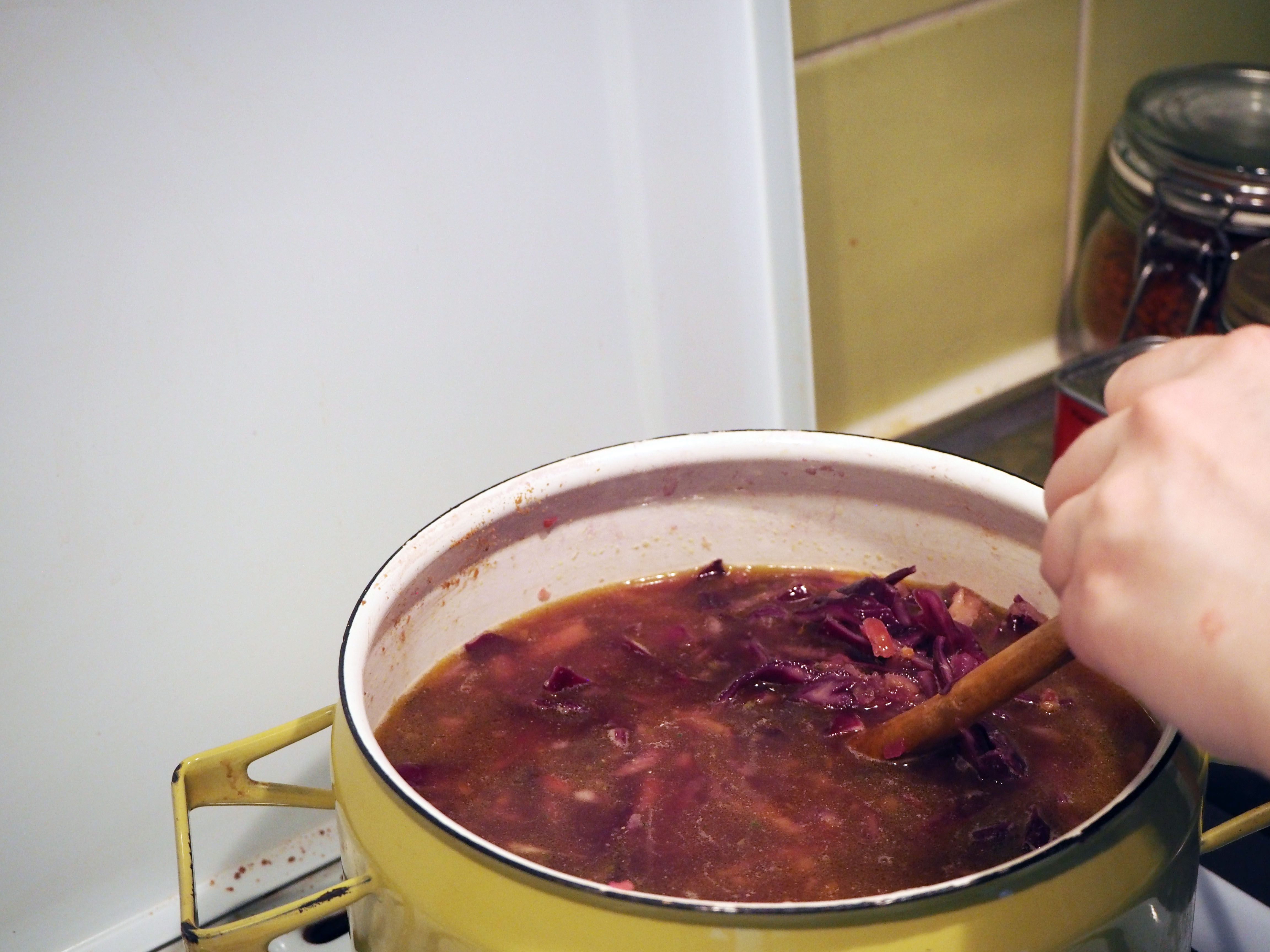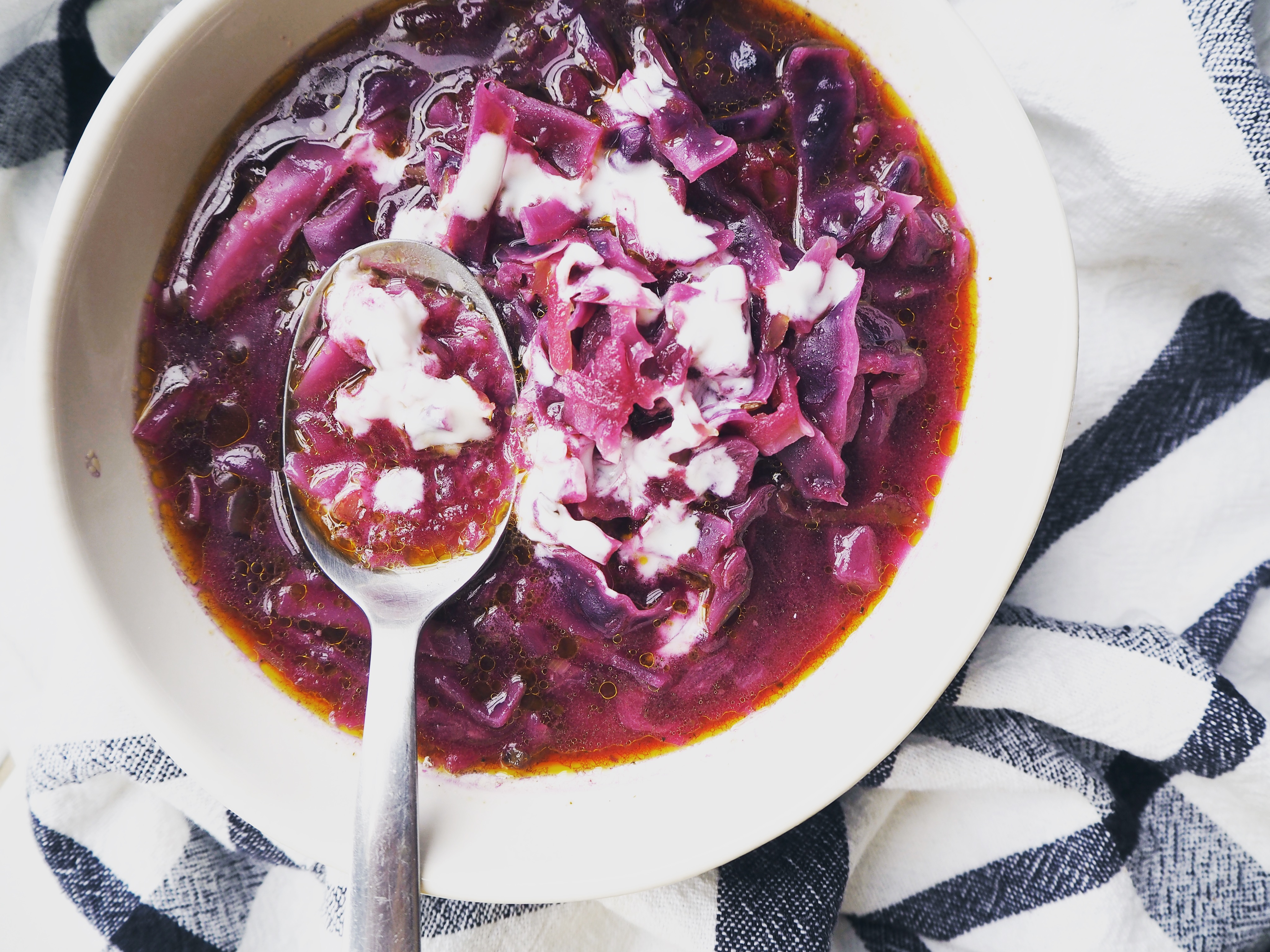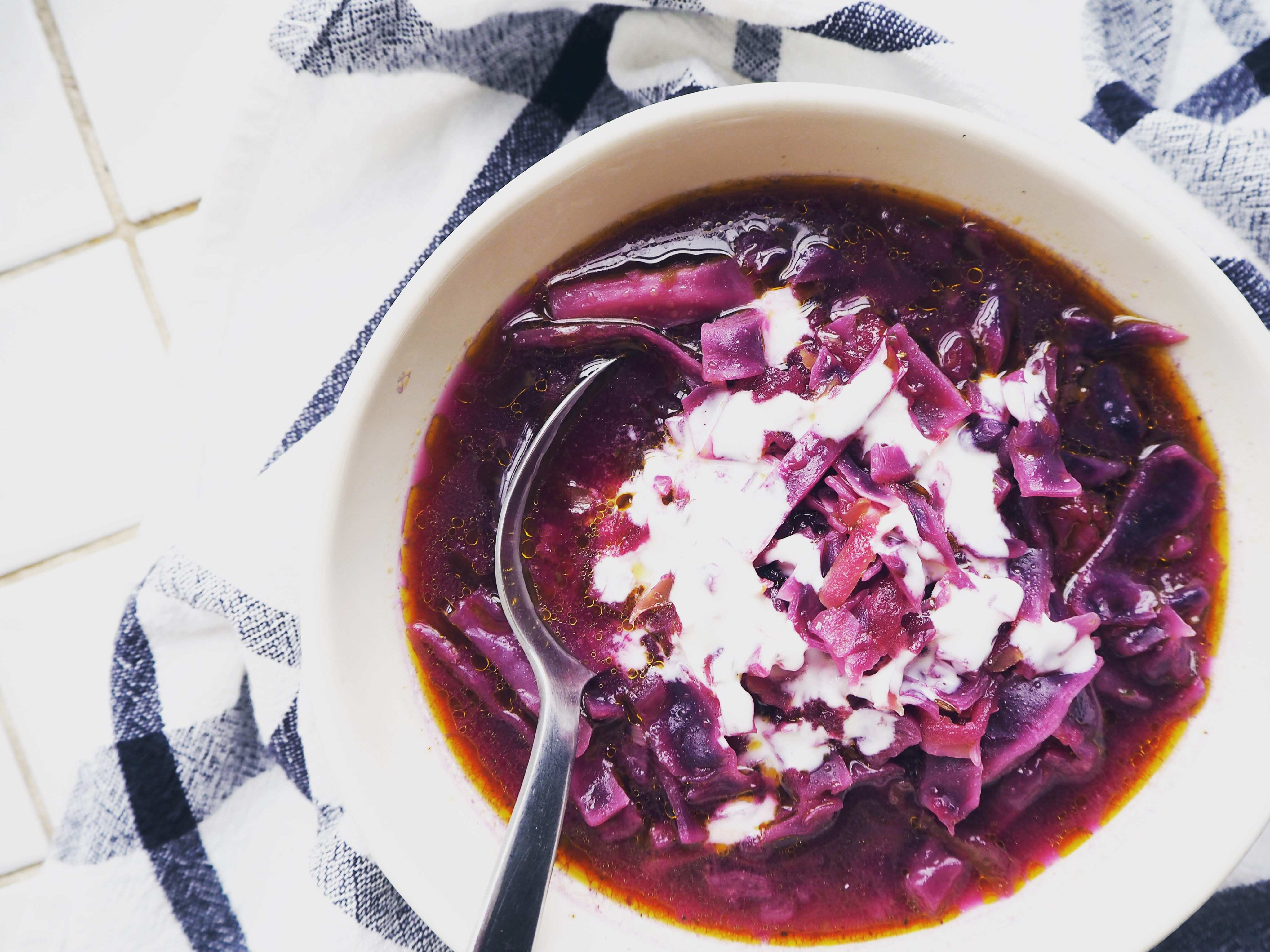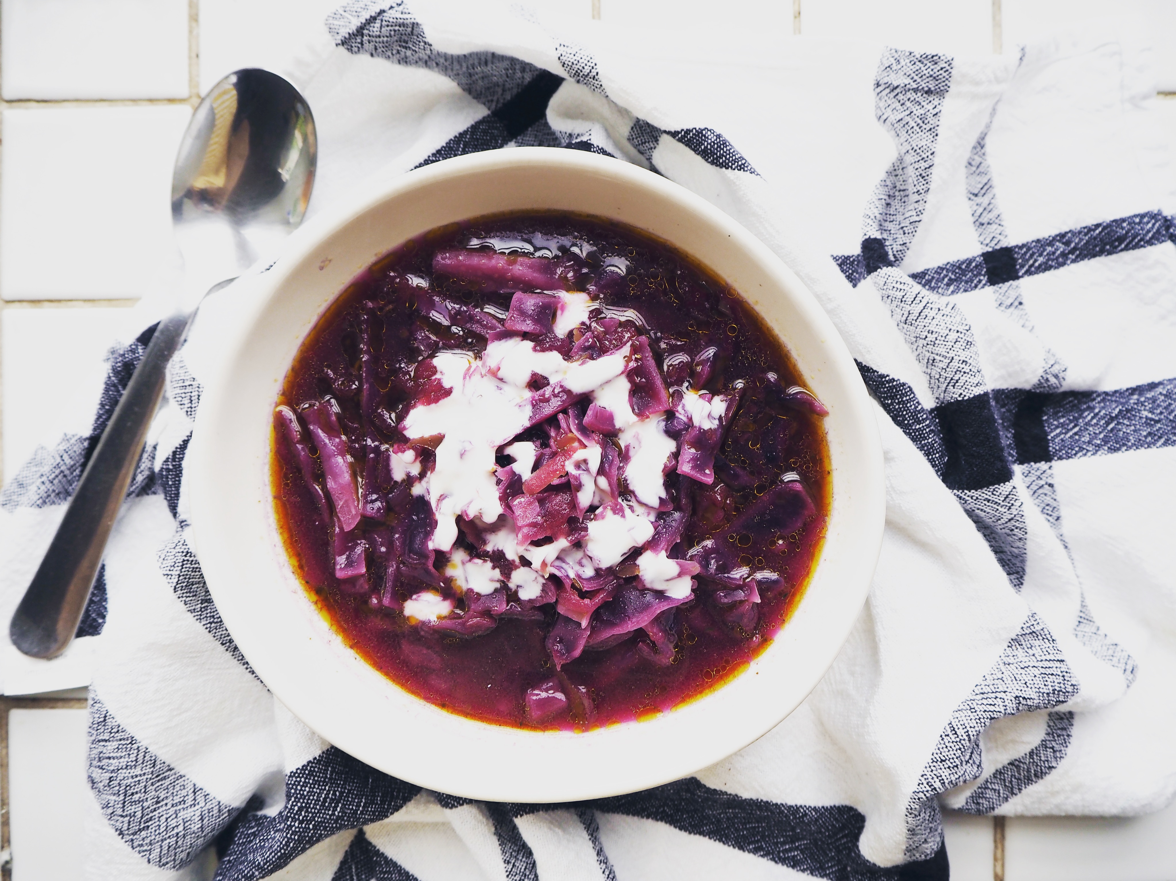 Red cabbage. A vegetable which is rather foreign to me. Sure I ate it many times in salads, but when it comes to using it as an ingredient myself, well, we generally look at each other in the market for a few minutes and then I move forward to another vegetable, continuing our mutual indifference. This weird relationship ended with this soup.