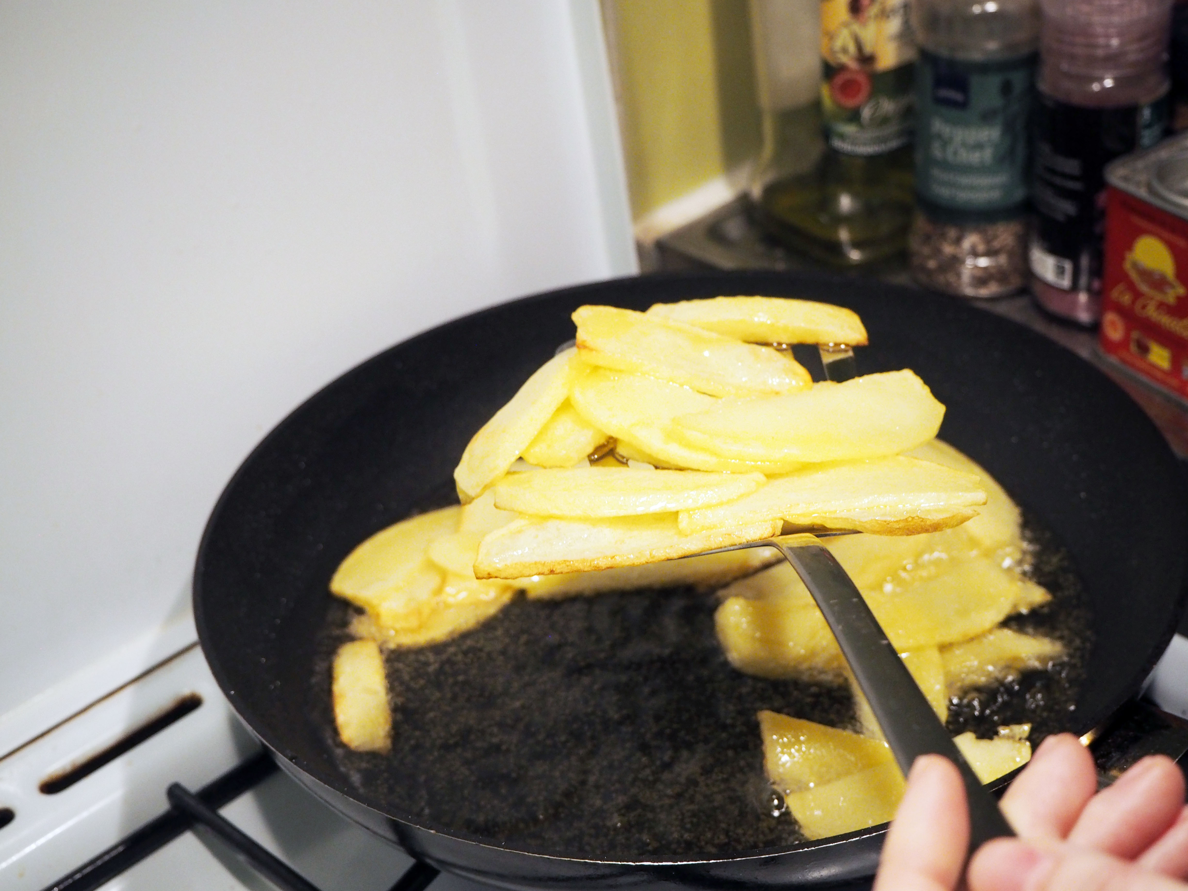 2. When the oil is hot, put potatoes and cook until they are just lightly golden and softened. Take them out of the pan (do not turn off the heat) and put on a paper towel to get the excess oil out.