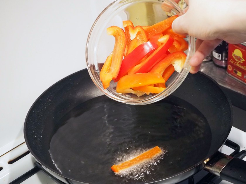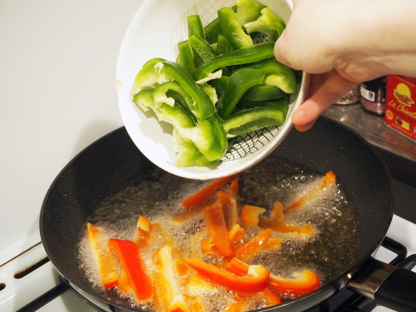 3. In the same pan, put bell peppers and start frying them, for about 2-3 minutes, until they are just cooked. Take them out of the pan (keep the heat on) and put on another paper towel.