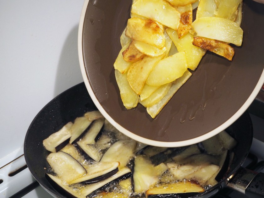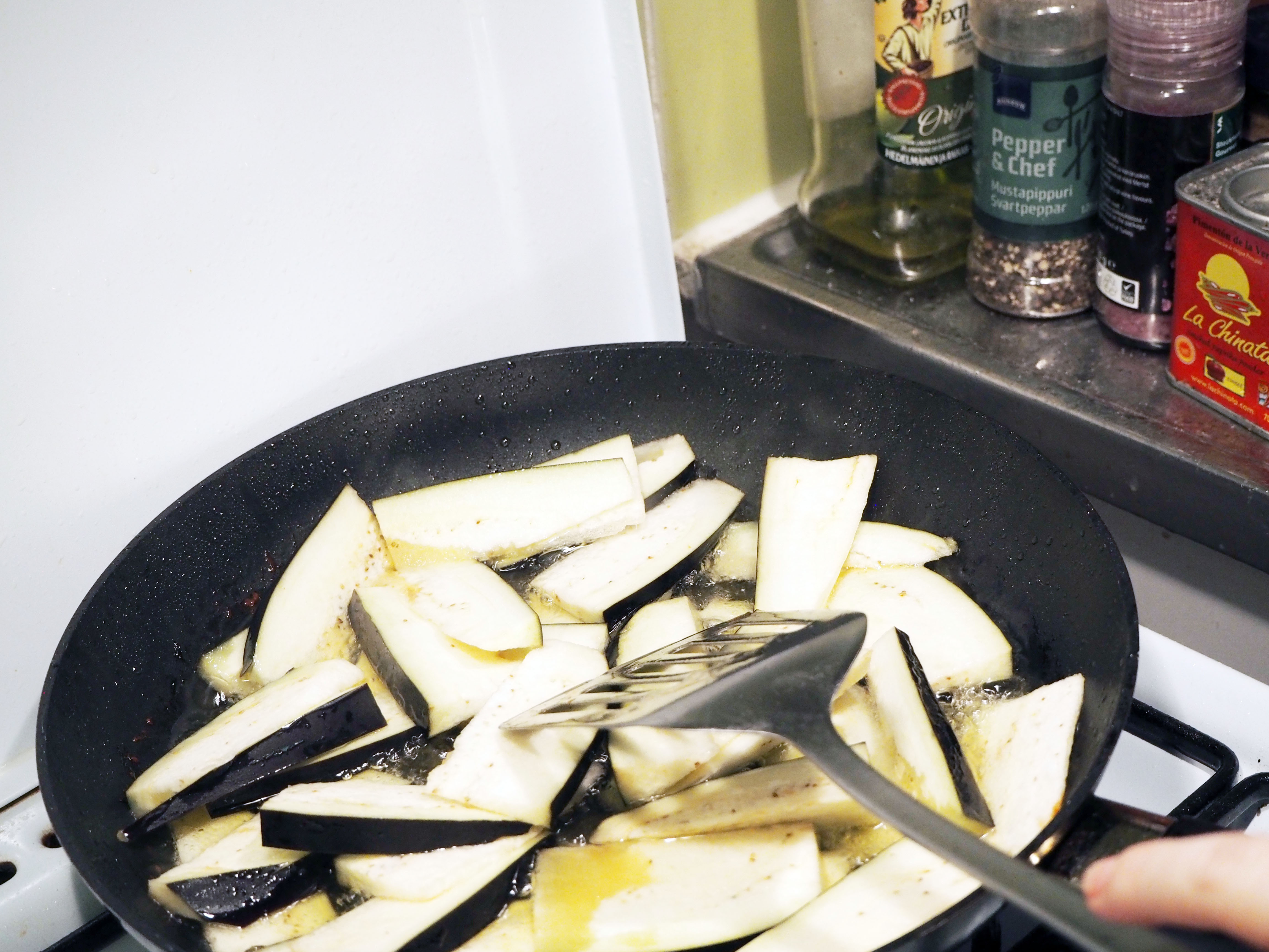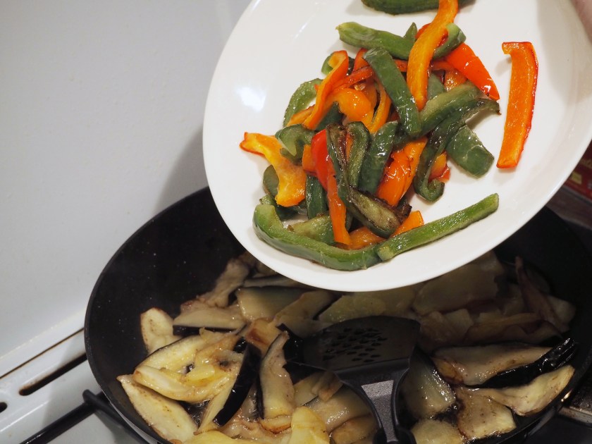4. While peppers are frying, drain and pat dry eggplants. Put them in the pan after you take bell peppers out and fry them until they are just cooked but are not too brown.