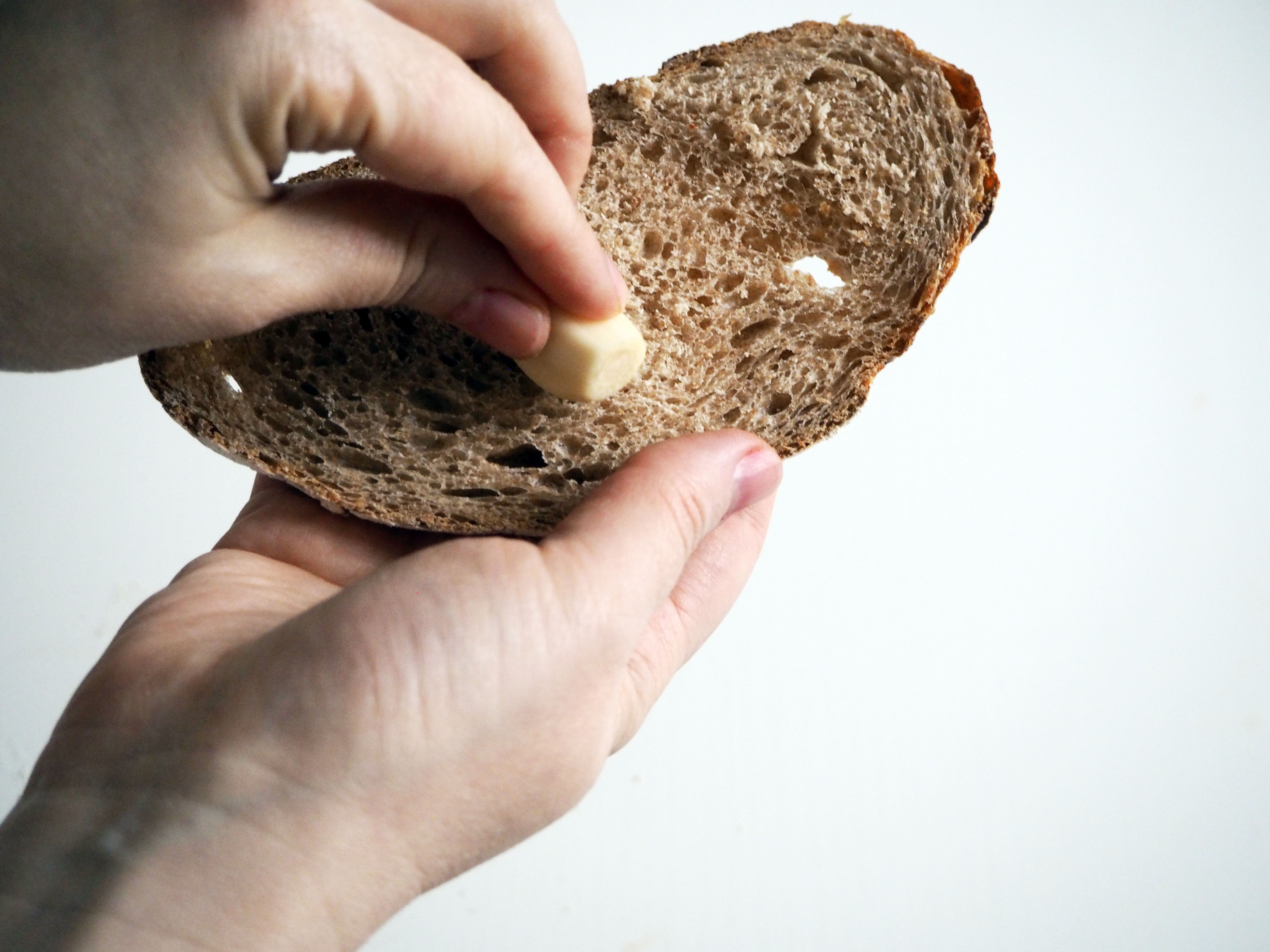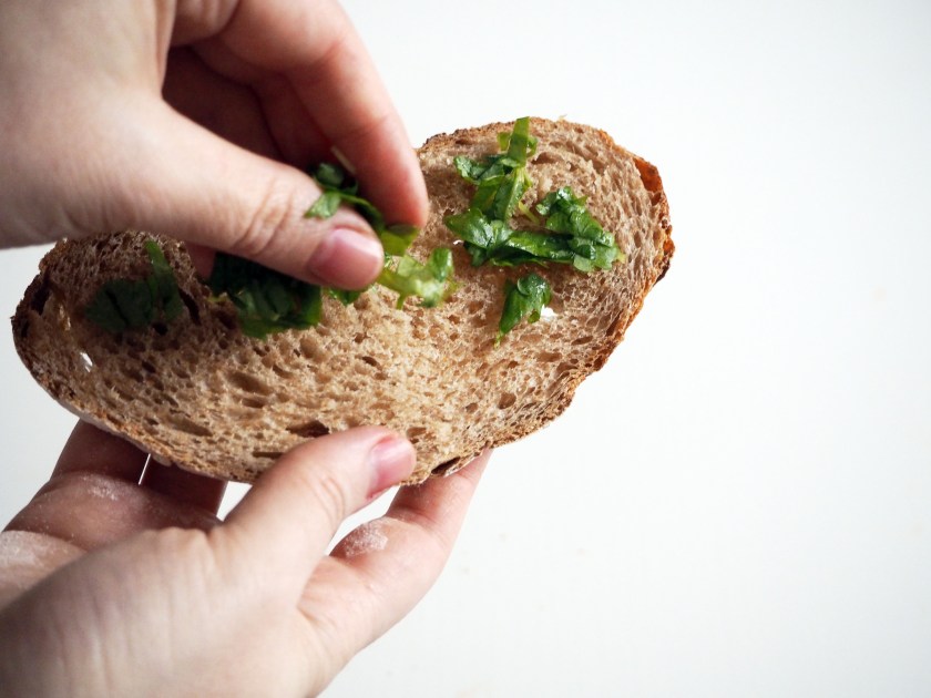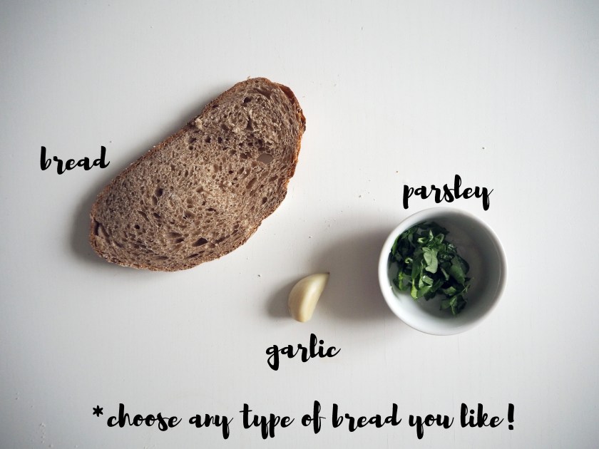 8. Prepare bread slices, very simple: rub one garlic clove on one side of each slice. Spread finely chopped parsley on the same, garlicky side and drizzle with olive oil. Done! Enjoy!