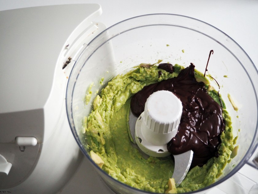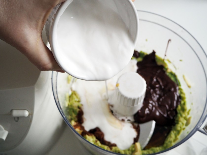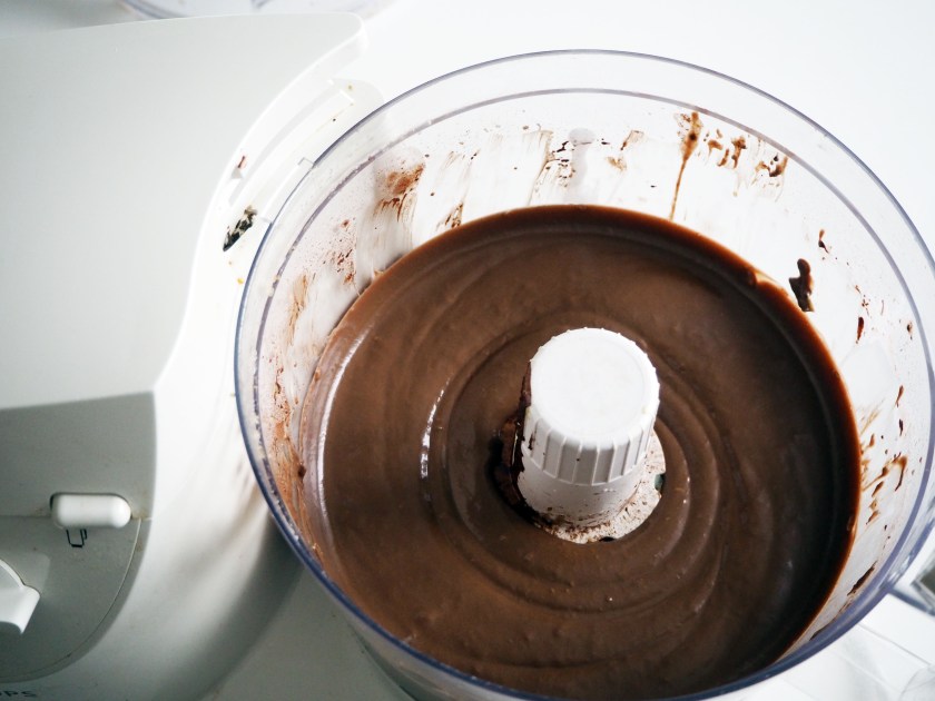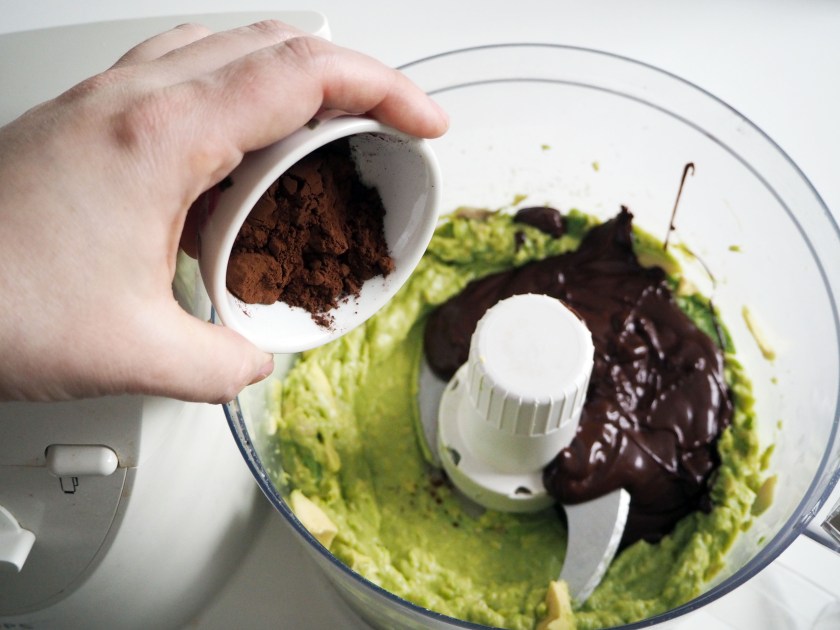 3. Add melted chocolate, cacao powder, maple syrup and coconut cream and process until you get a smooth creamy mousse.