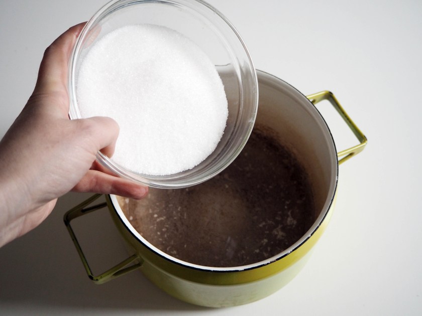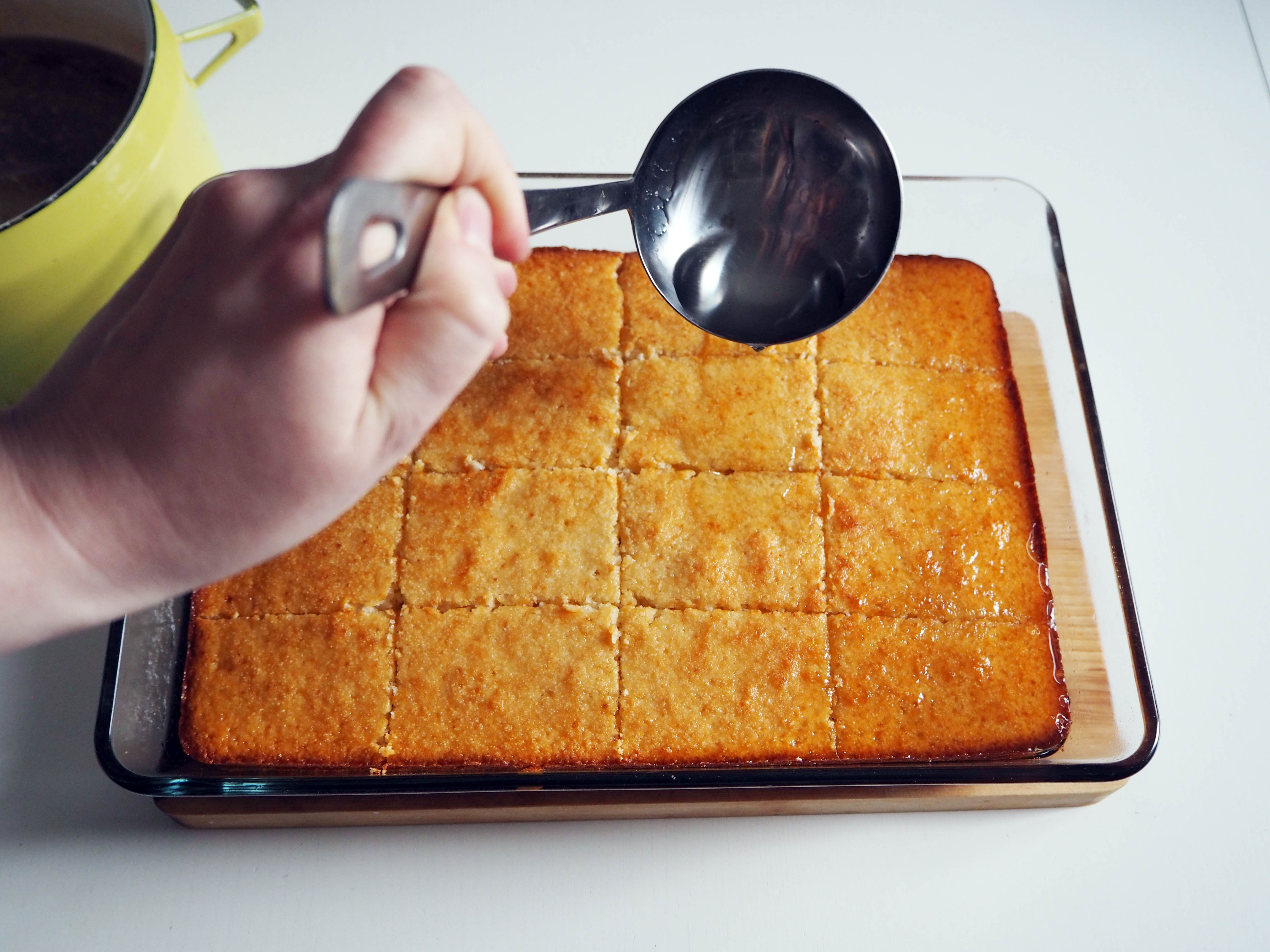 (This amount of syrup makes very moist and sweet dessert. If you want to cut the amount of sweetness, you can make use 5 dl. measurement for both water and sugar instead – keep lemon juice as 1 tsp.)