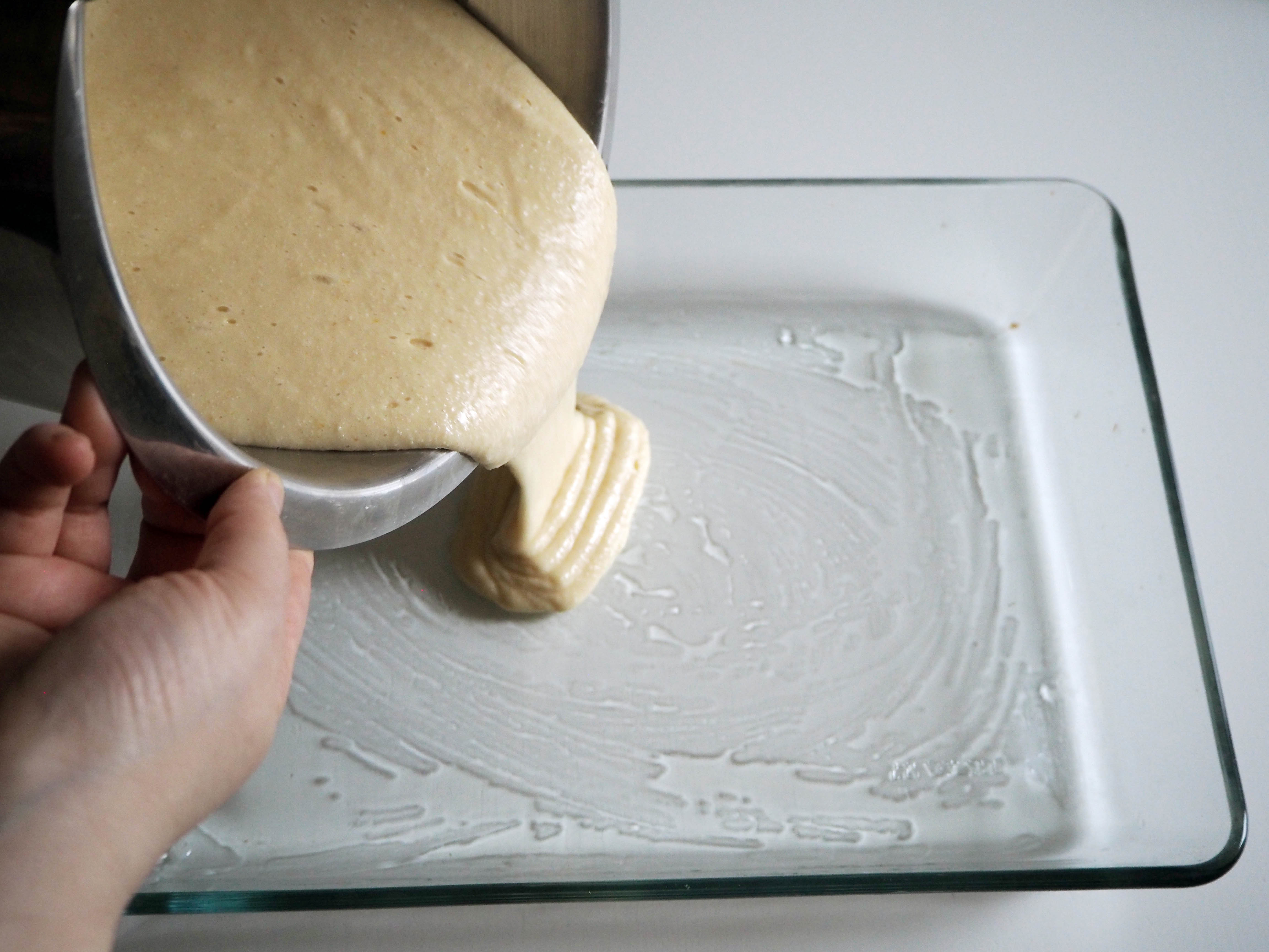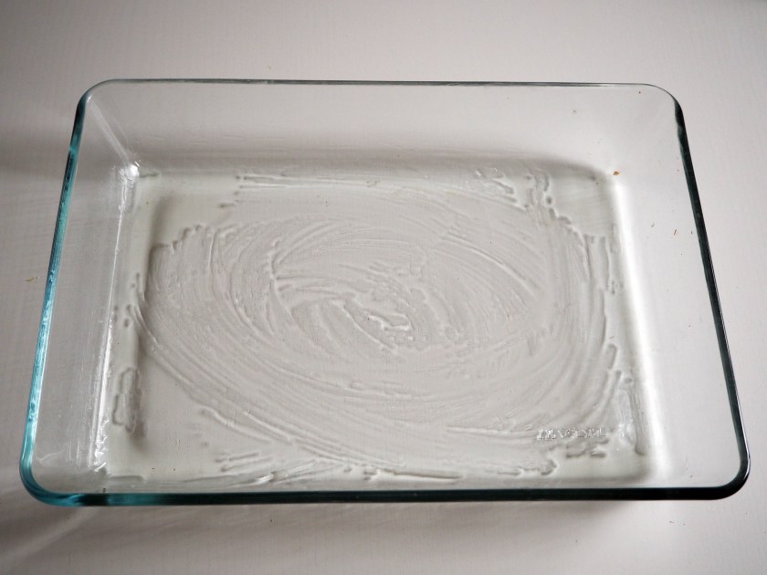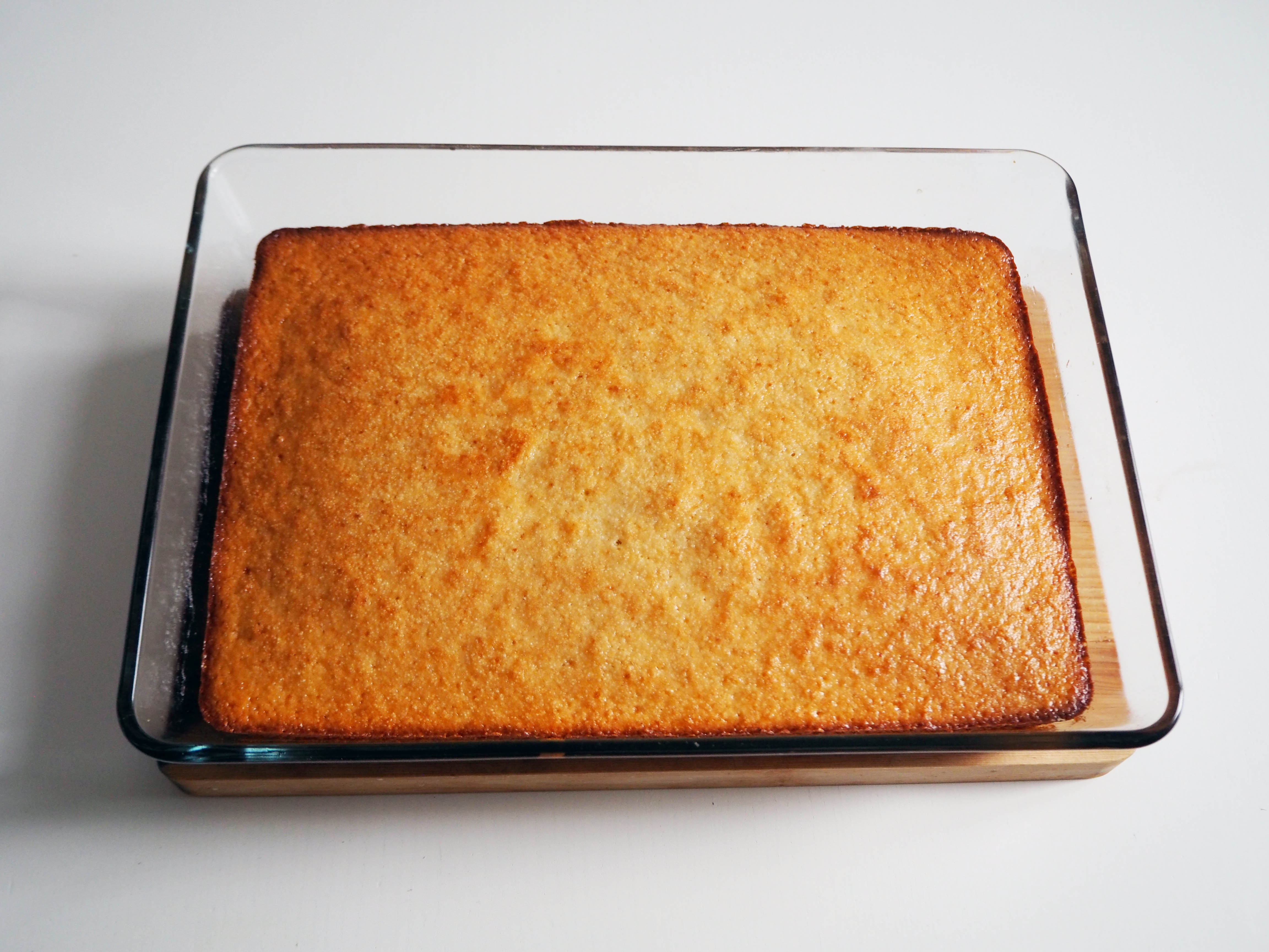2. When you are ready to bake the cake, preheat the oven to 180C and lightly grease (with vegetable oil) your oven dish. Generally, revani is made in rectangular dishes and then cut accordingly, but feel free to use other kind of dishes if you have those available.