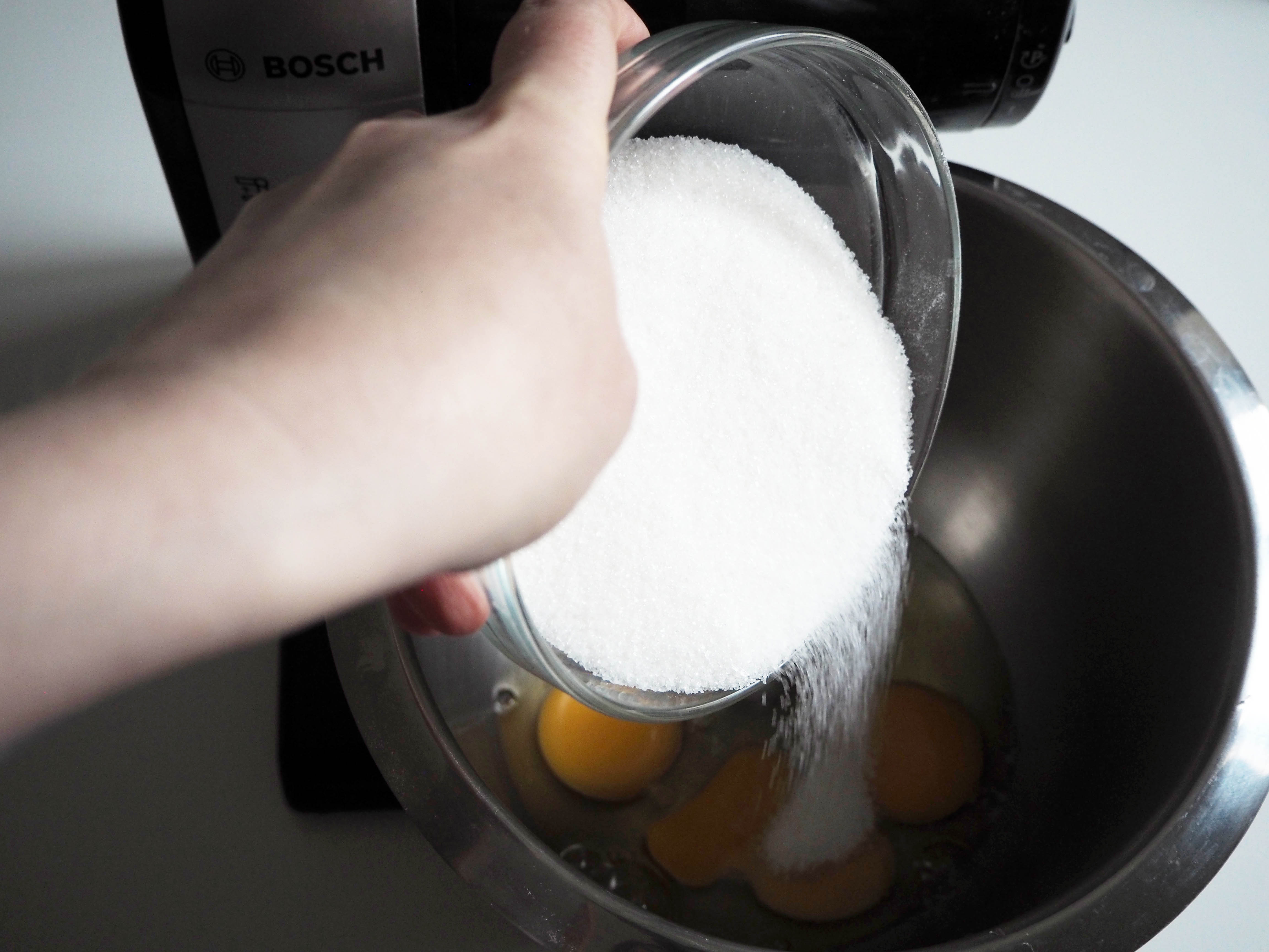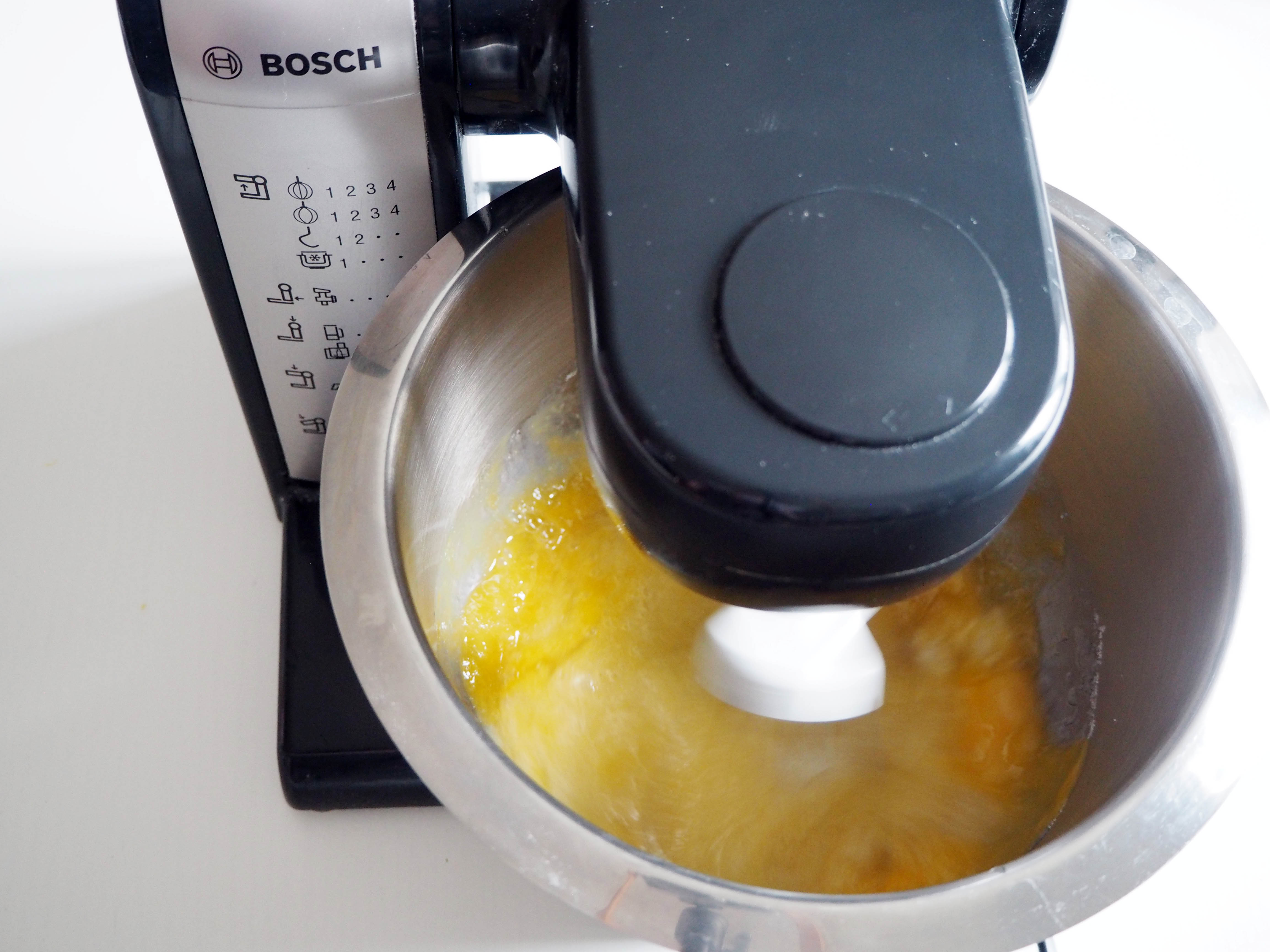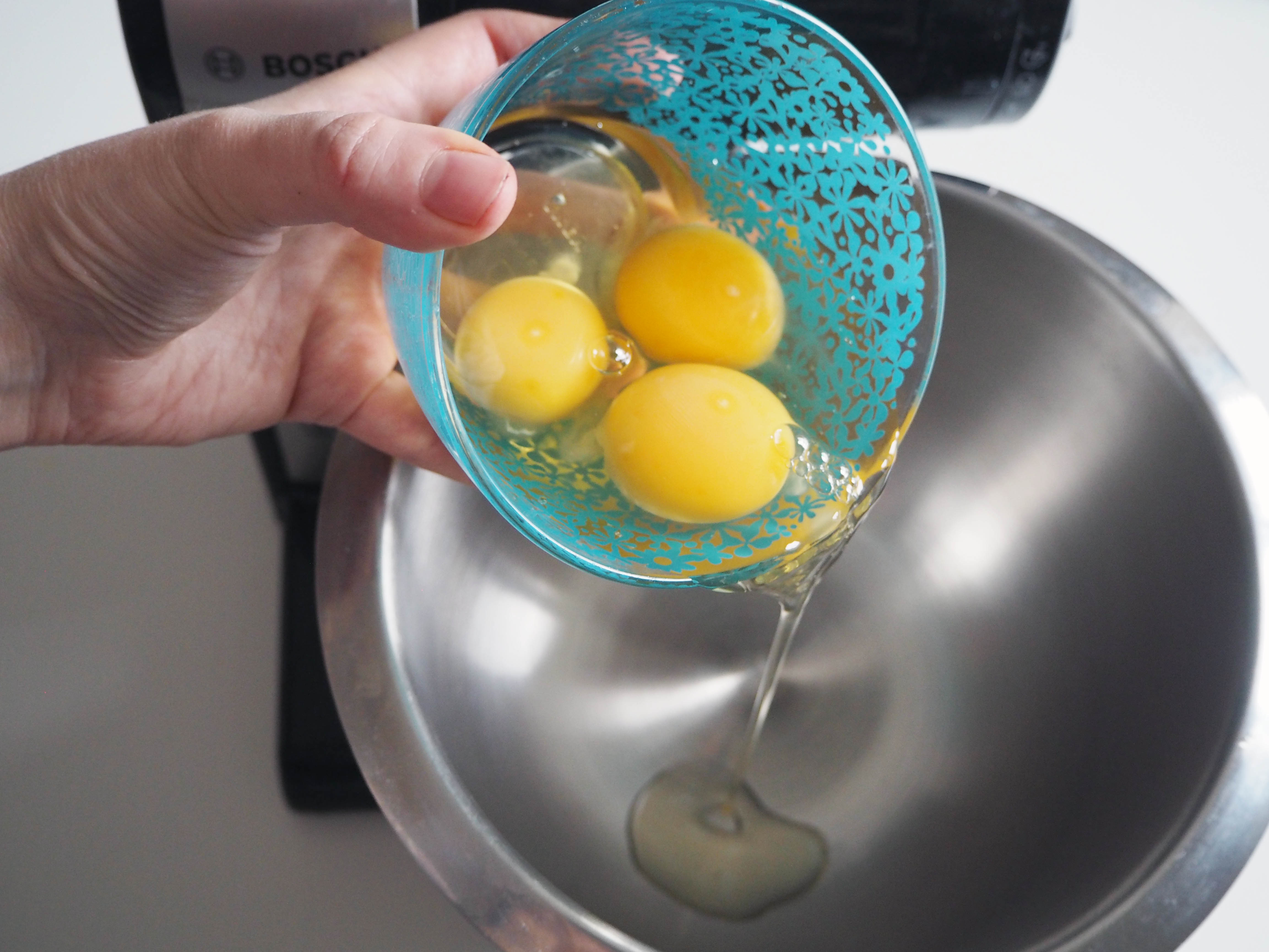 3. In a mixing bowl, put eggs and sugar and beat in medium to high speed for about 5 minutes, until it gets pale and thick, as in the photo.