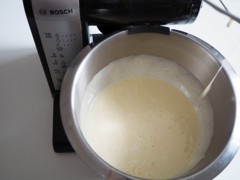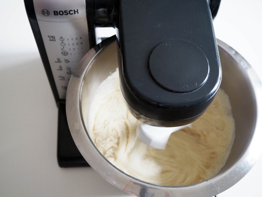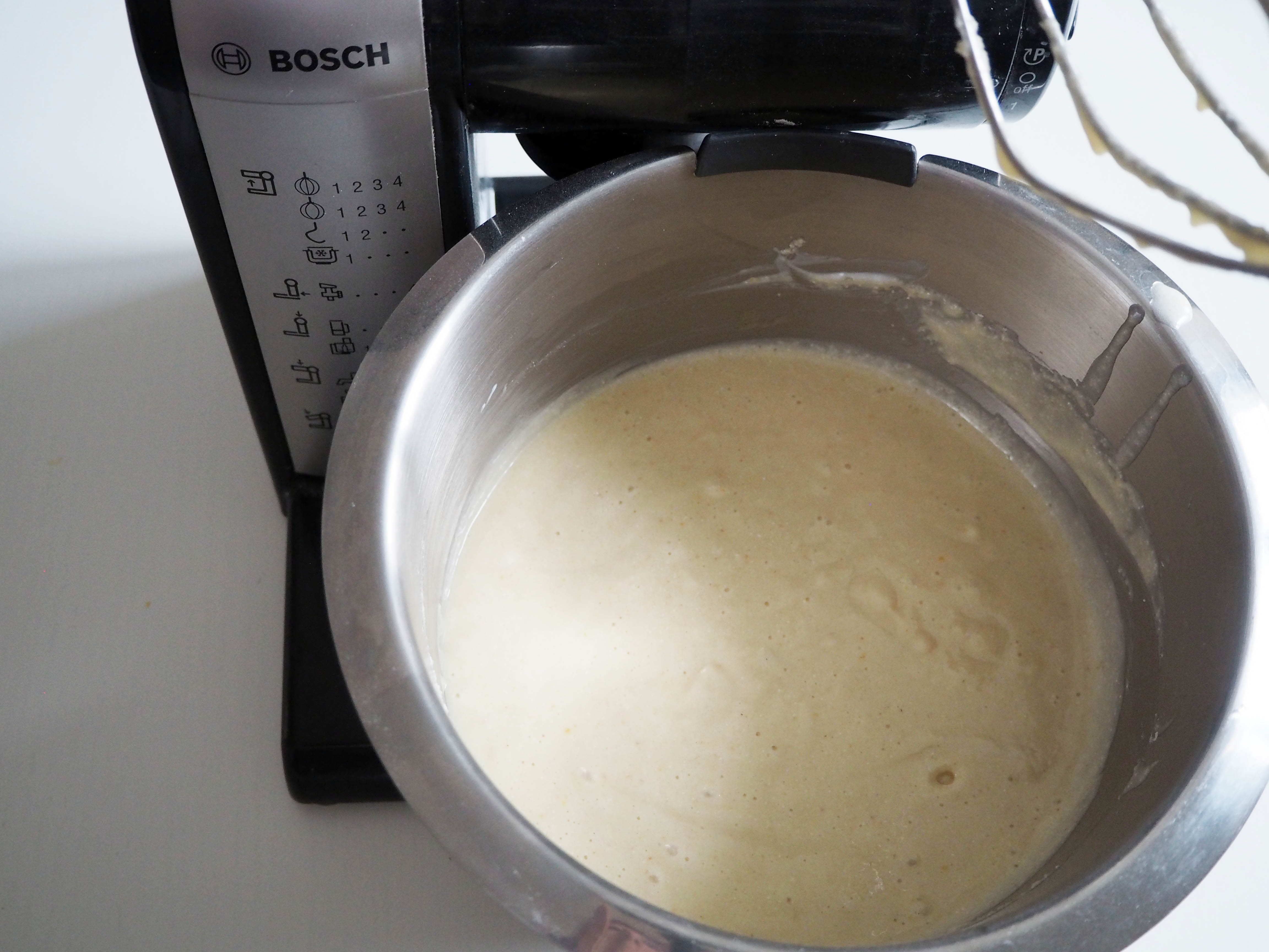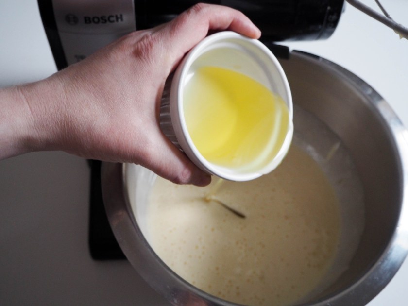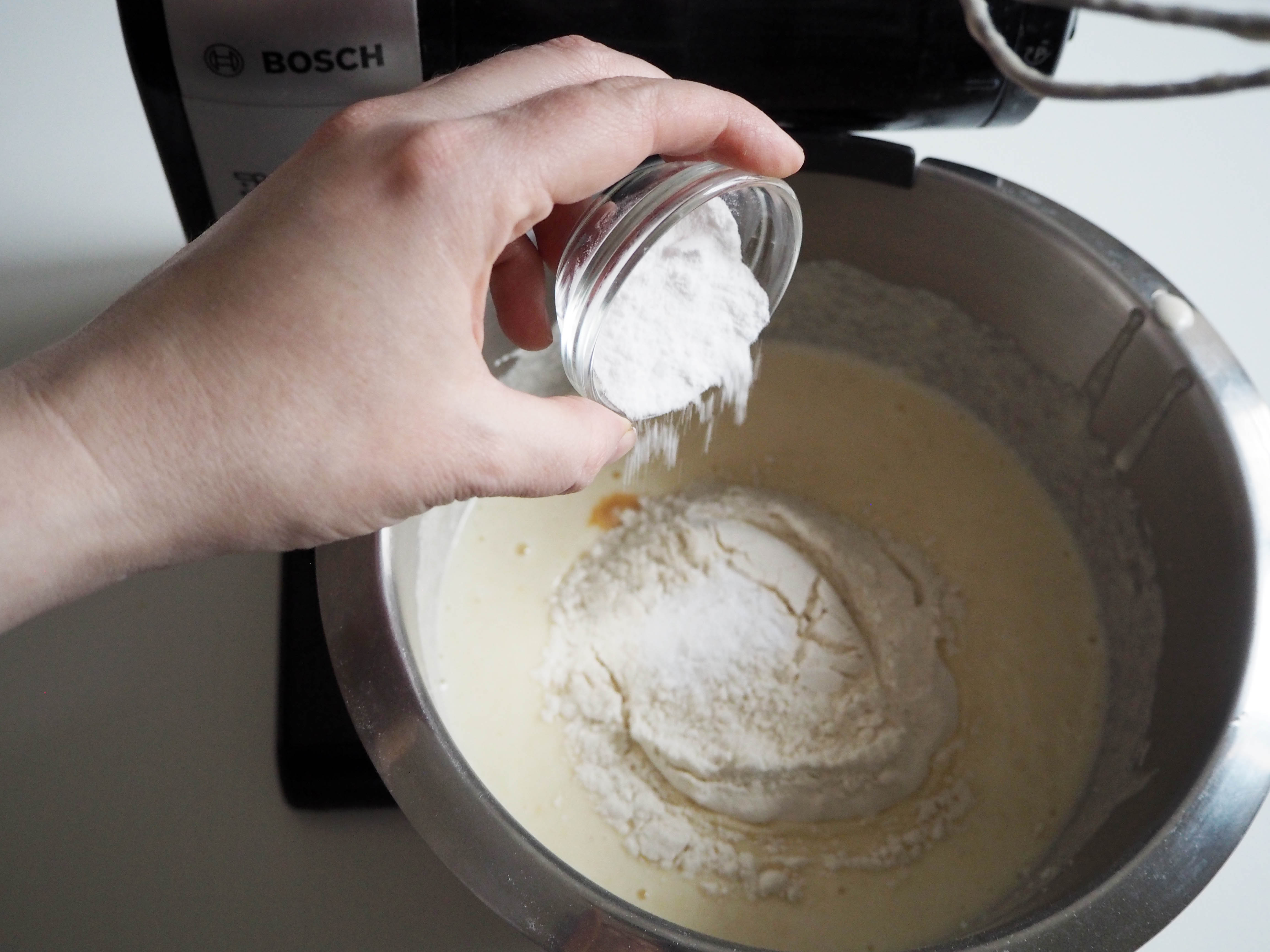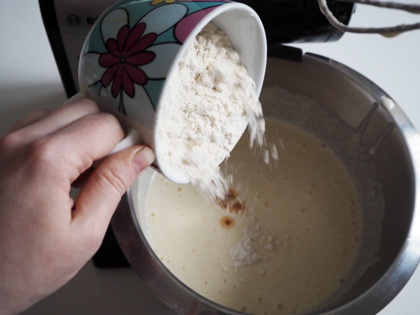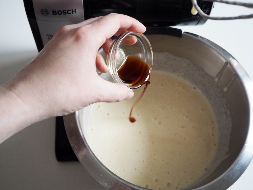 5. Add vanilla extract / vanilla sugar, flour and baking powder and continue beating until you get a smooth cake batter.