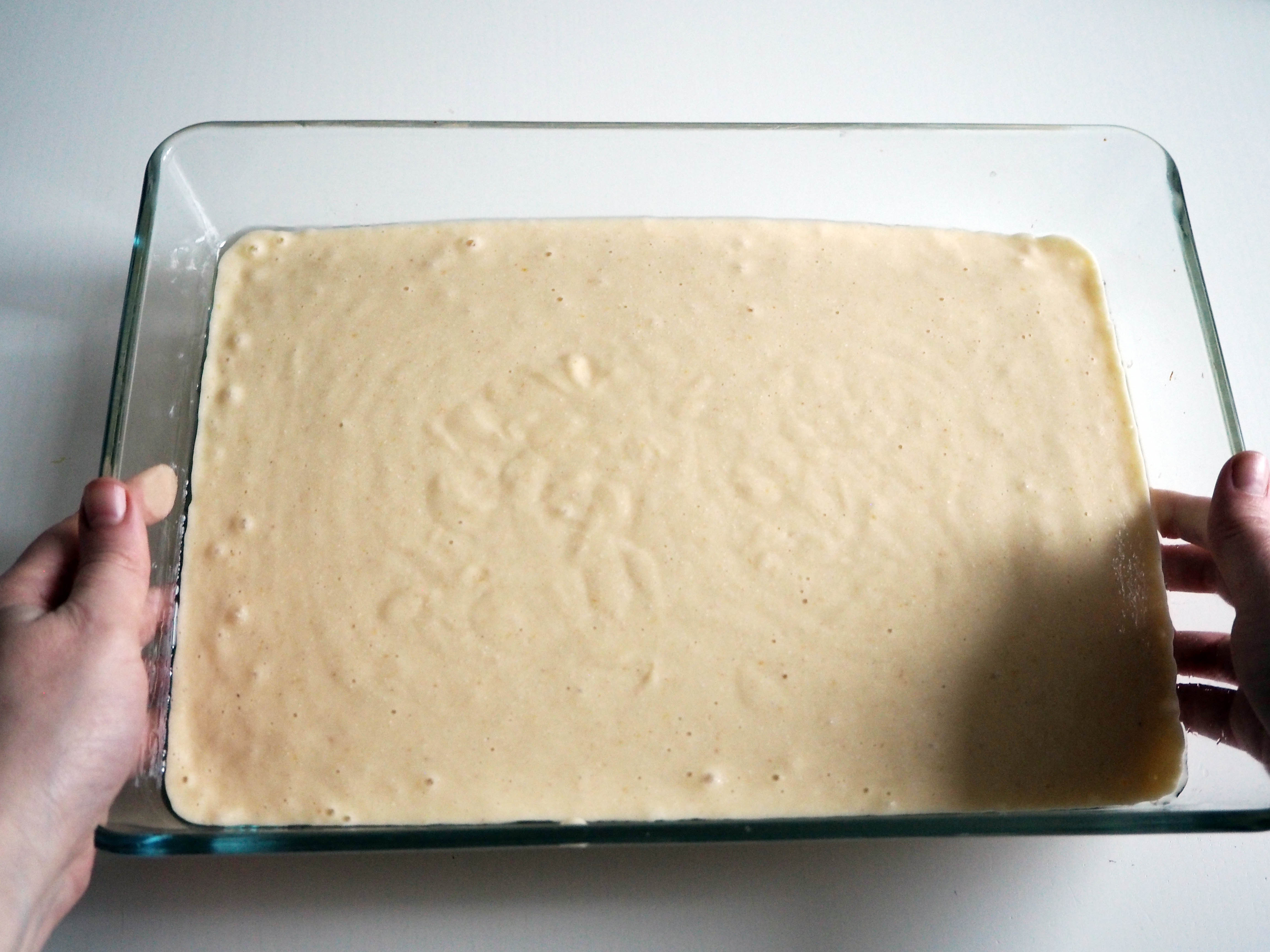 6. Pour the batter in the oven dish and tap a few times on the counter to take away trapped air if any. Put the dish in the oven, in medium rack and bake for 30 minutes. In order to have a uniformly baked cake, I baked like this: for the first 20 minutes, in medium rack, then for the final 10 minutes, on top rack. This may be different in your oven, so just check how it is doing after the first 20 minutes and change it to top rack like me, if you need to.