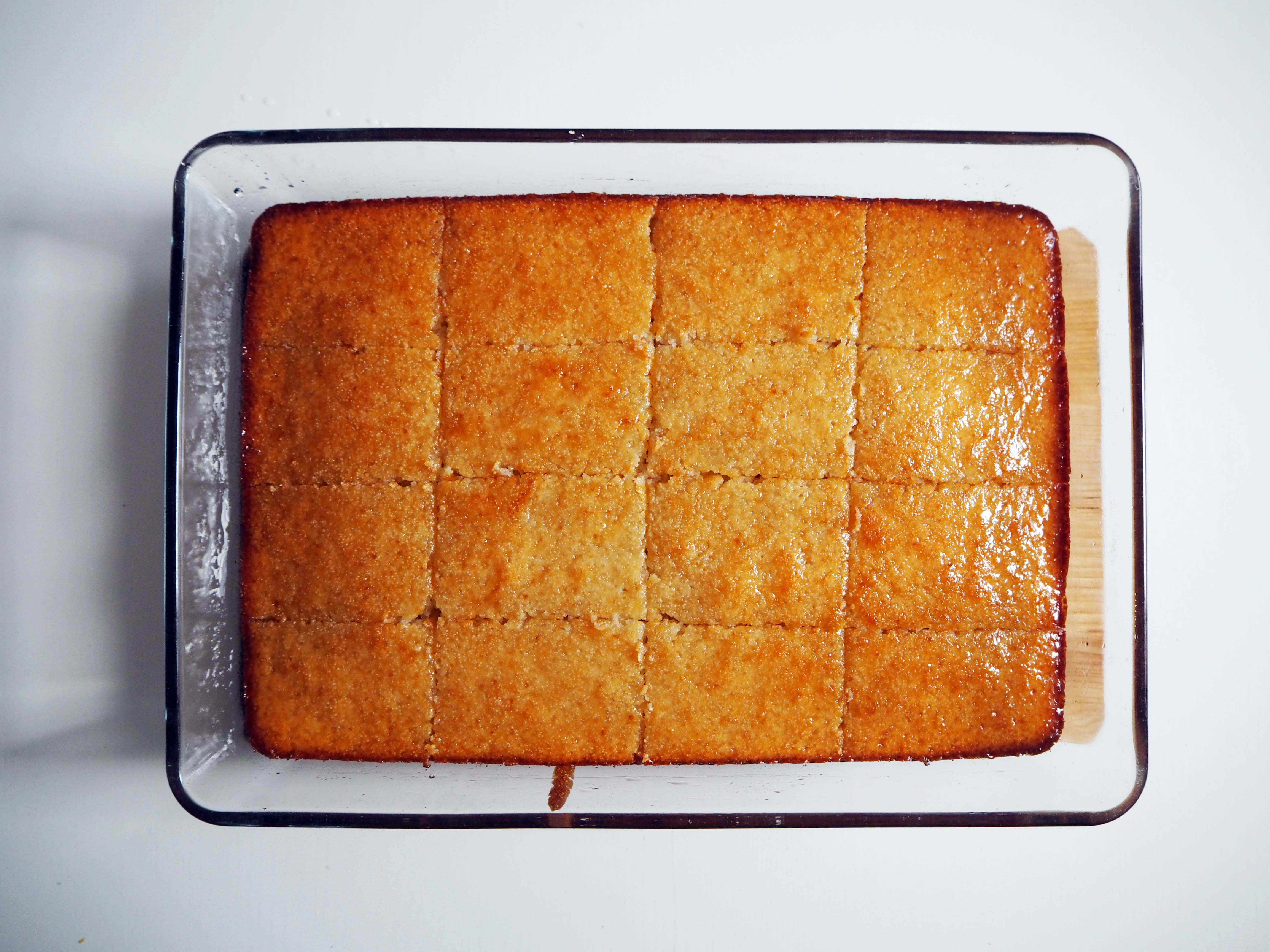 7. When your cake is baked and is out of the oven, let it cool for 10 minutes. Then slice it as you wish and pour cool syrup on top. Let the dessert rest like that inside the dish for 2 hours before serving. Serve with desiccated coconut or ground pistachios (or other kinds of nuts) if you wish. Enjoy!