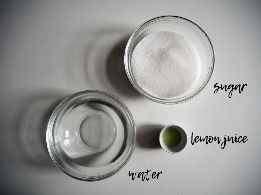 1. First prepare the syrup (about a couple of hours beforehand). In a medium pan, put water and sugar and whisk a little. Put on medium high heat and bring it a boil. Continue boiling for about 5 minutes, then add lemon juice. Boil for 3-5 more minutes and then take away from heat. Set aside to cool down completely.