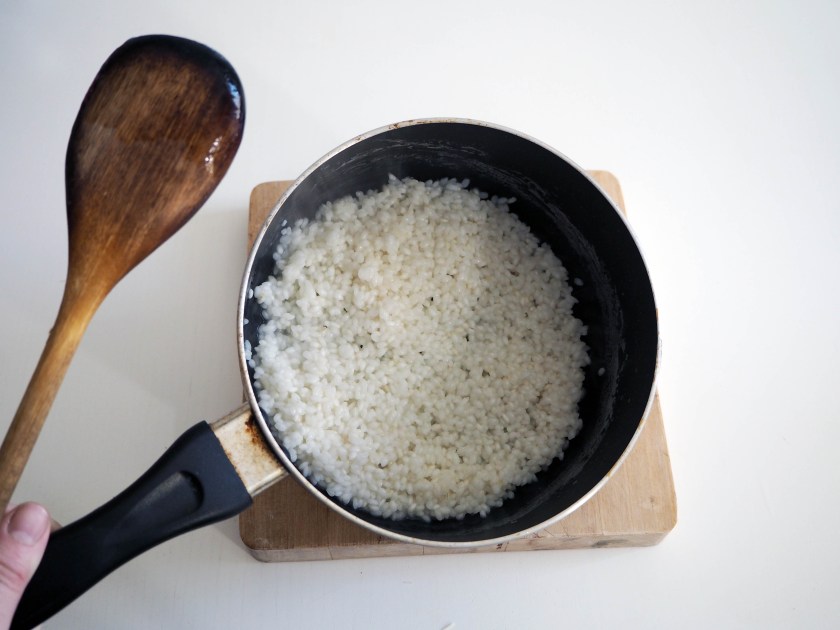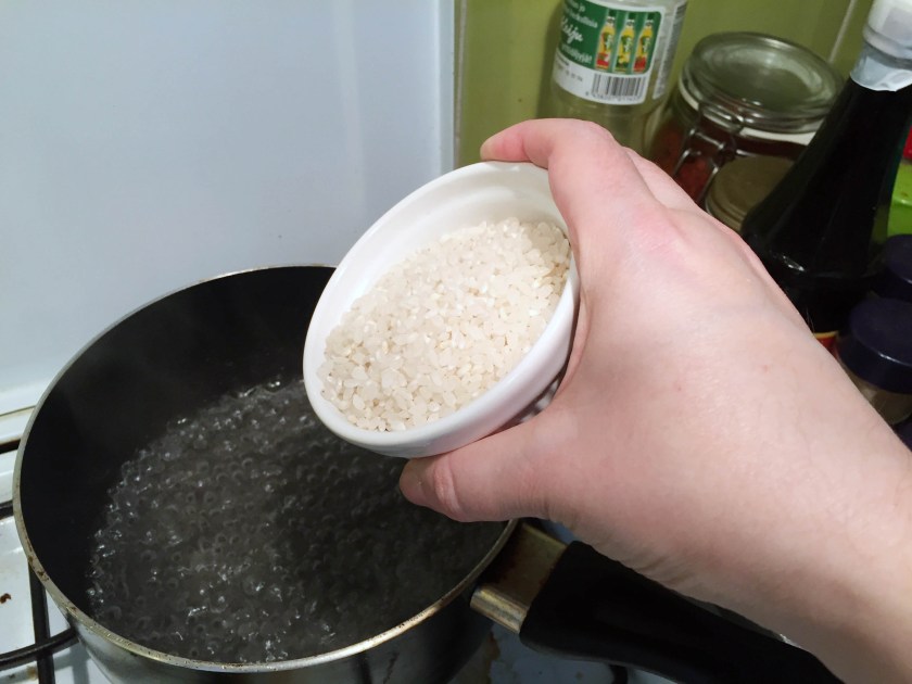 2. In a medium pan, put water and 1/2 tsp salt, stir a little and put on medium high heat. When it starts boiling, put rice and cook on medium heat just until the rice absorbs almost all the water. Take away from the heat and put aside.
